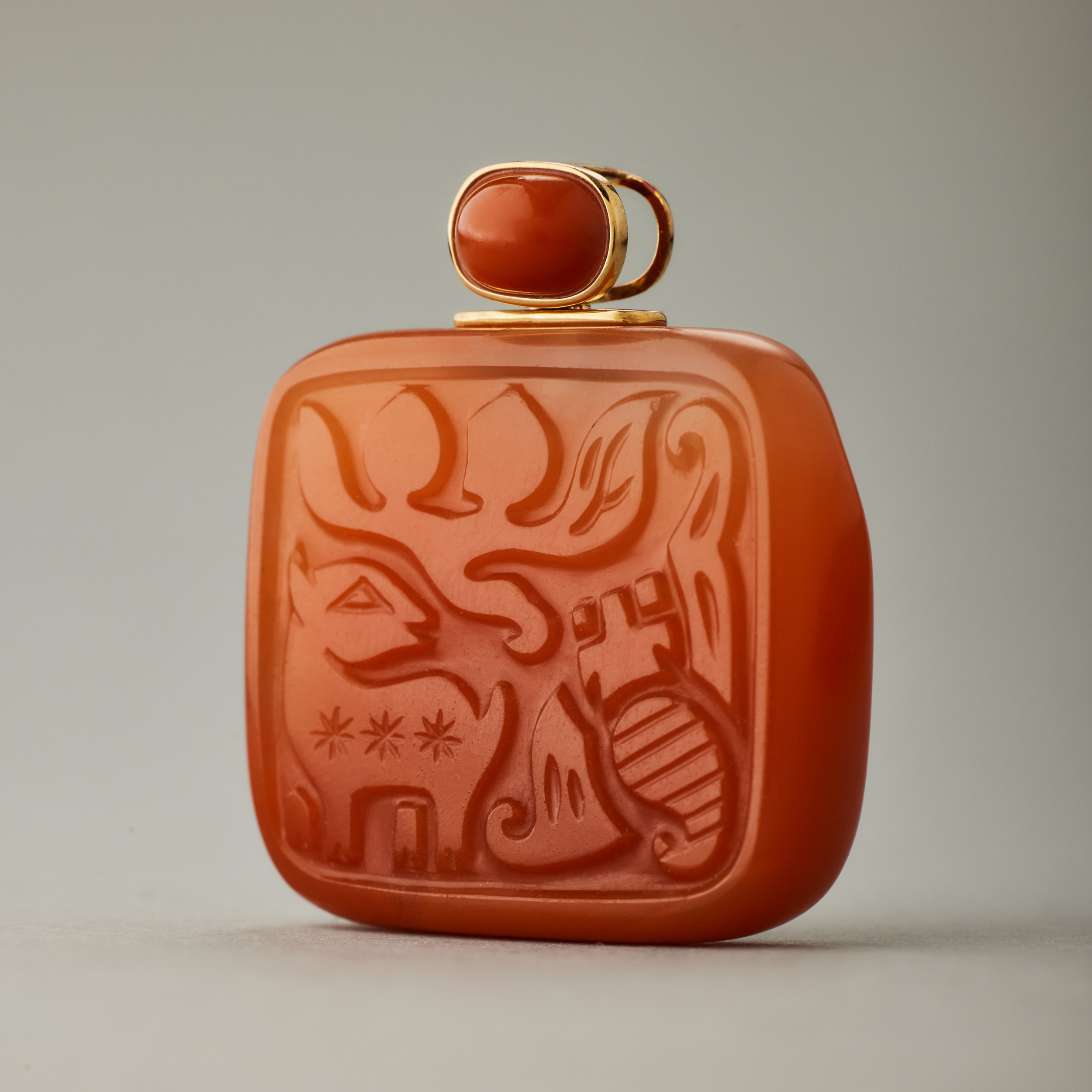 选用上等原料手工雕刻,延续传统题材,以蝙蝠、小鹿和寿桃的形象,谐音福禄寿三位神祇