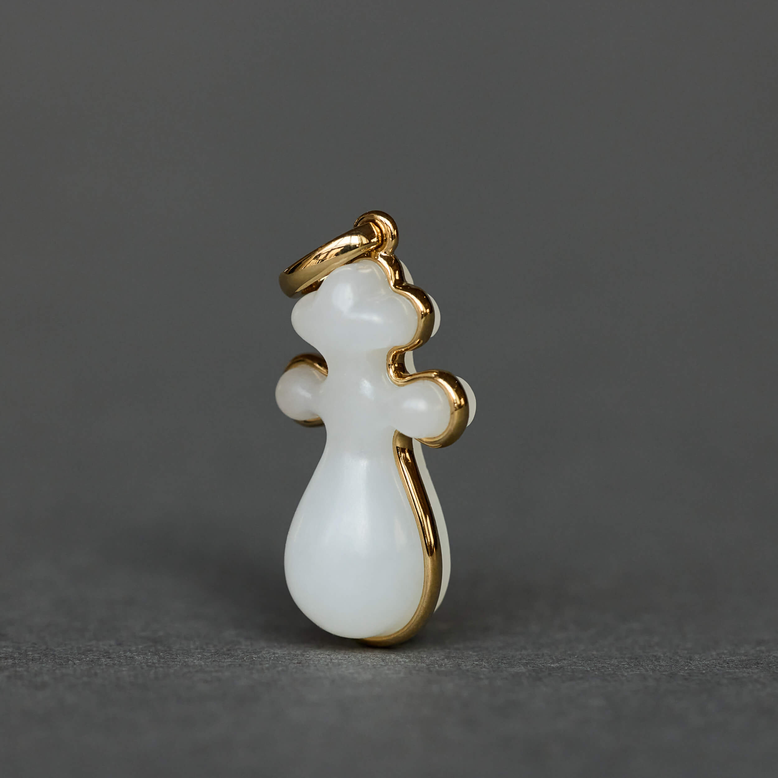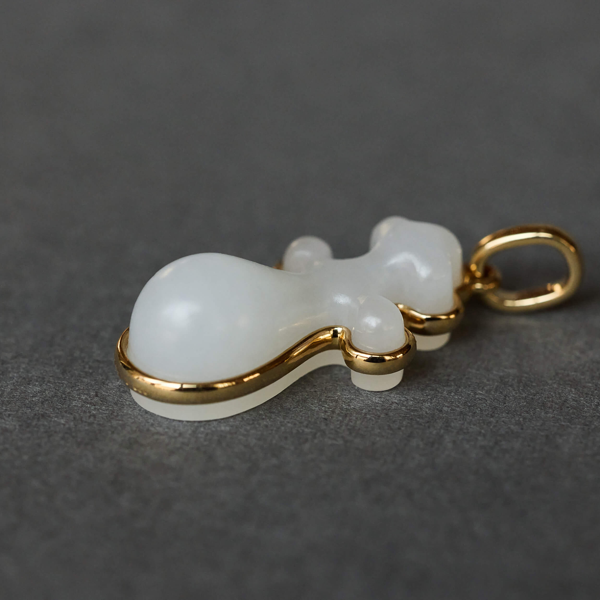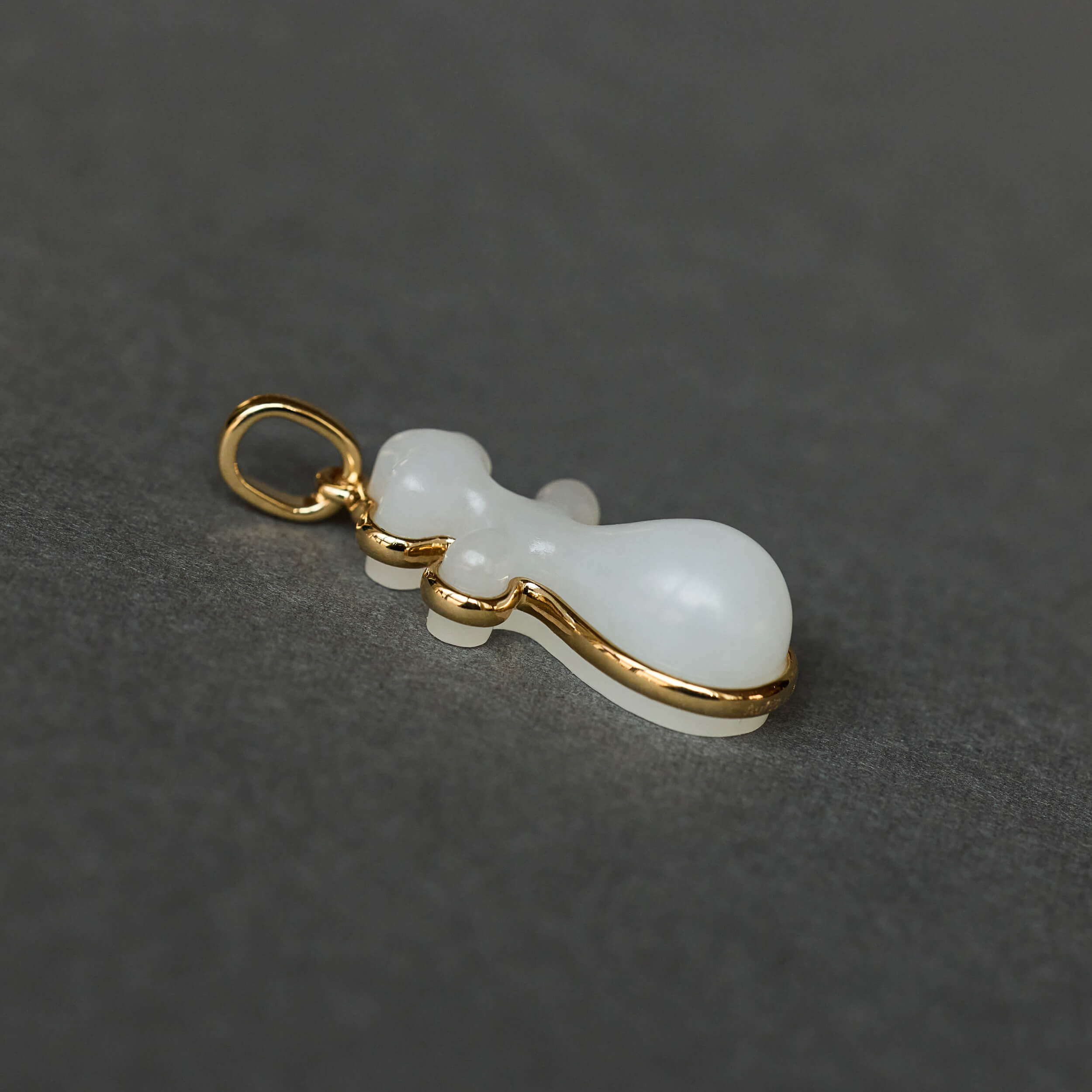 选用上等和田白玉手工雕刻,小小一颗琵琶,灵秀活泼、凹凸有致。三个维度上的曲线彼此相接想成,既要流畅自然,又要对称规整,实为匠人技艺的高难挑战
