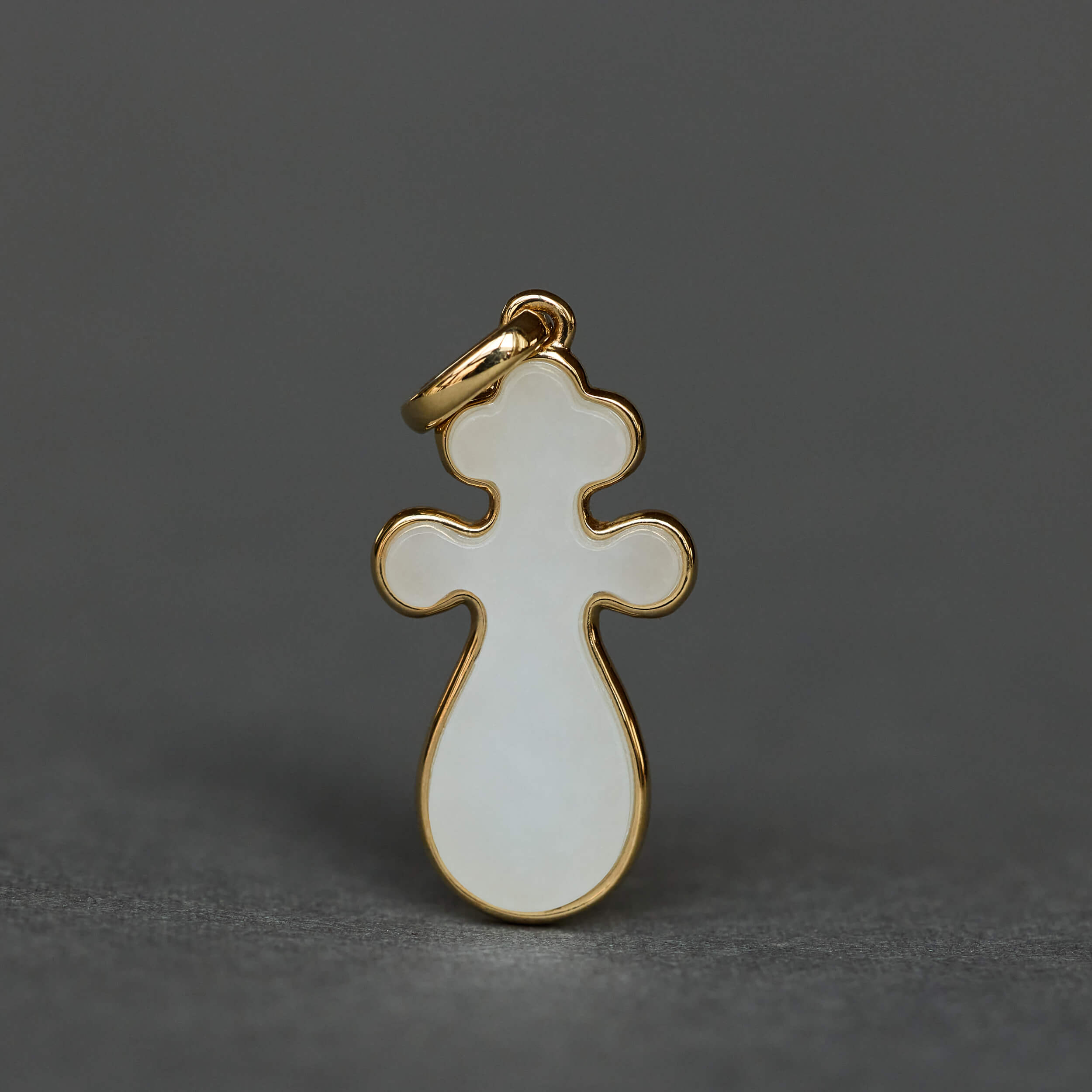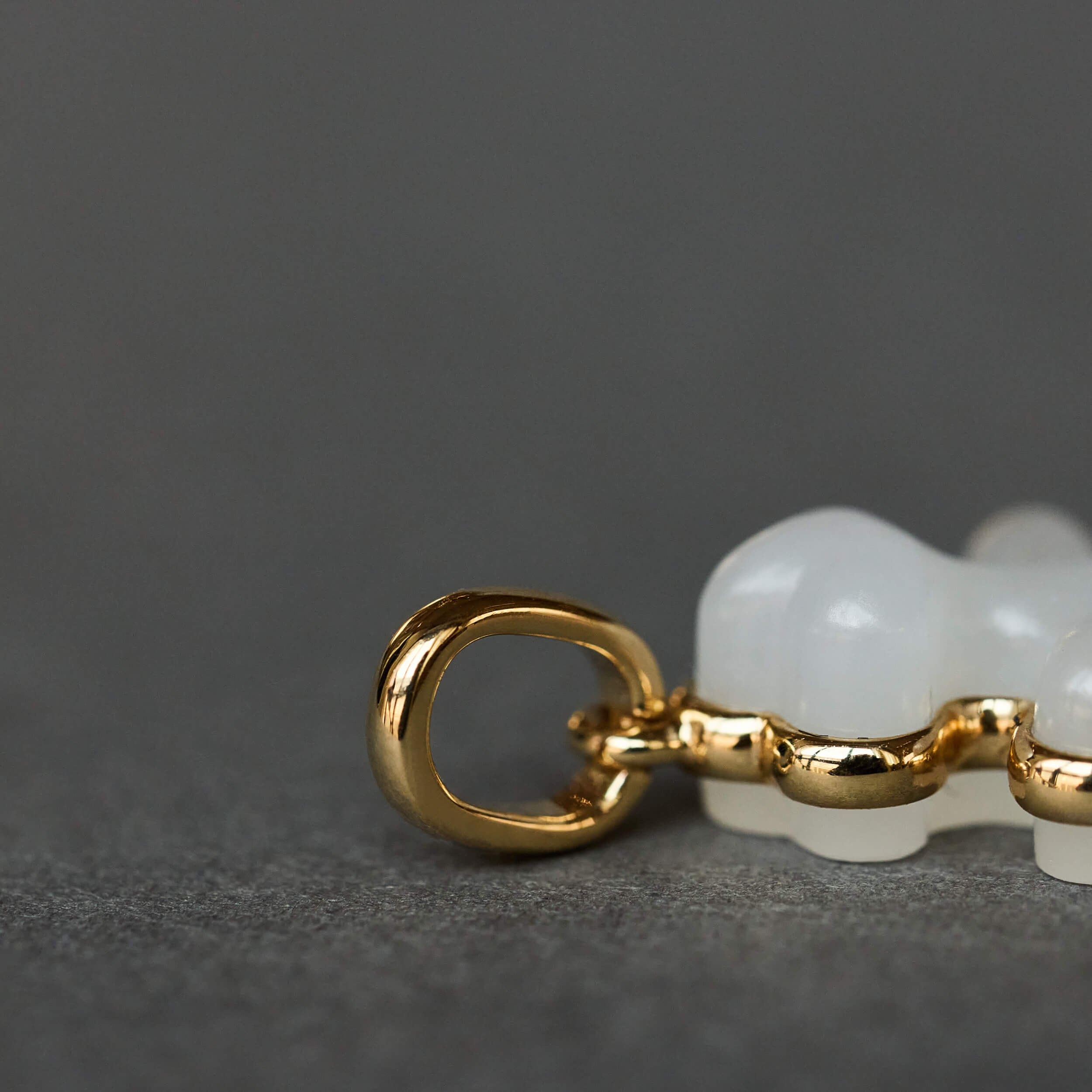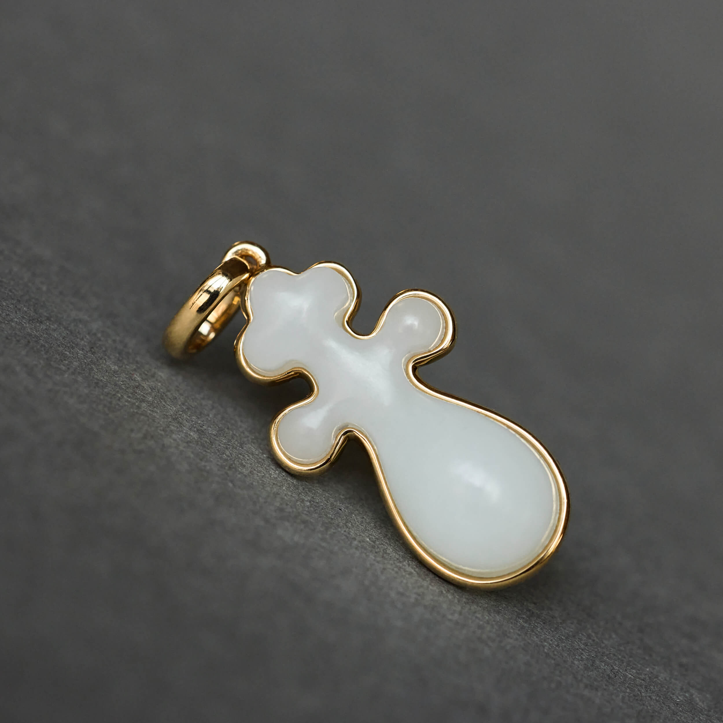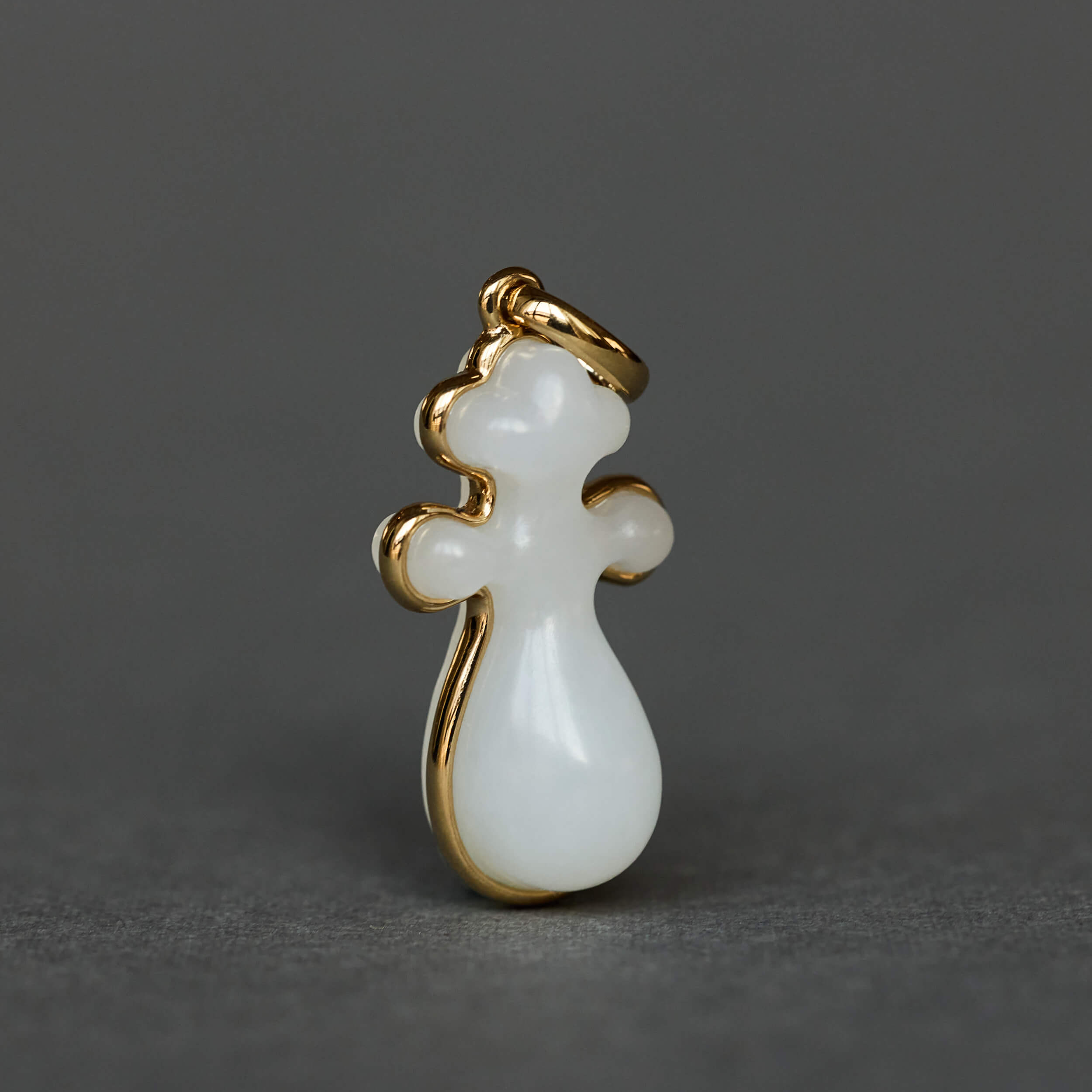 选用上等和田白玉手工雕刻,小小一颗琵琶,灵秀活泼、凹凸有致。三个维度上的曲线彼此相接想成,既要流畅自然,又要对称规整,实为匠人技艺的高难挑战