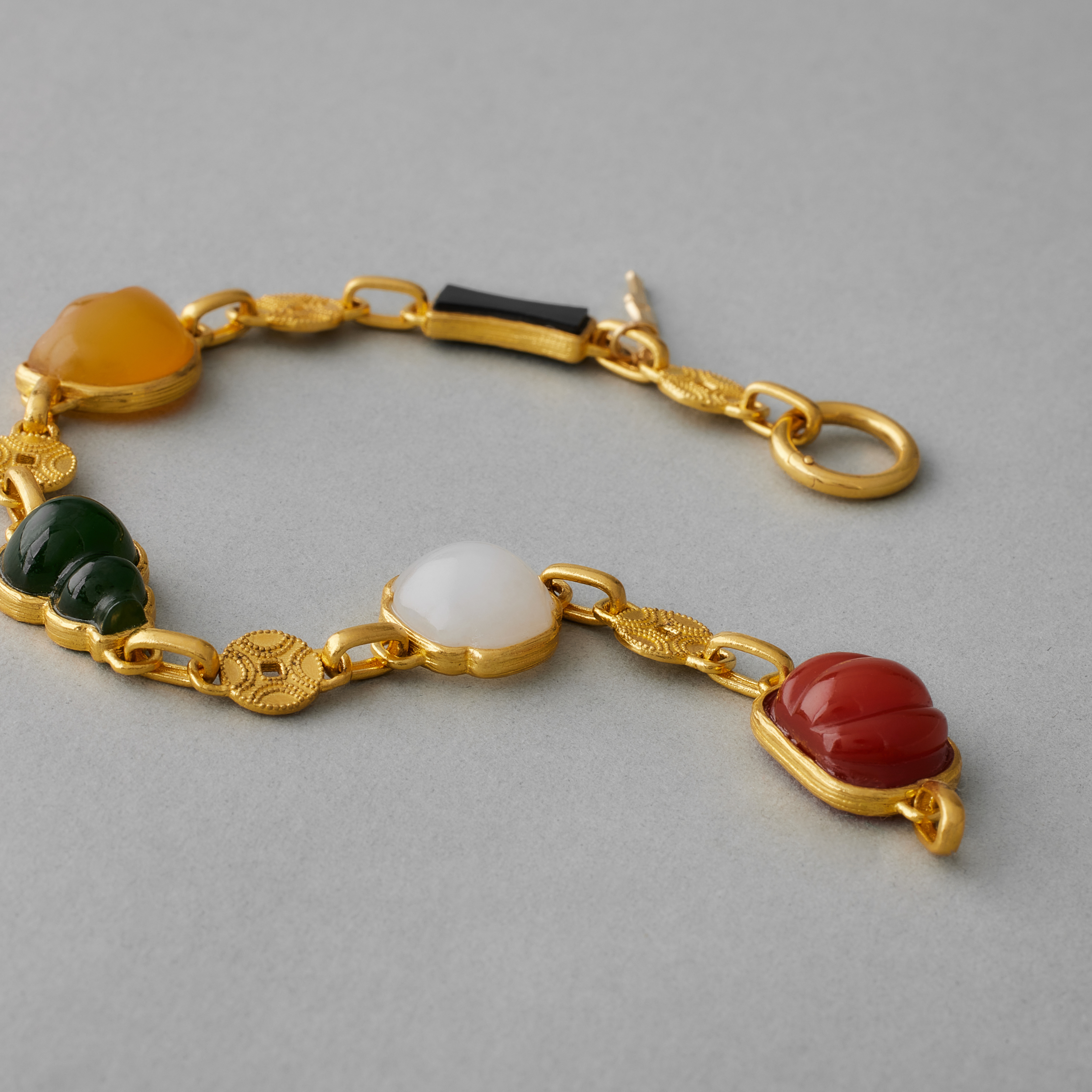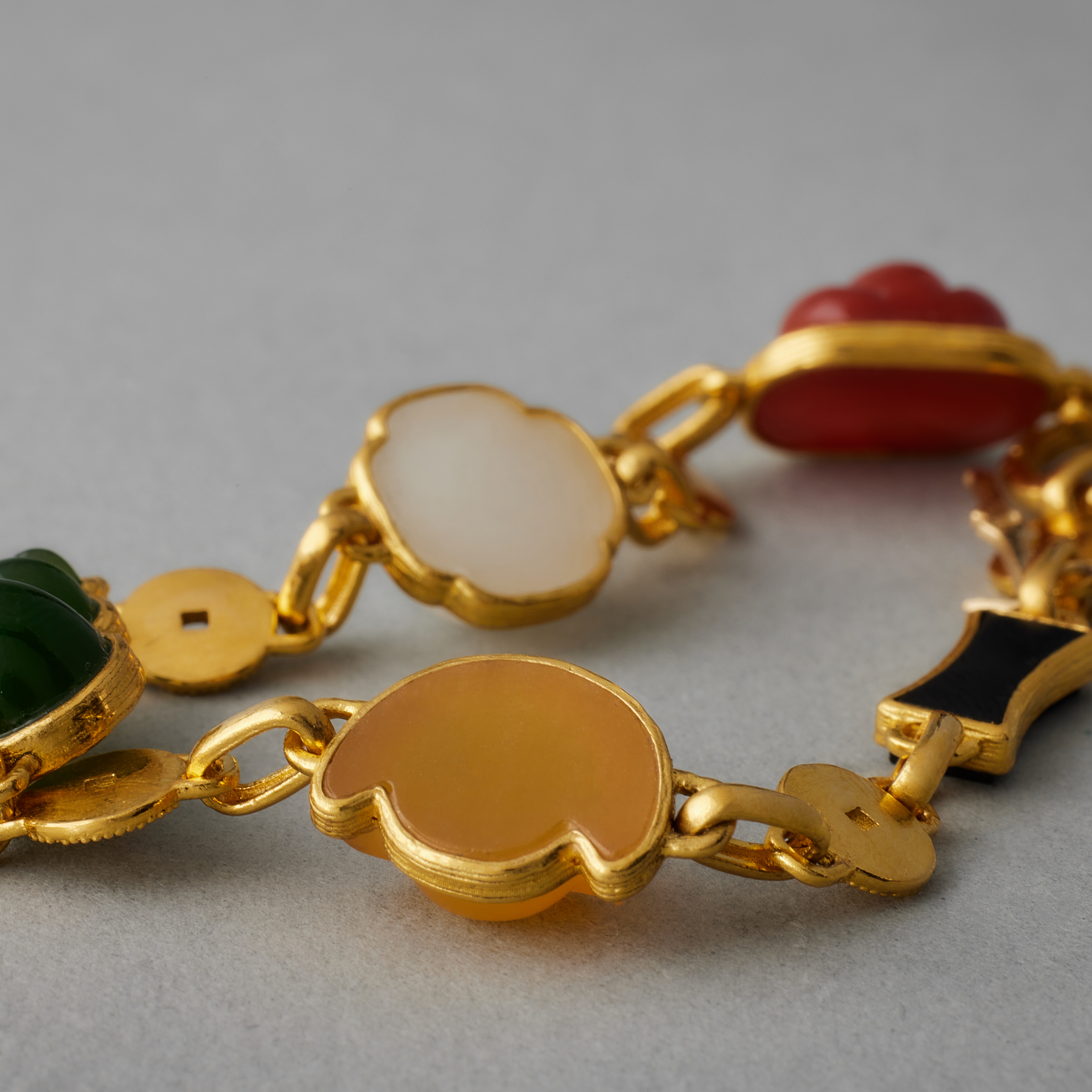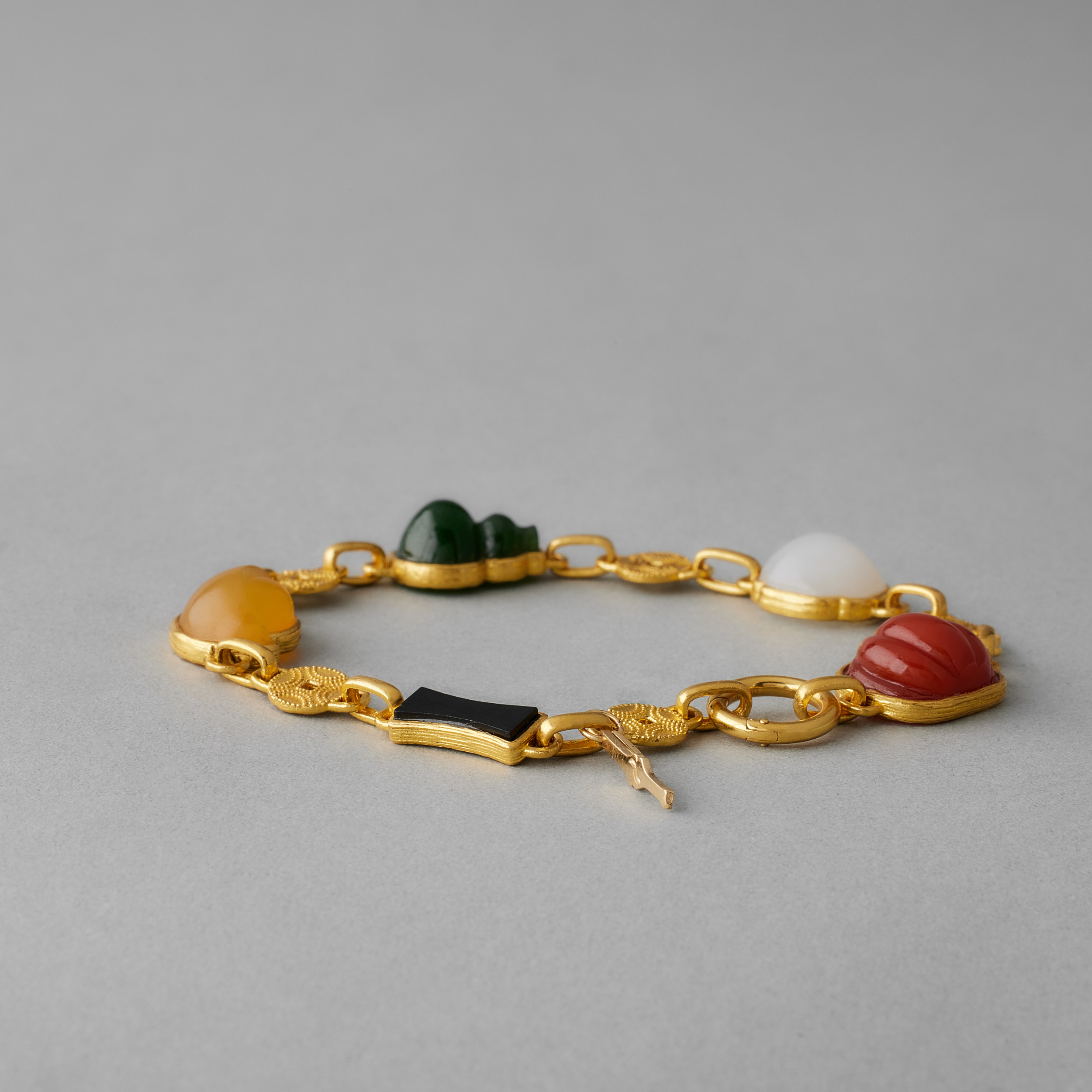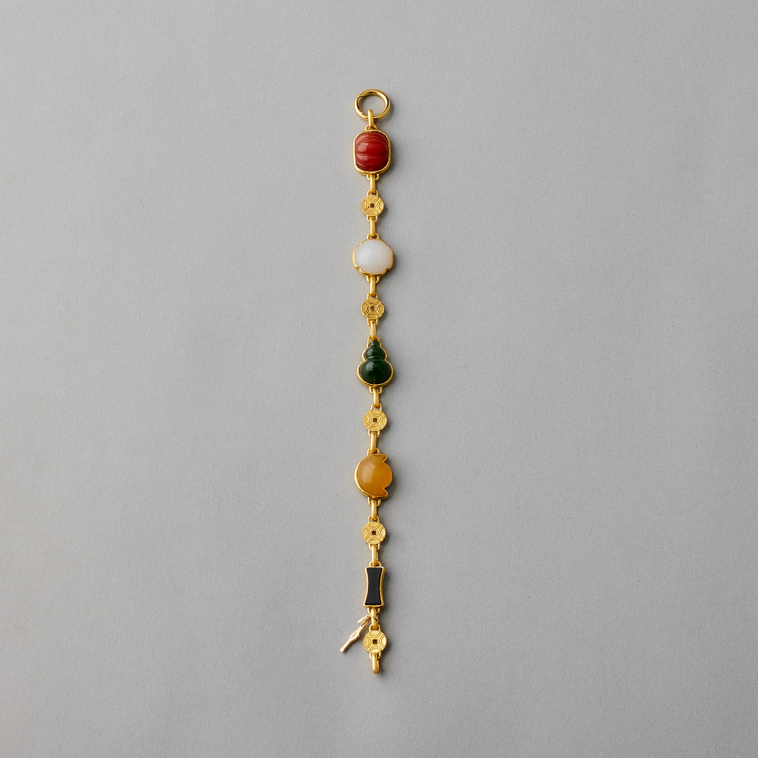精选和田白玉、和田碧玉、和田墨玉、宝山南红和缅甸黄玉,由资深玉雕师操刀,手工雕刻成如意、葫芦、锁栓、南瓜和元宝等造型,五色暗合金、木、水、火、土五行,与五颗金币相连成链