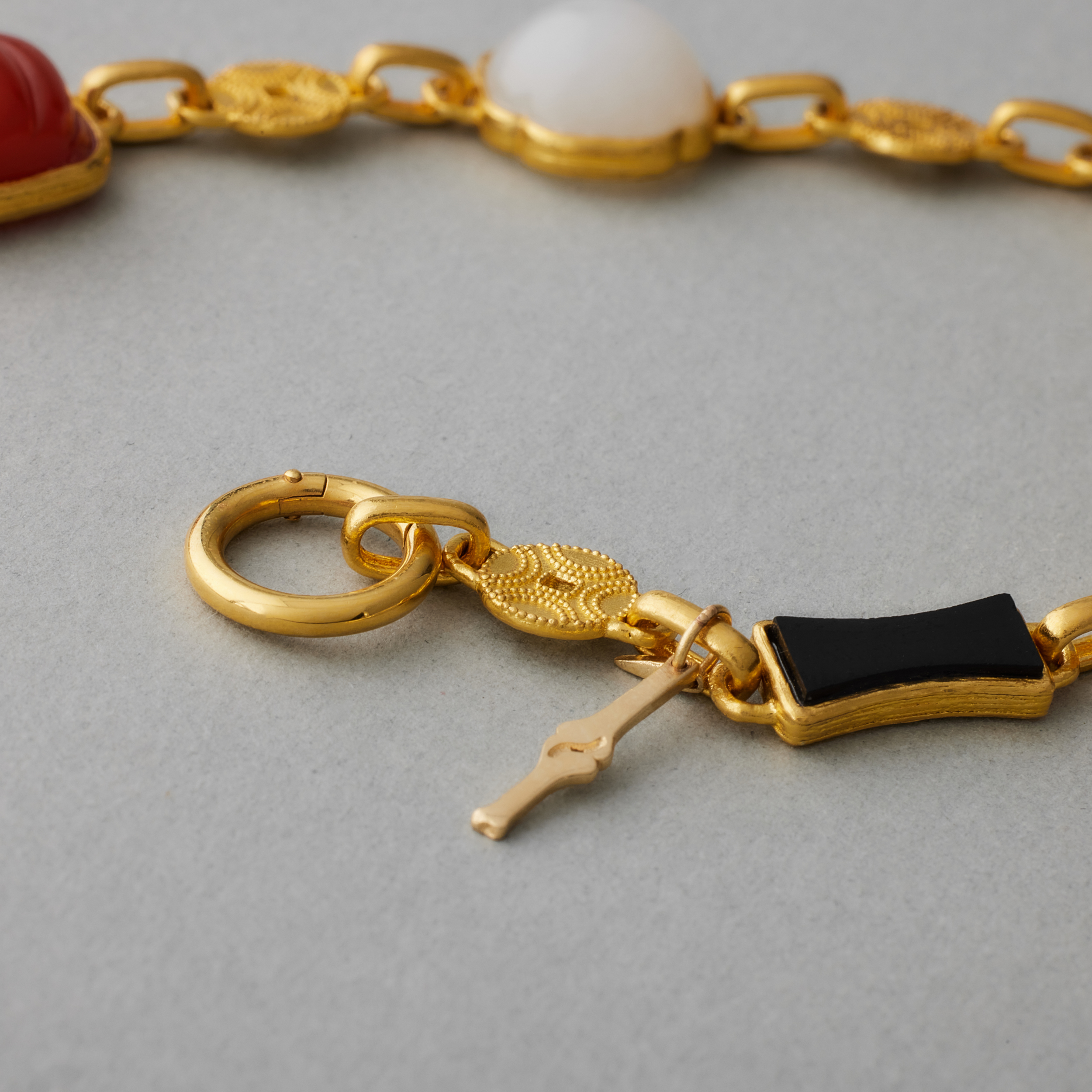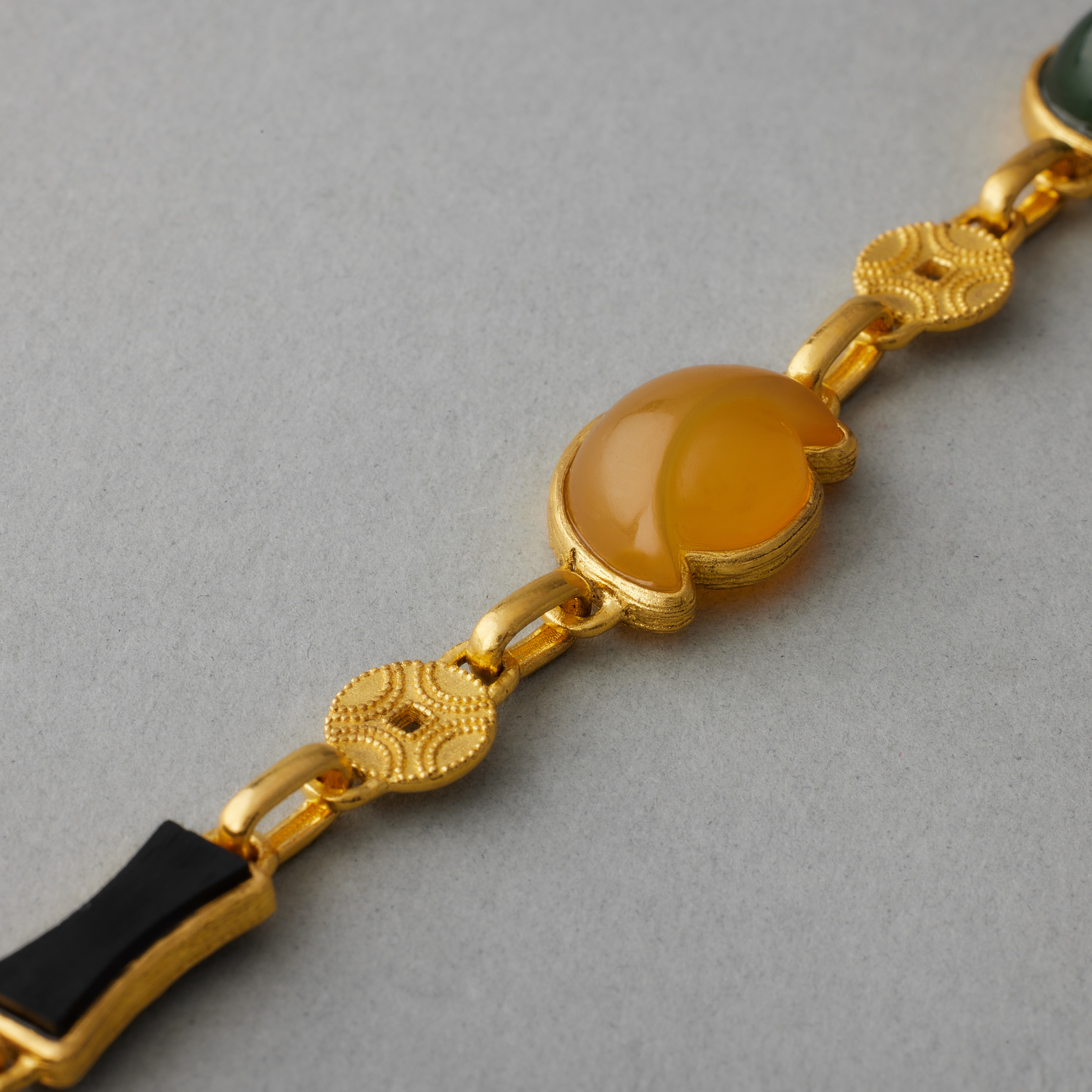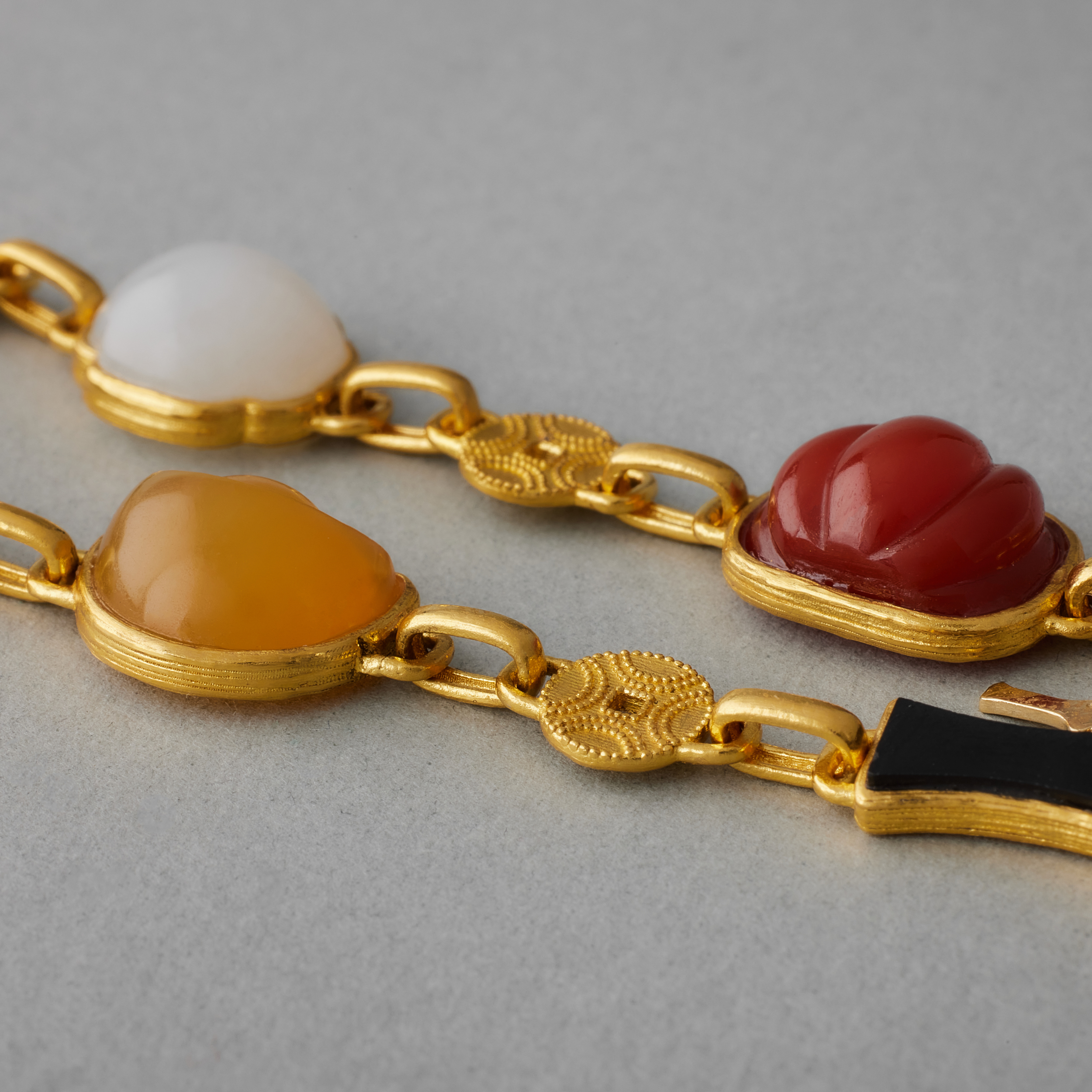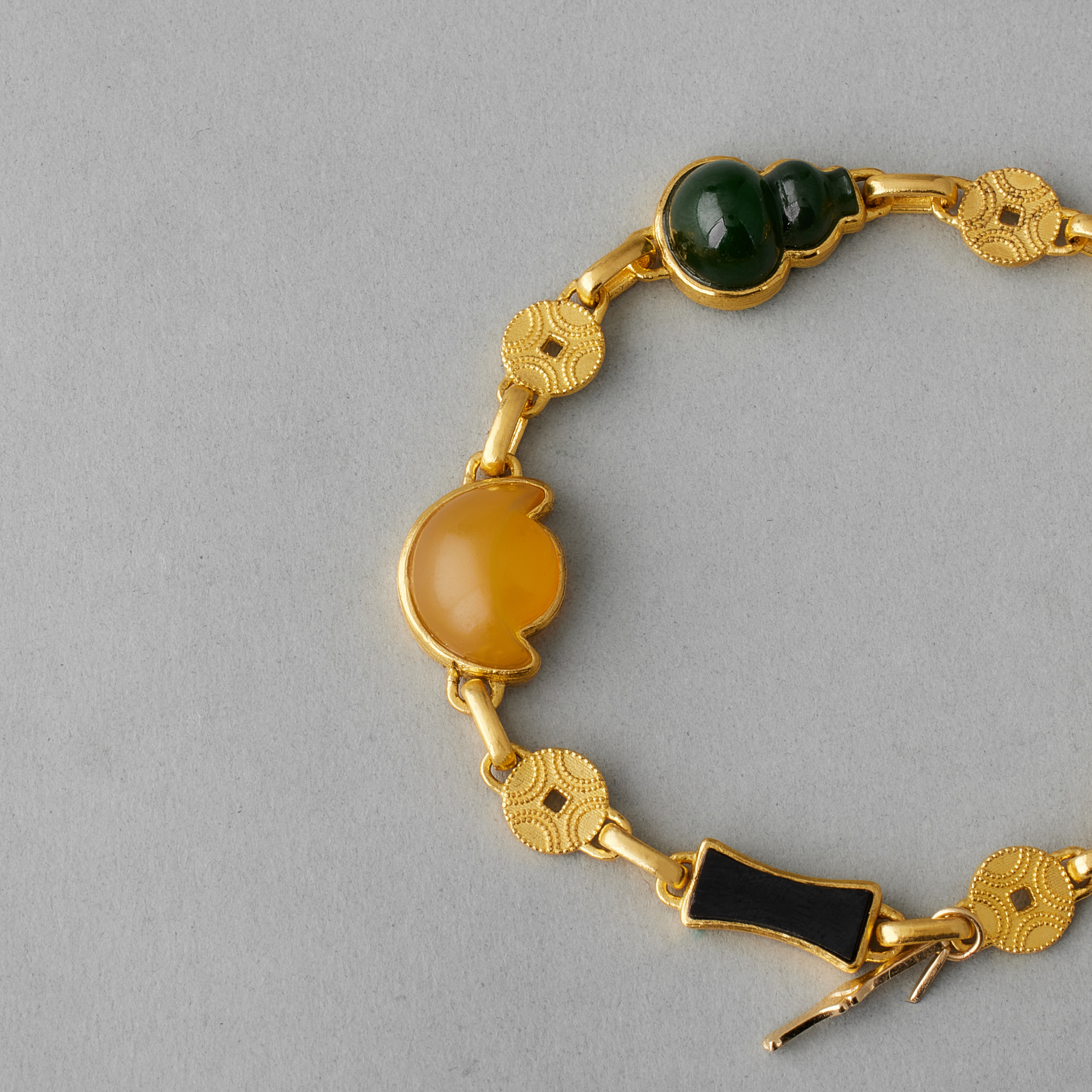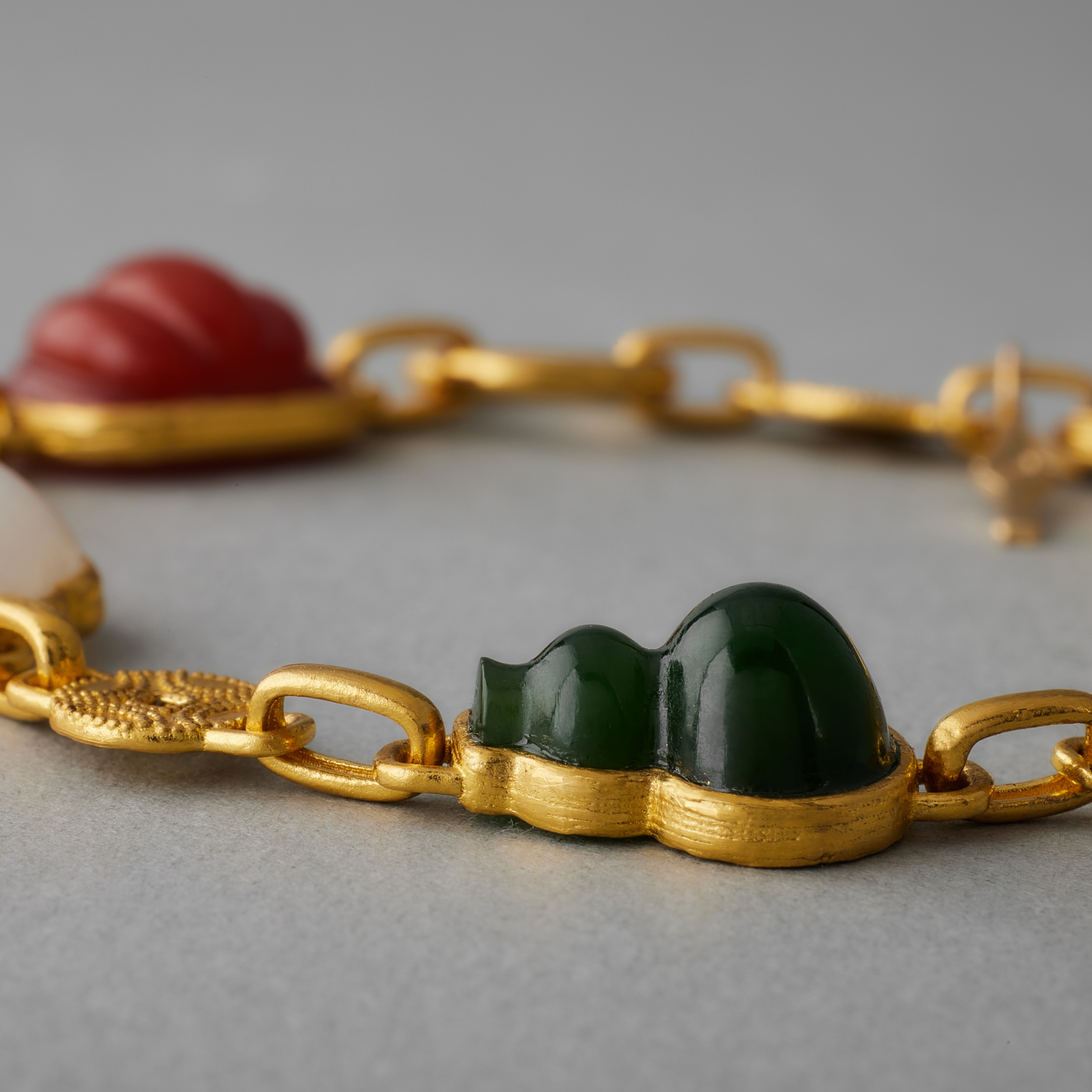 精选和田白玉、和田碧玉、和田墨玉、宝山南红和缅甸黄玉,由资深玉雕师操刀,手工雕刻成如意、葫芦、锁栓、南瓜和元宝等造型,五色暗合金、木、水、火、土五行,与五颗金币相连成链