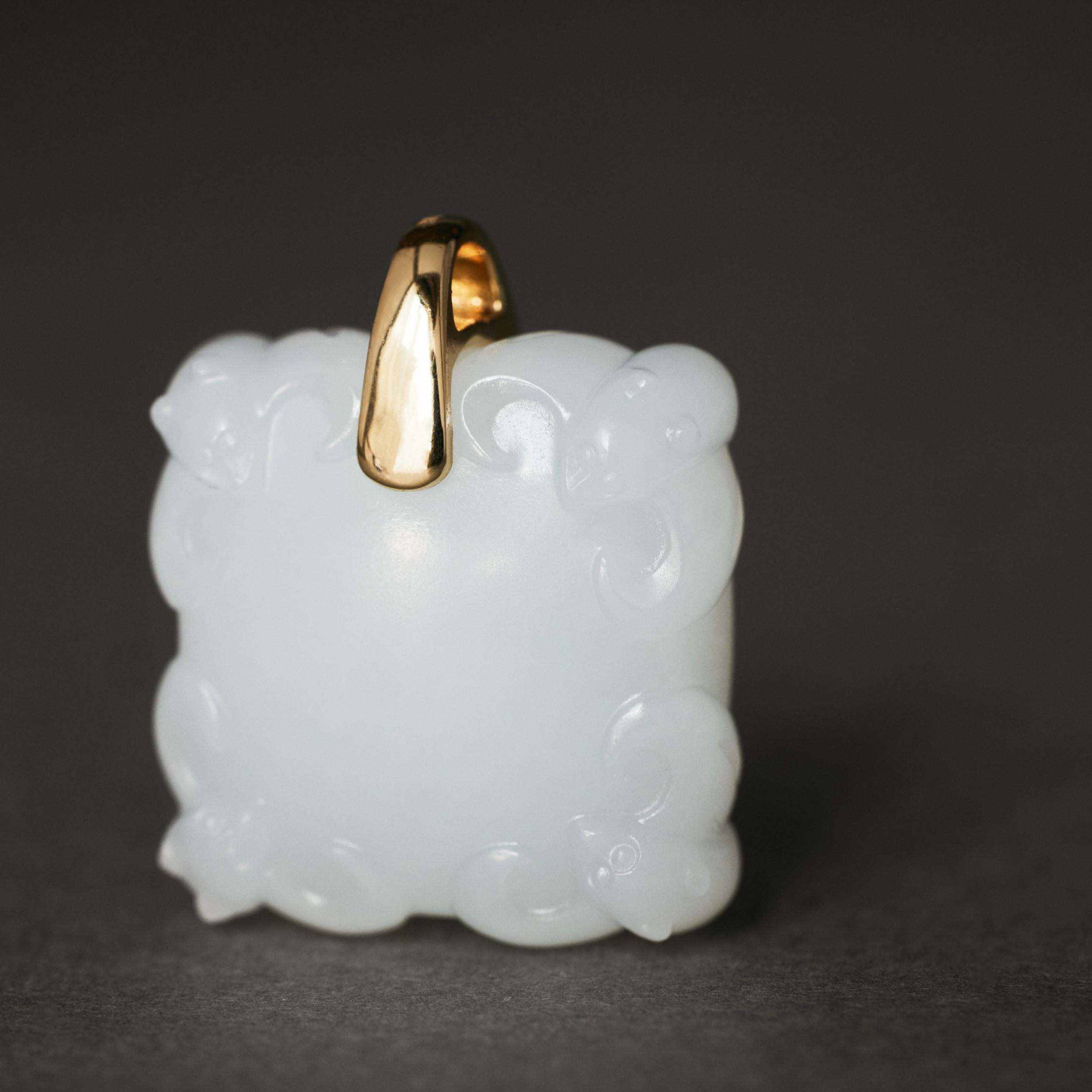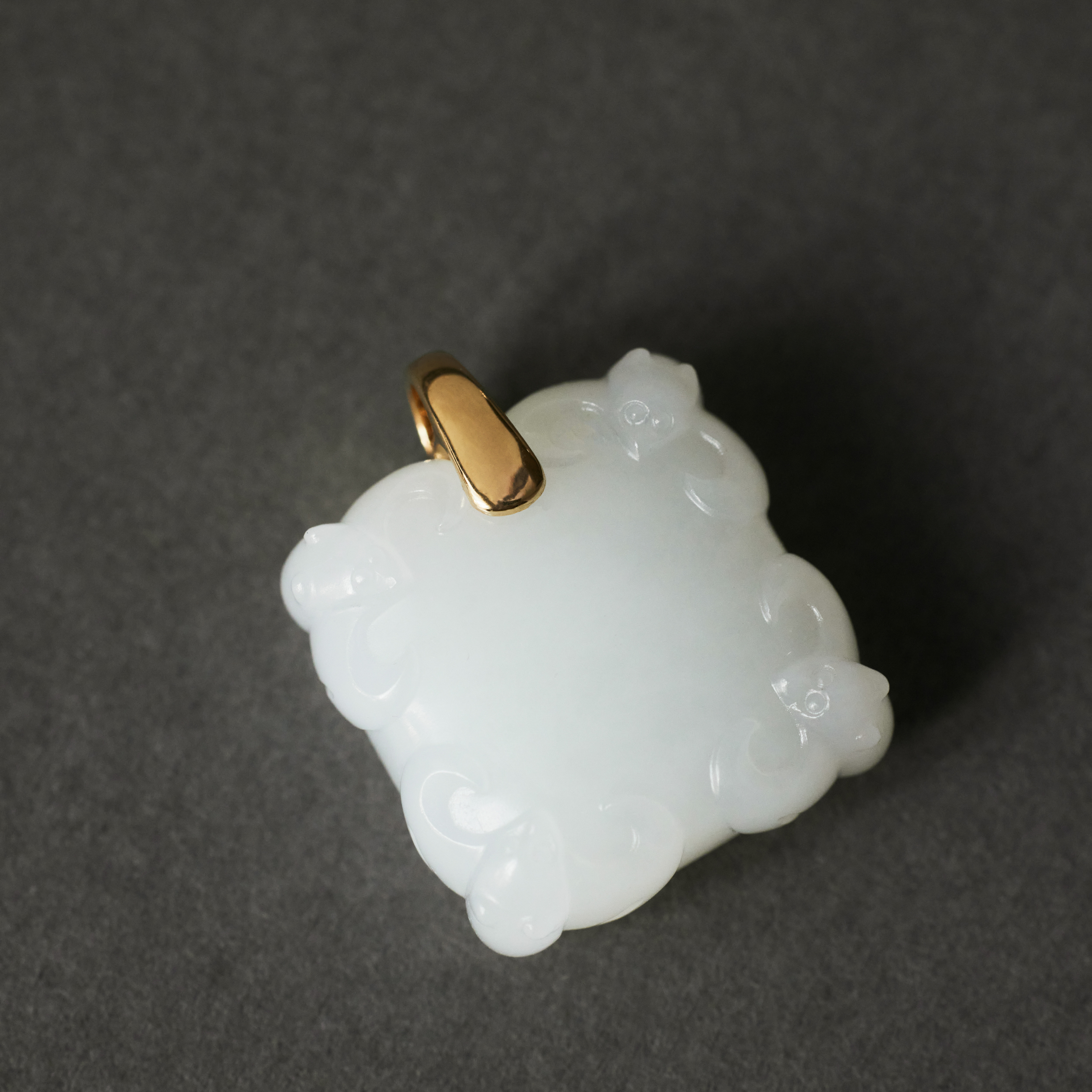 此款玉牌对蝙蝠元素的应用,突破了传统二维平面的限制,四只立体浮雕的蝙蝠,抱住玉牌的四个角,谐音“福报”,得名“八方”