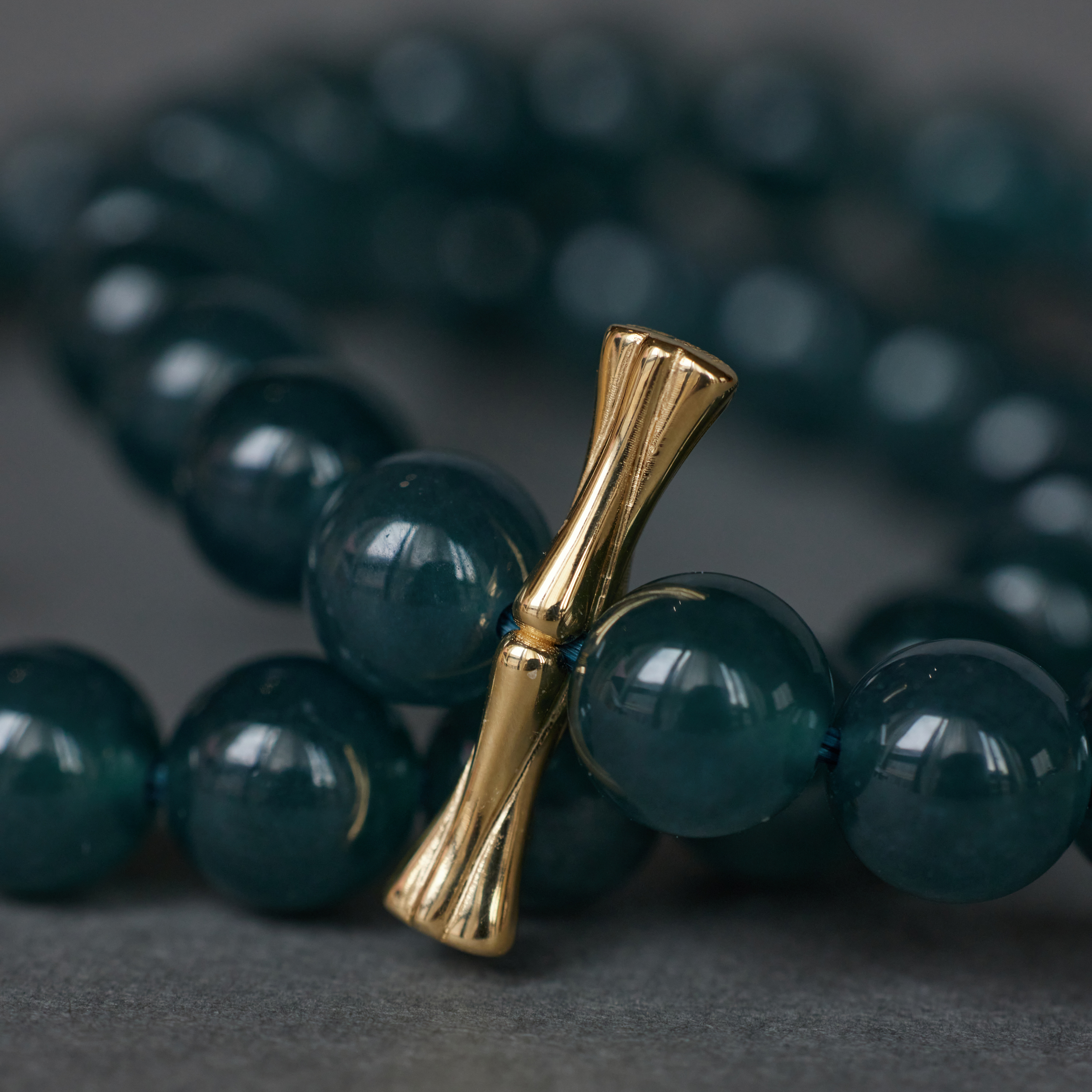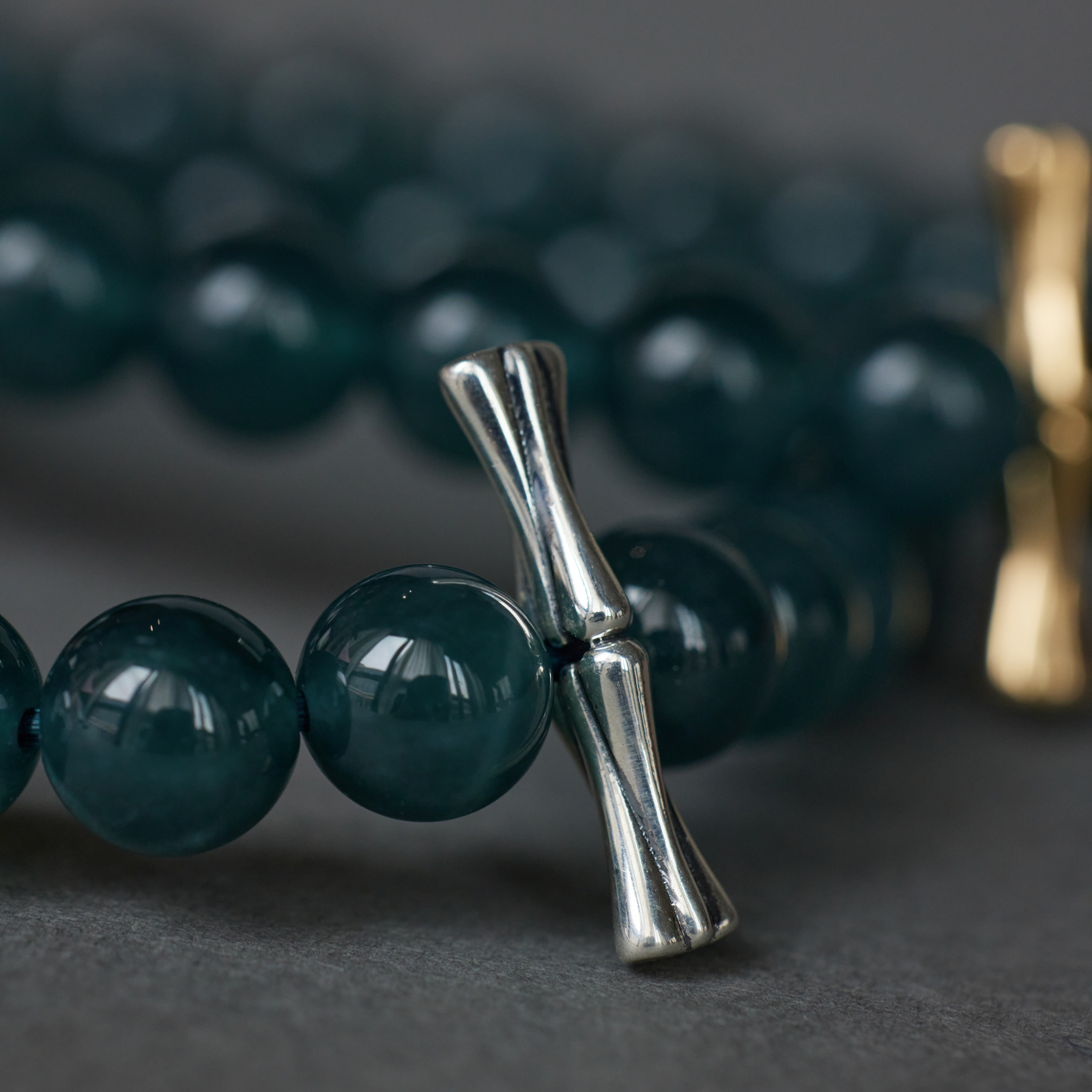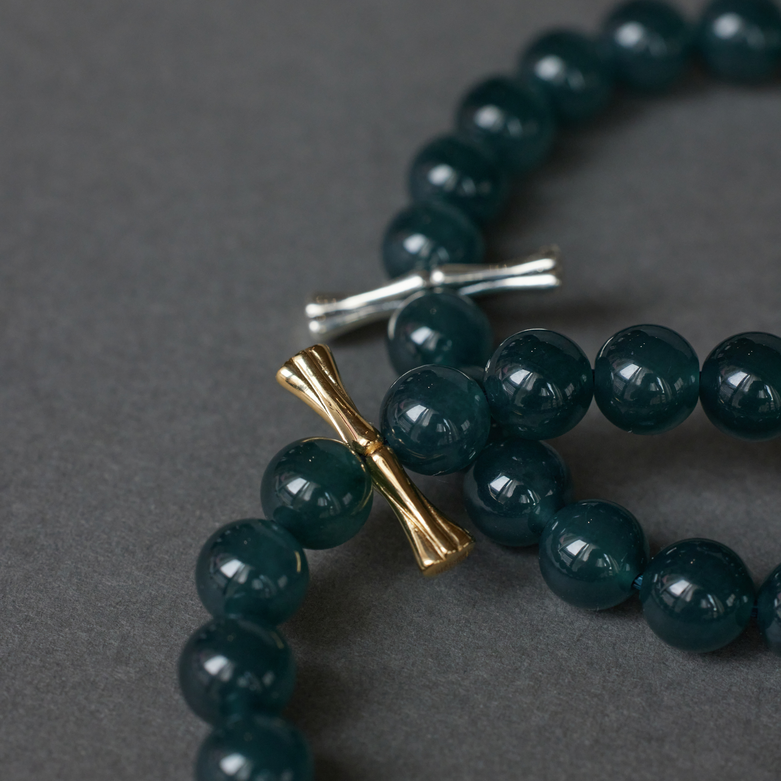 当然,如果只是⼀串规规整整的⽟珠,那倒也不⼀定⾮WJIE来做。妙处,是那⼀根⽵节——或⾦,或银,像根⼩簪⼦,插在珠串中间,不⼤的⼀笔,却点醒了整串