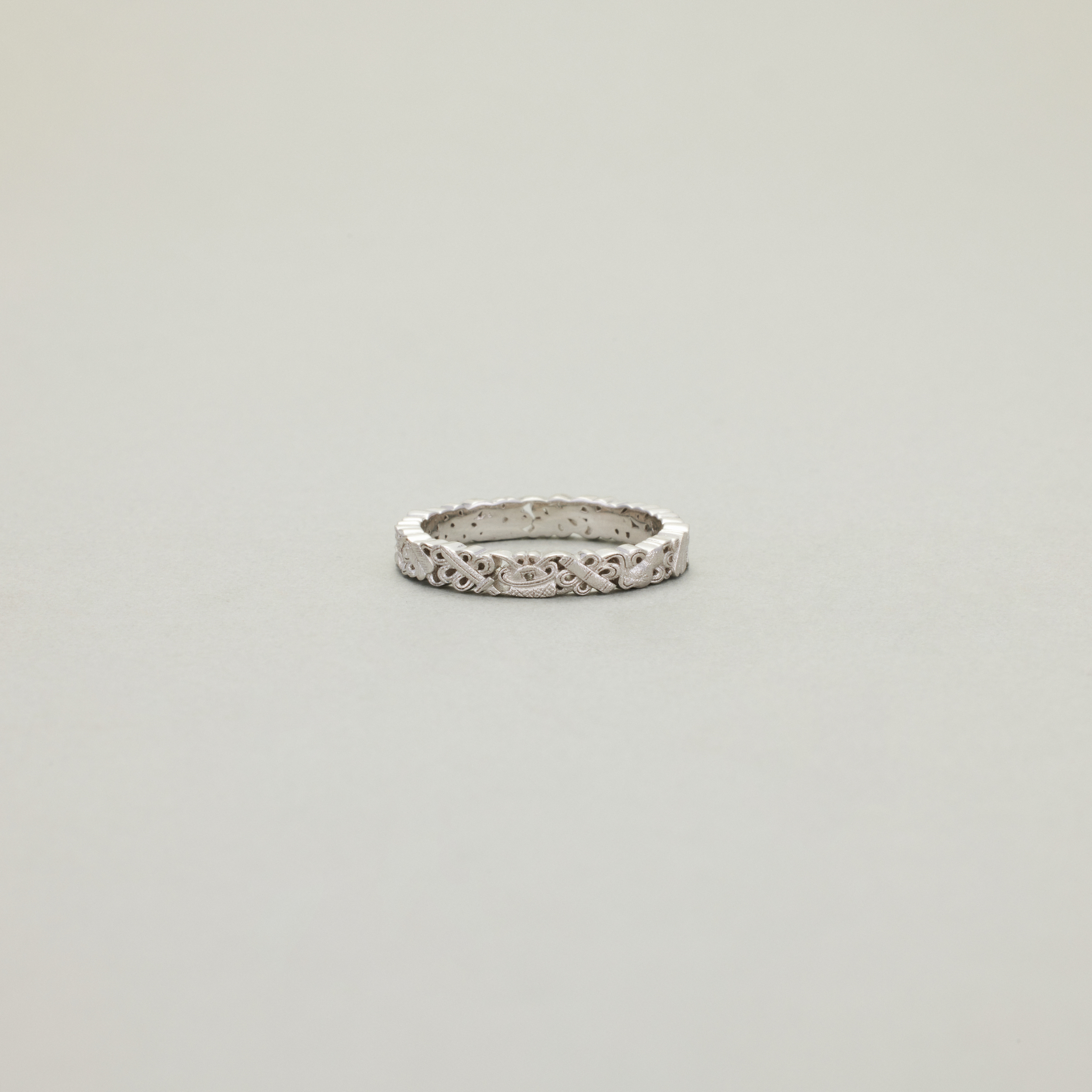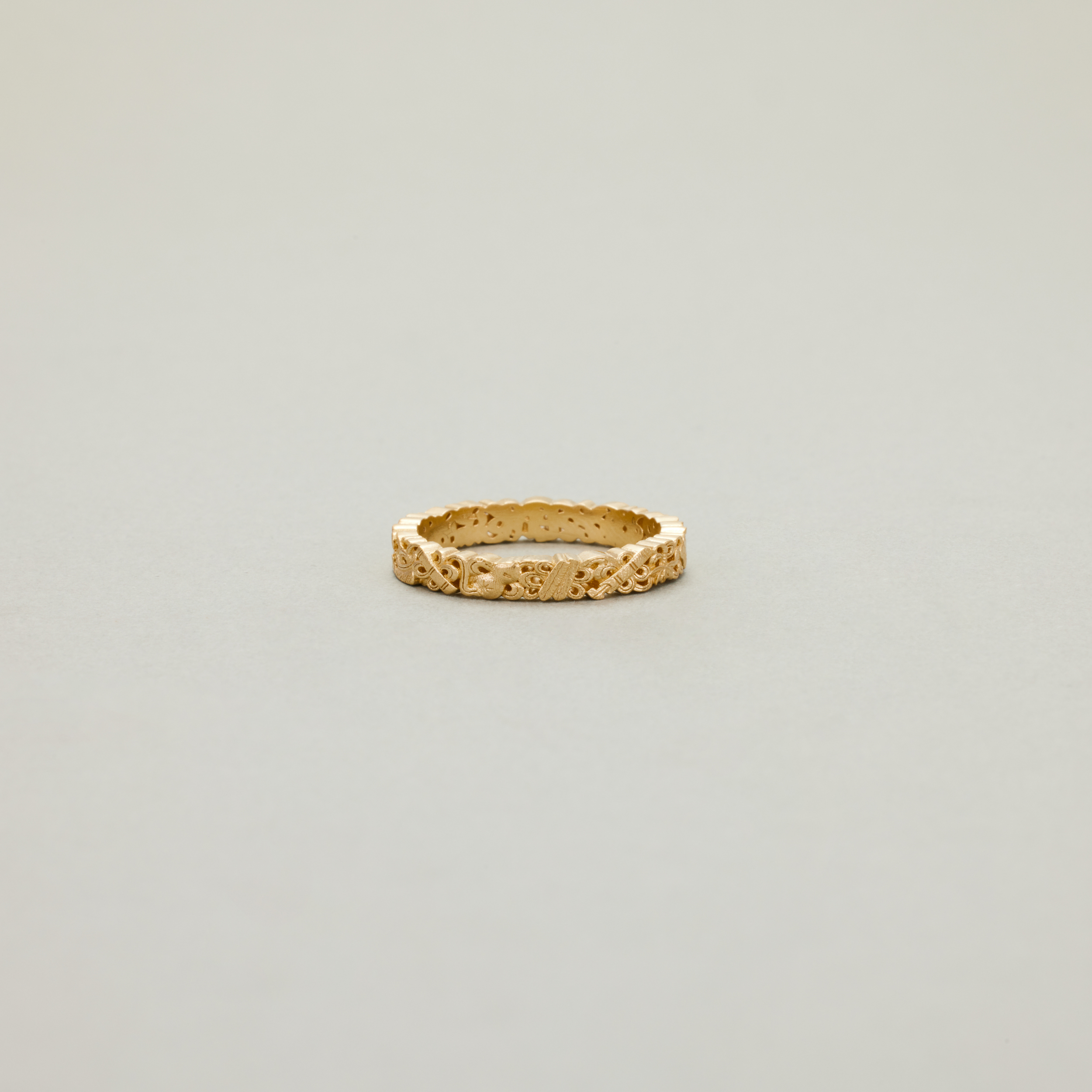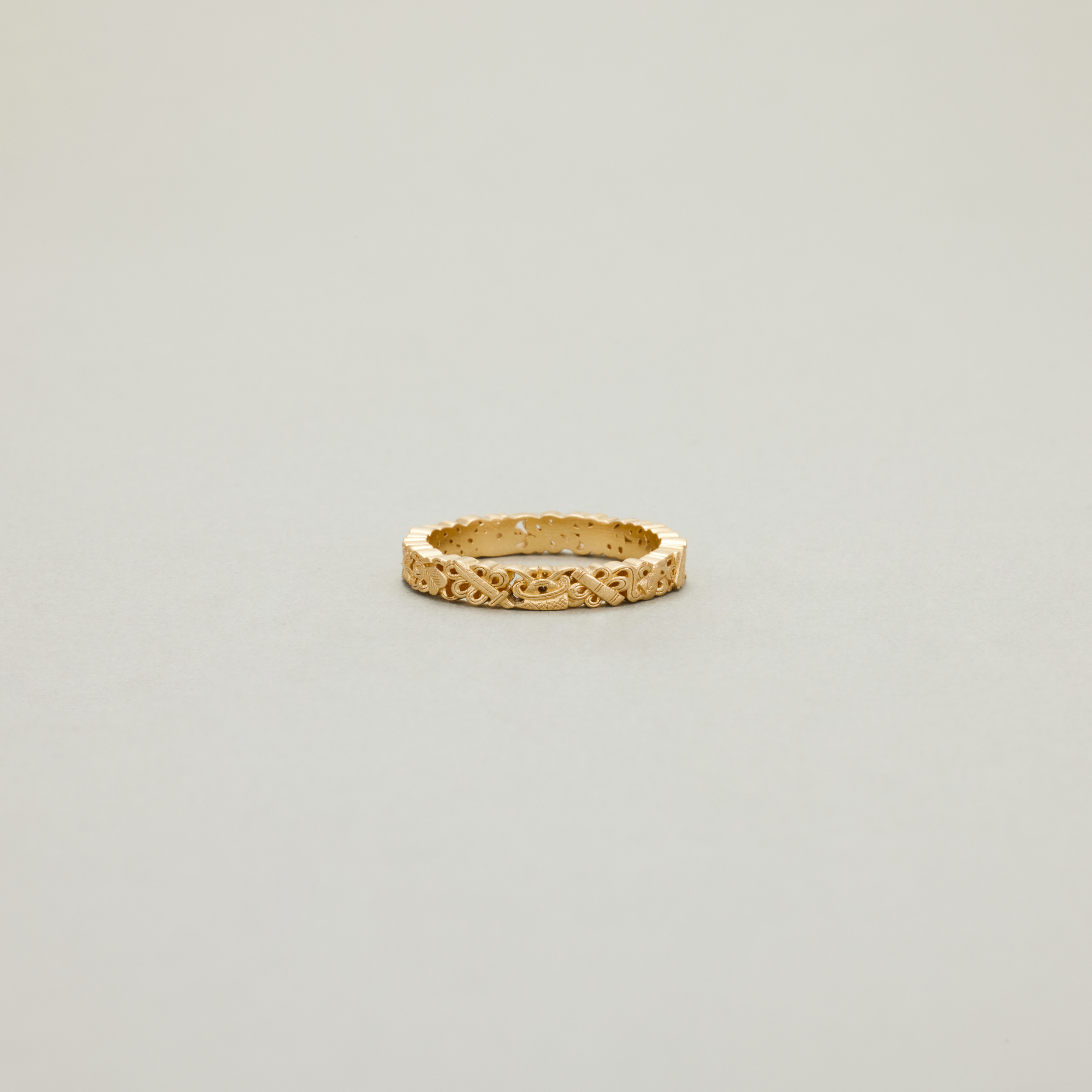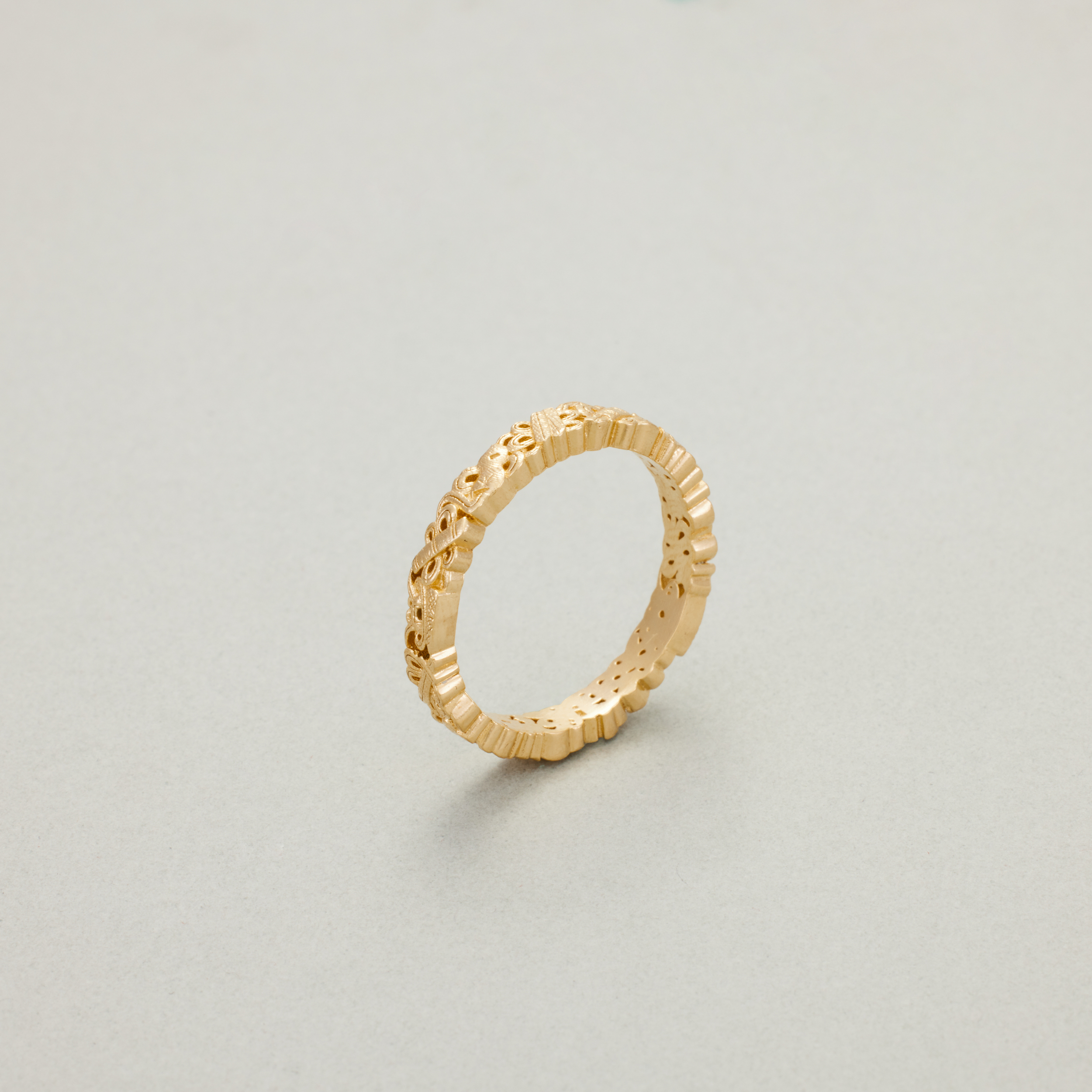 此款戒指,将复杂丰富的八宝纹样排布在宽度仅为3.4mm的戒圈之上,且兼用浮雕与透雕,远看优雅低调、细观耐人寻味,传统元素与当代审美相得益彰