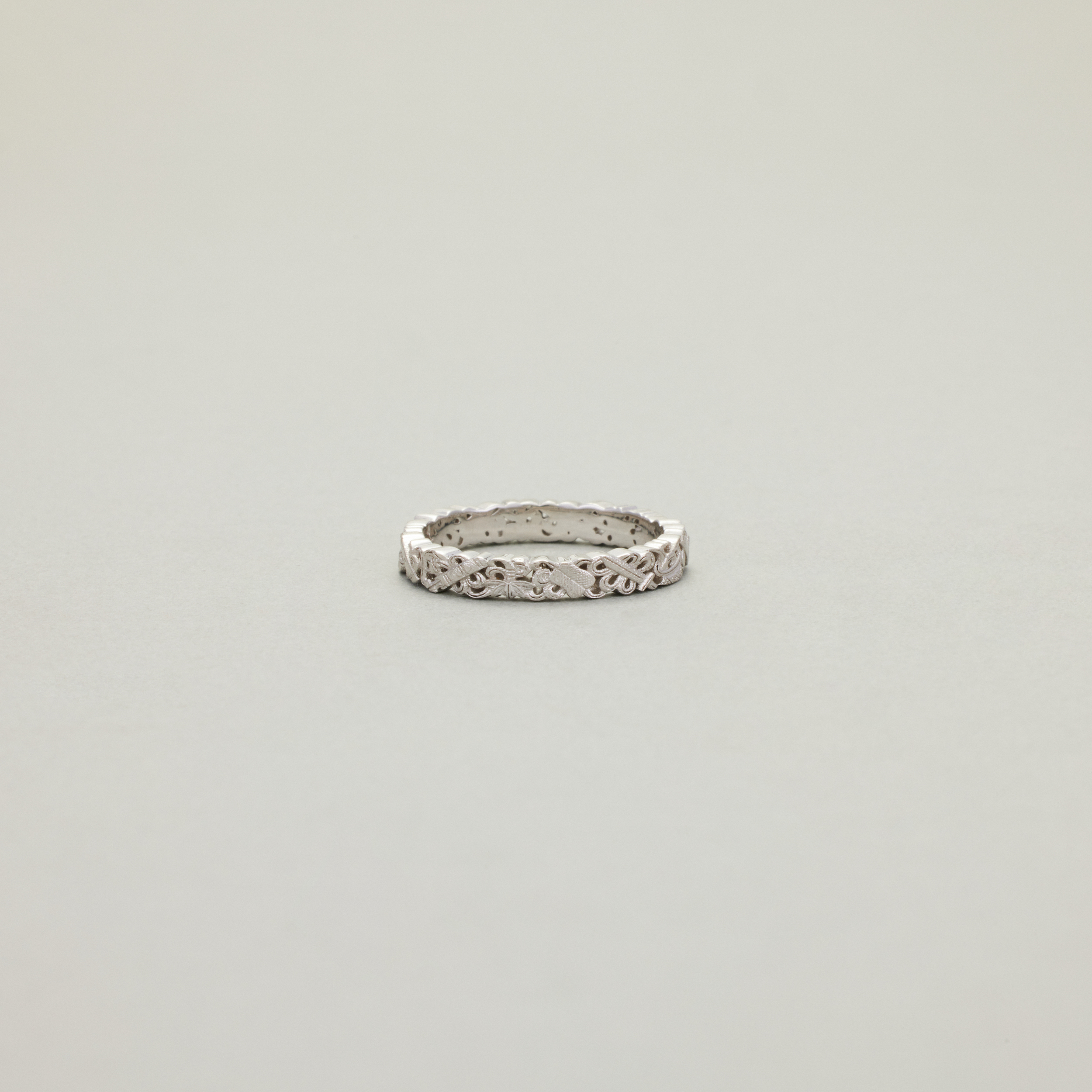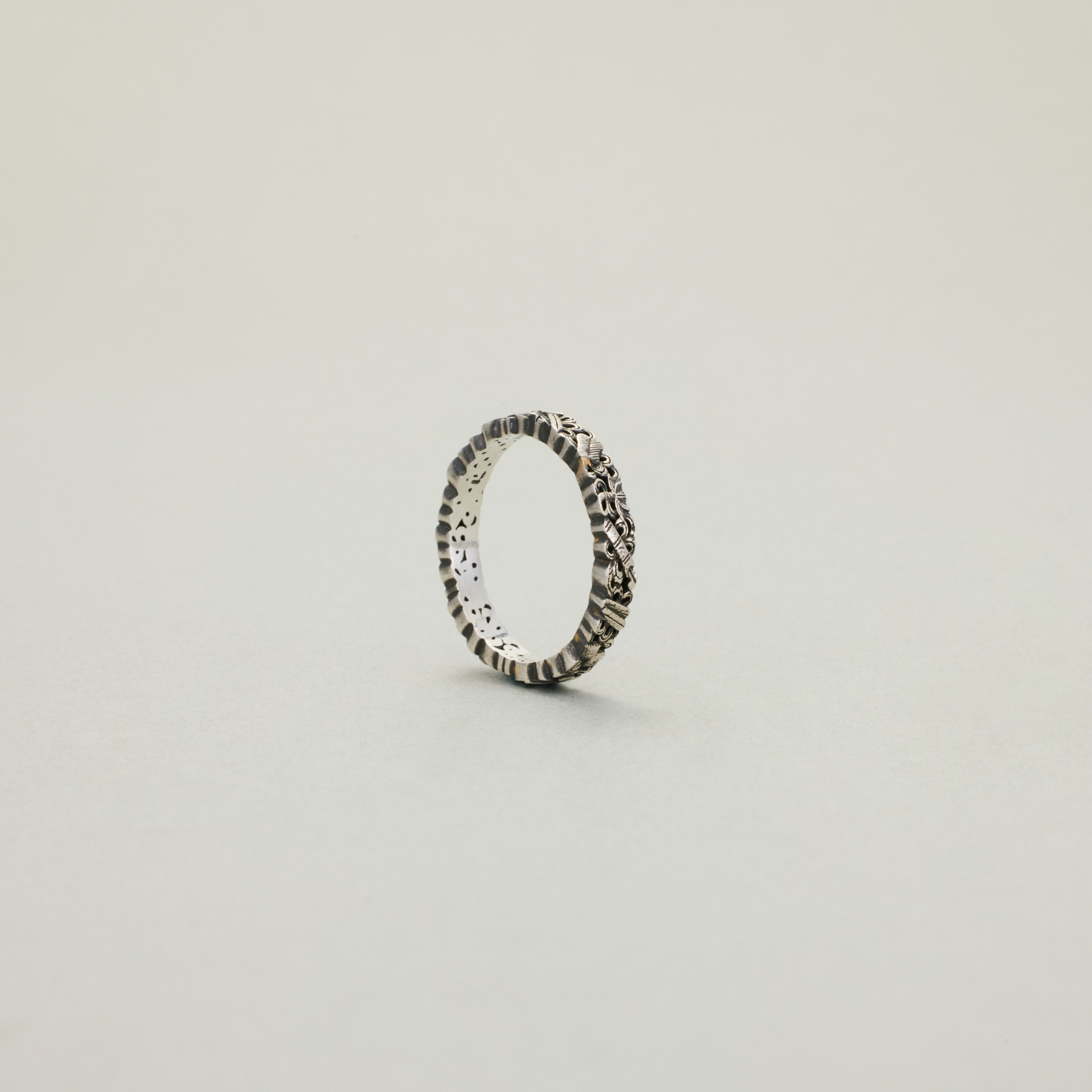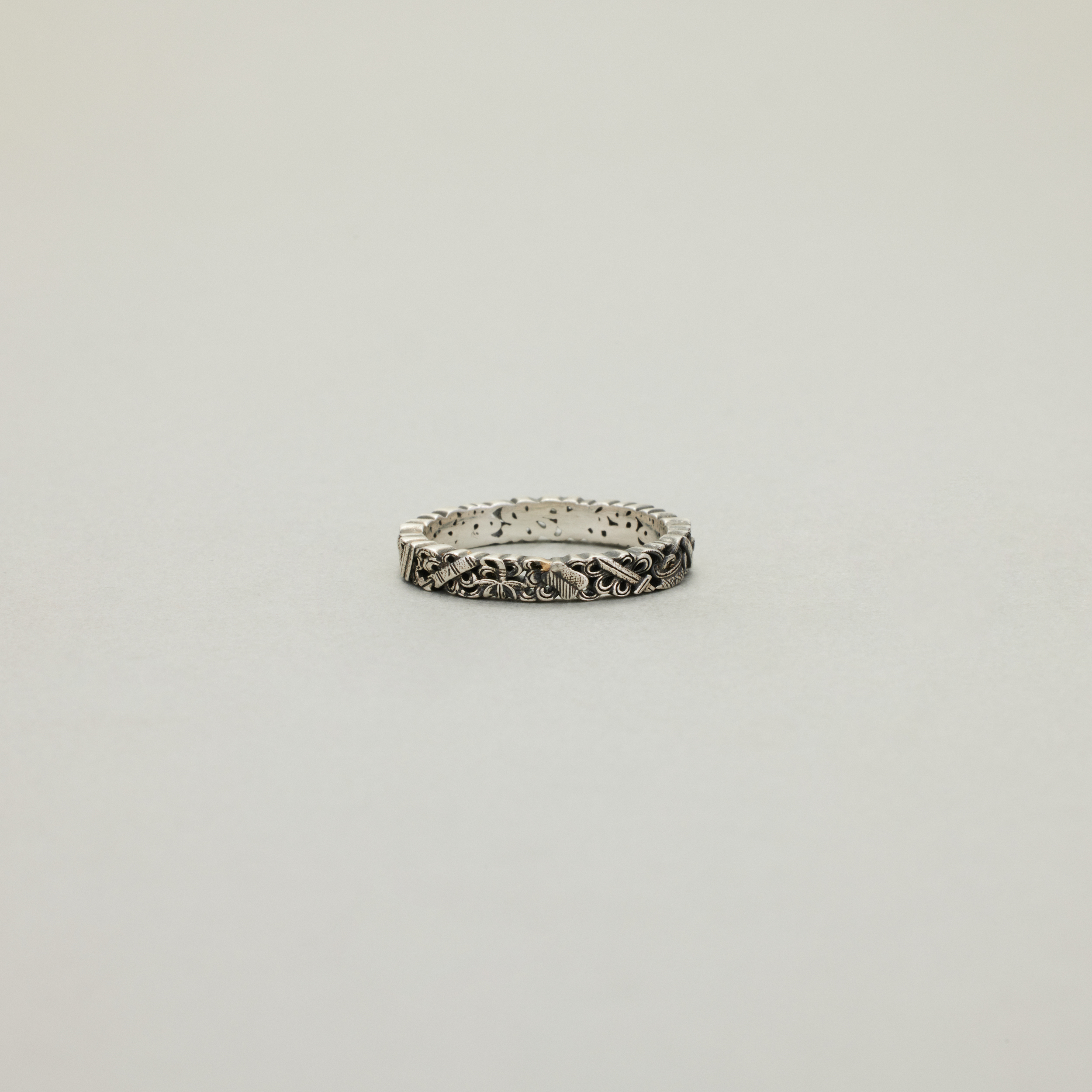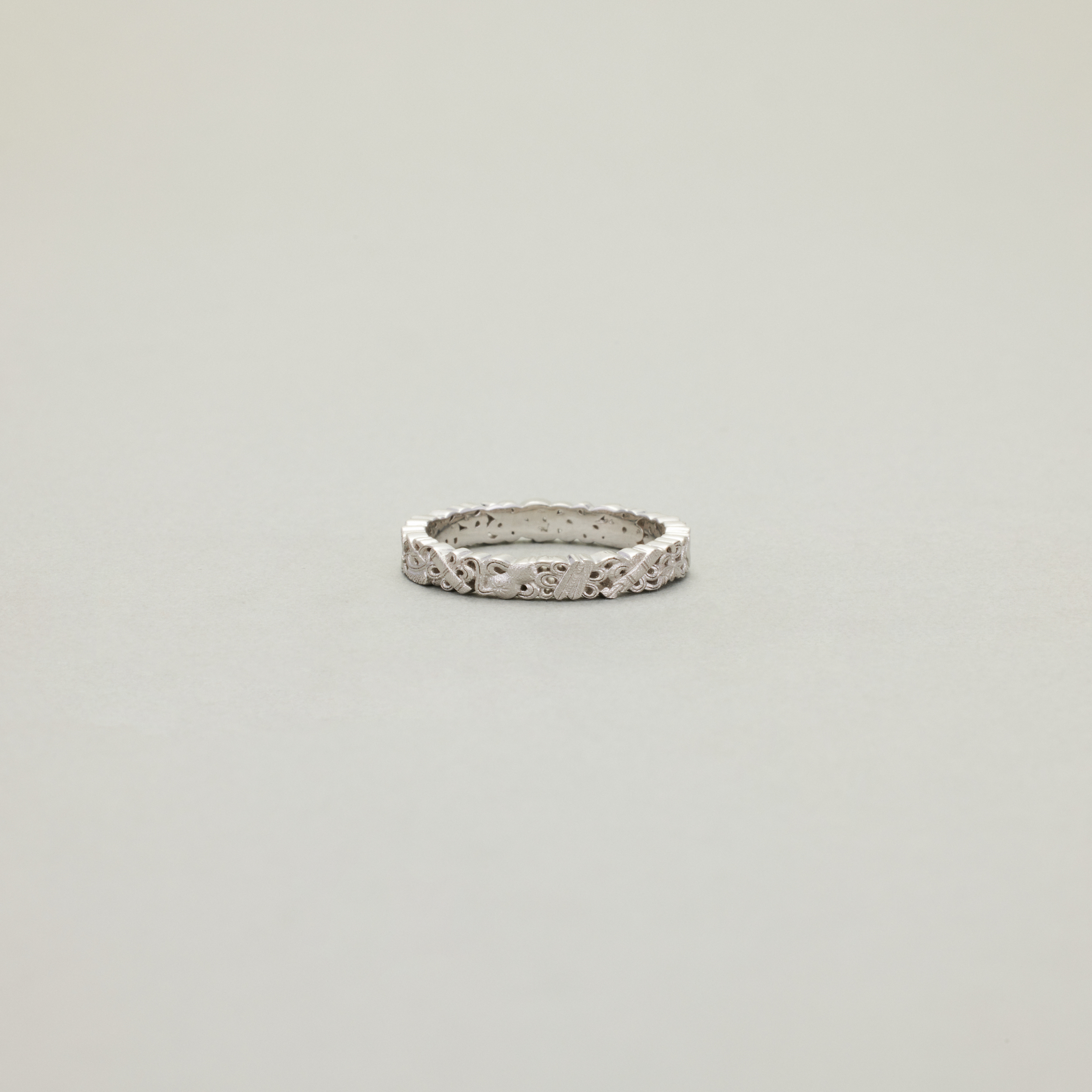 此款戒指,将复杂丰富的八宝纹样排布在宽度仅为3.4mm的戒圈之上,且兼用浮雕与透雕,远看优雅低调、细观耐人寻味,传统元素与当代审美相得益彰