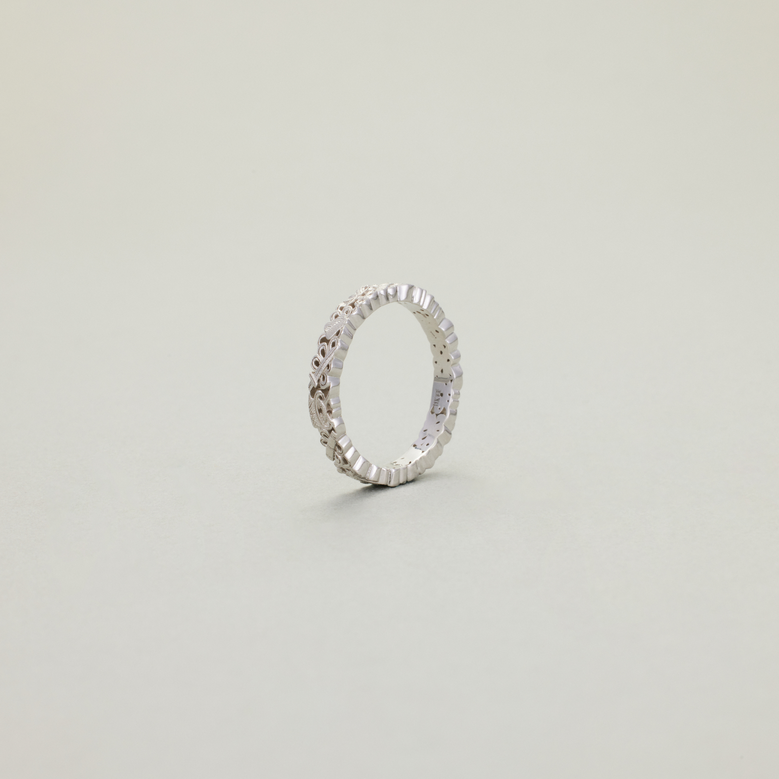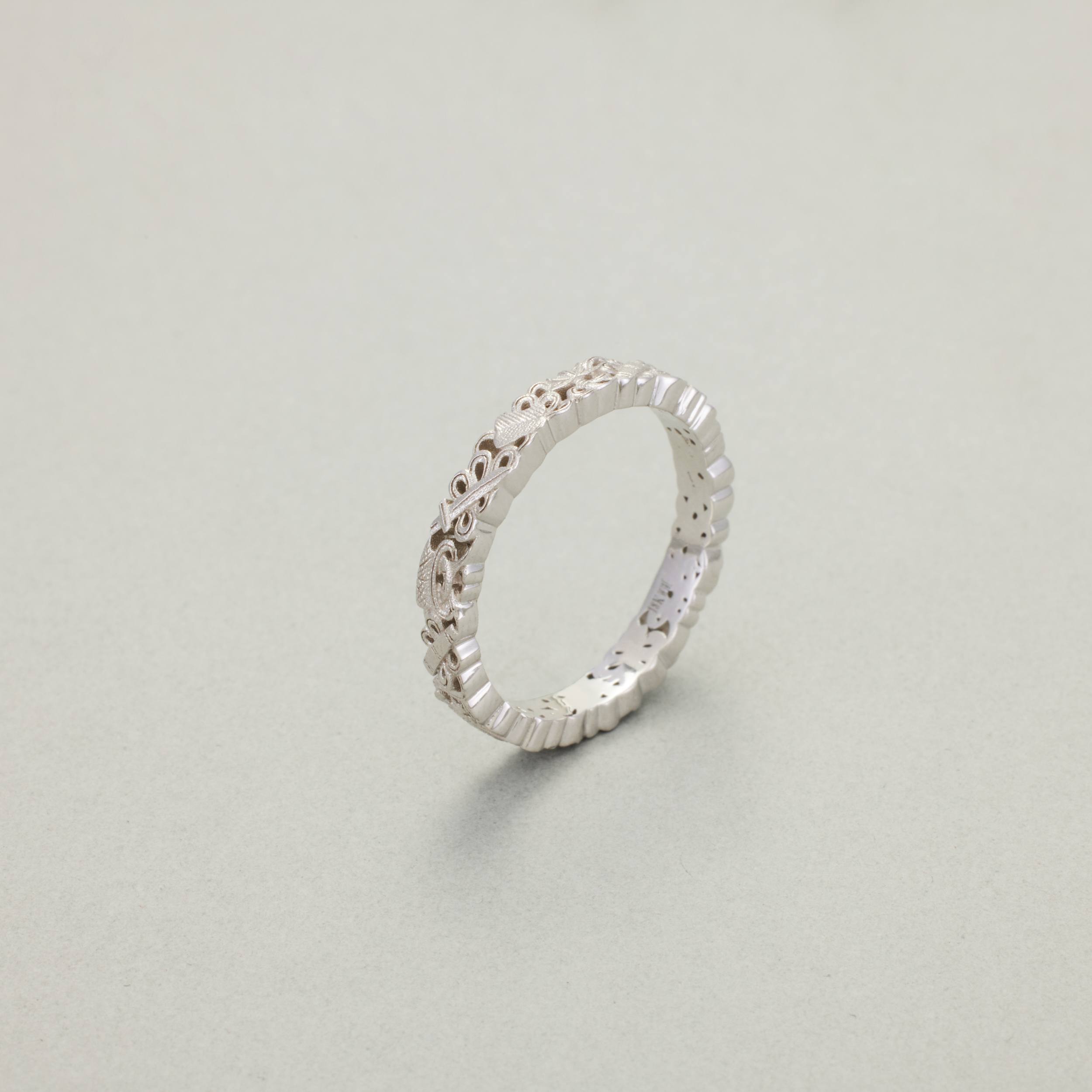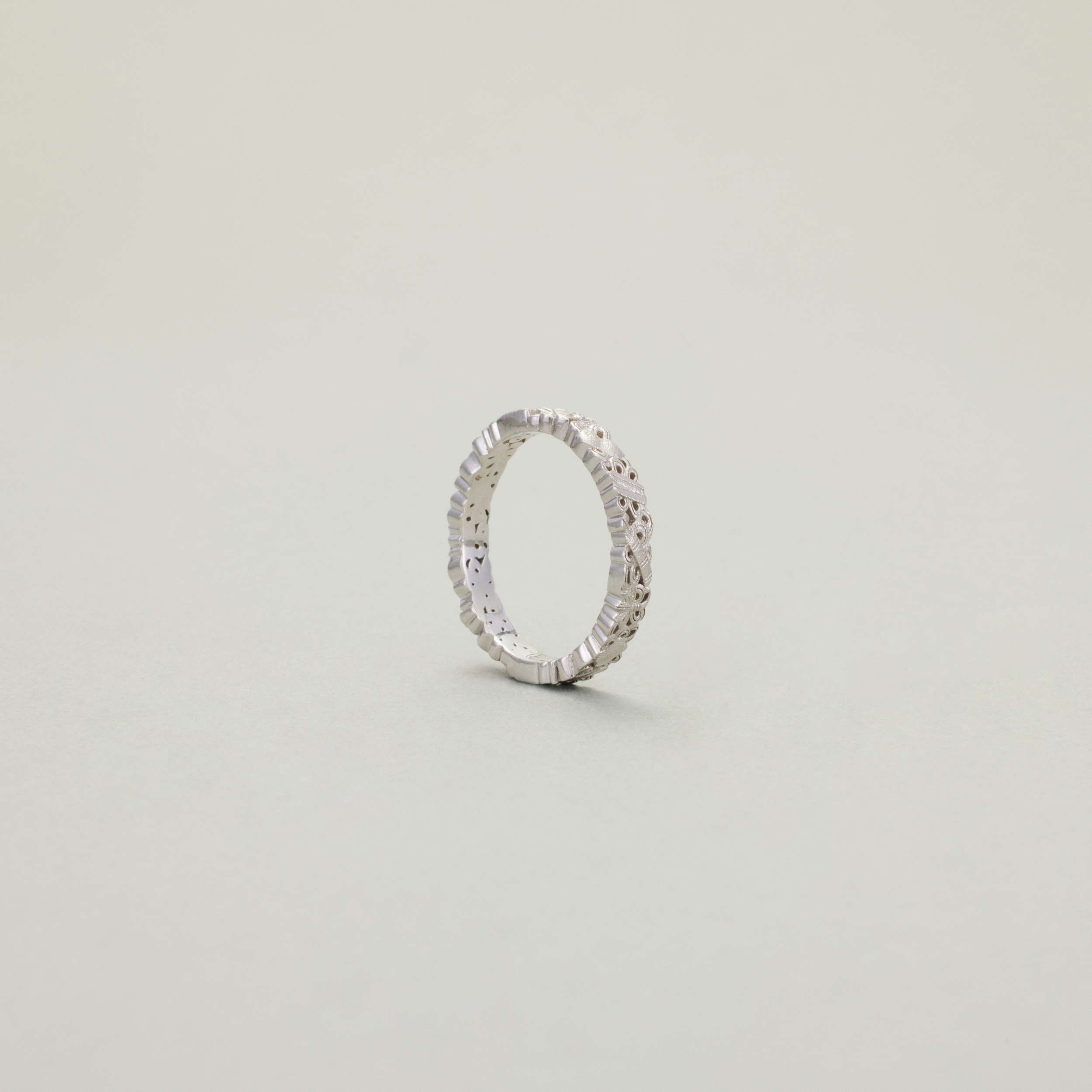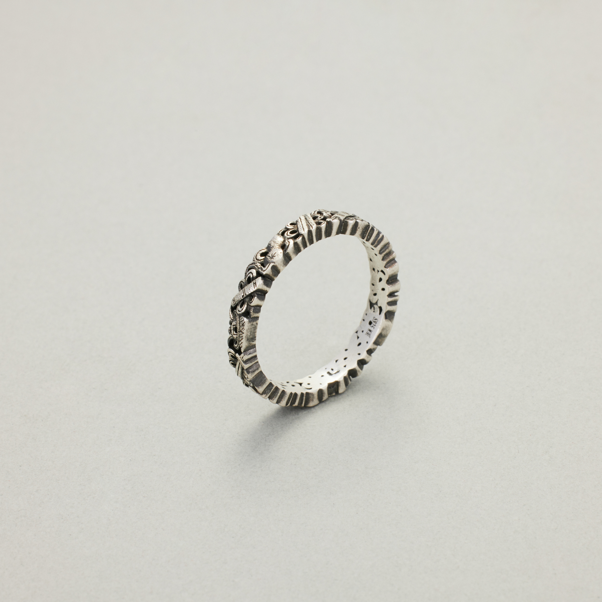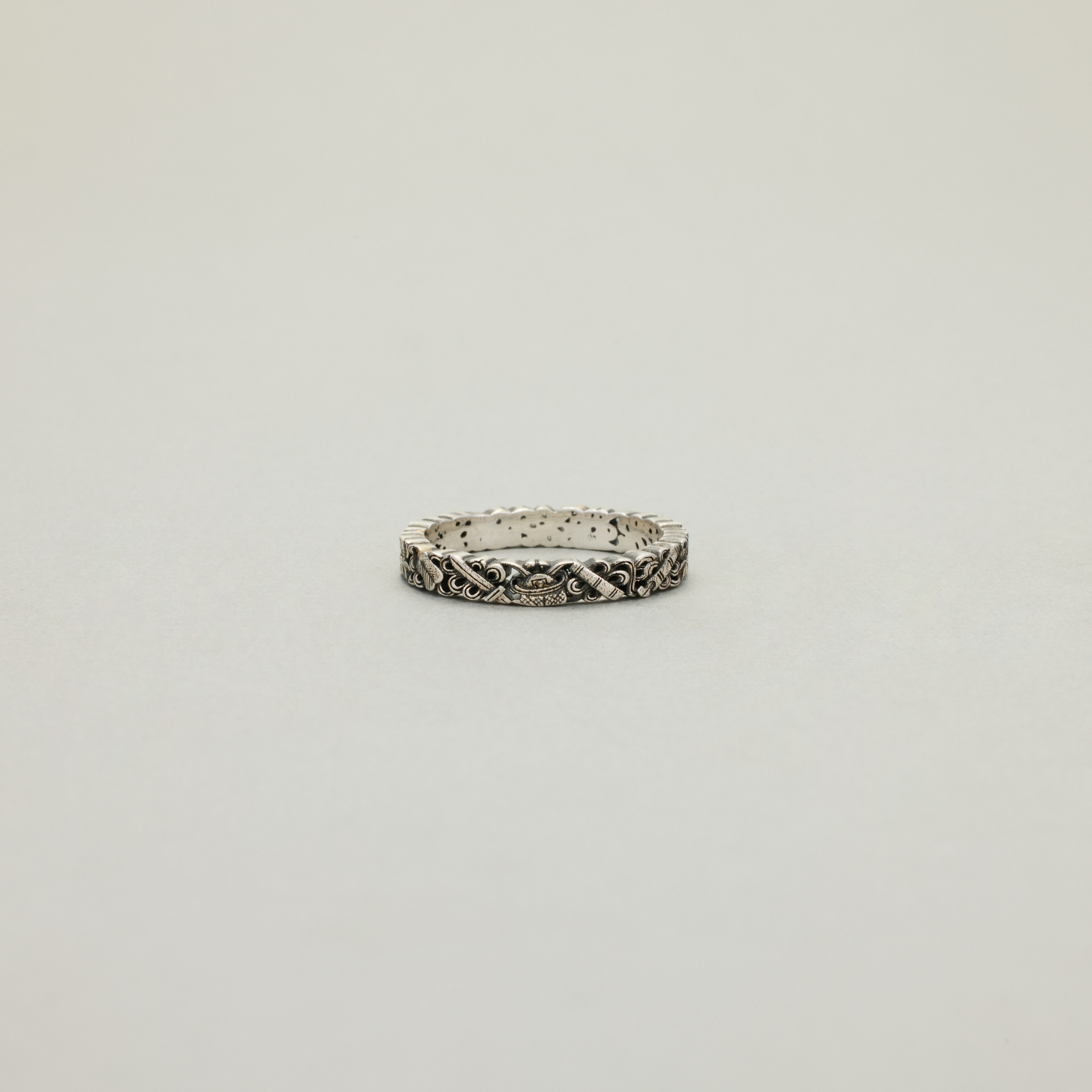 此款戒指,将复杂丰富的八宝纹样排布在宽度仅为3.4mm的戒圈之上,且兼用浮雕与透雕,远看优雅低调、细观耐人寻味,传统元素与当代审美相得益彰