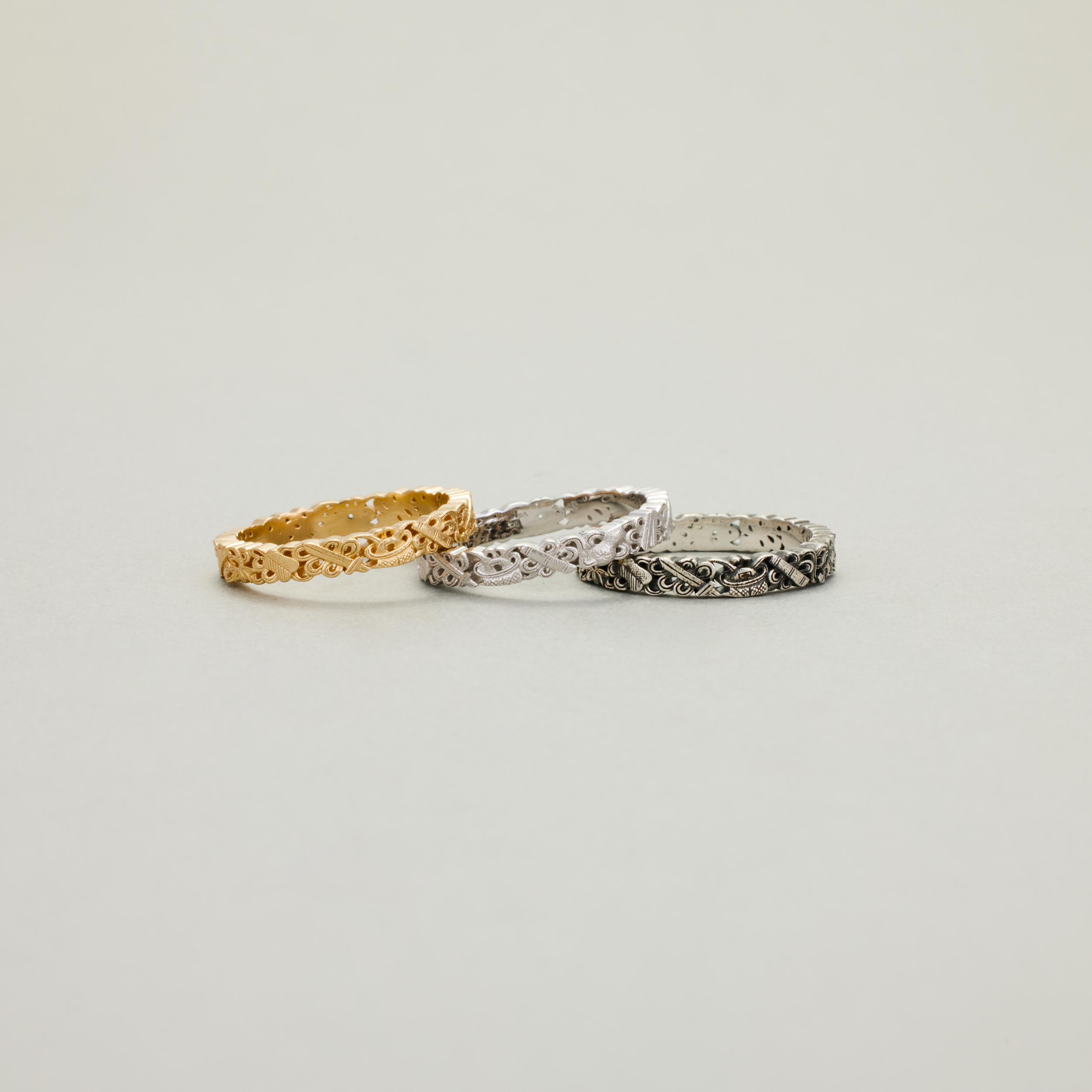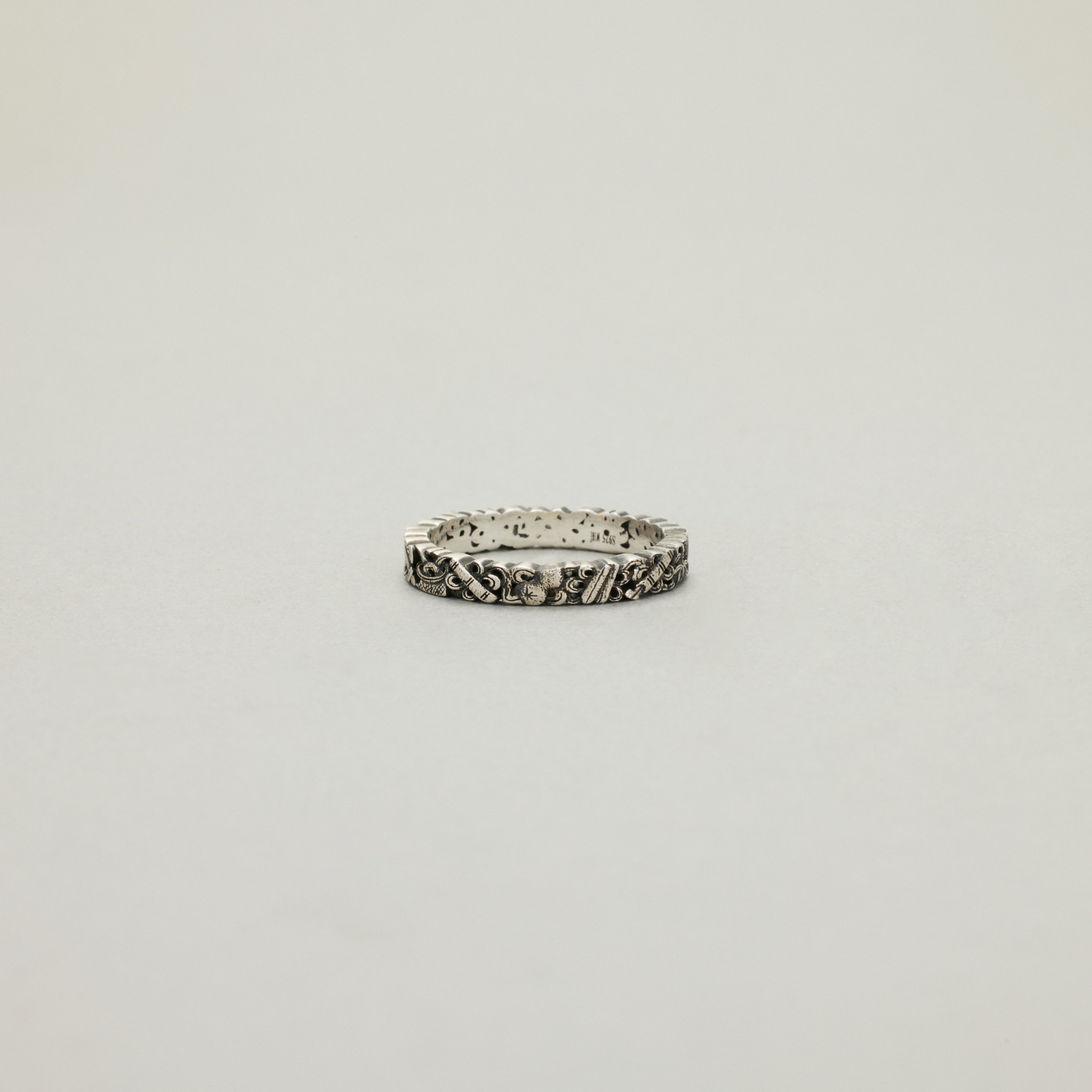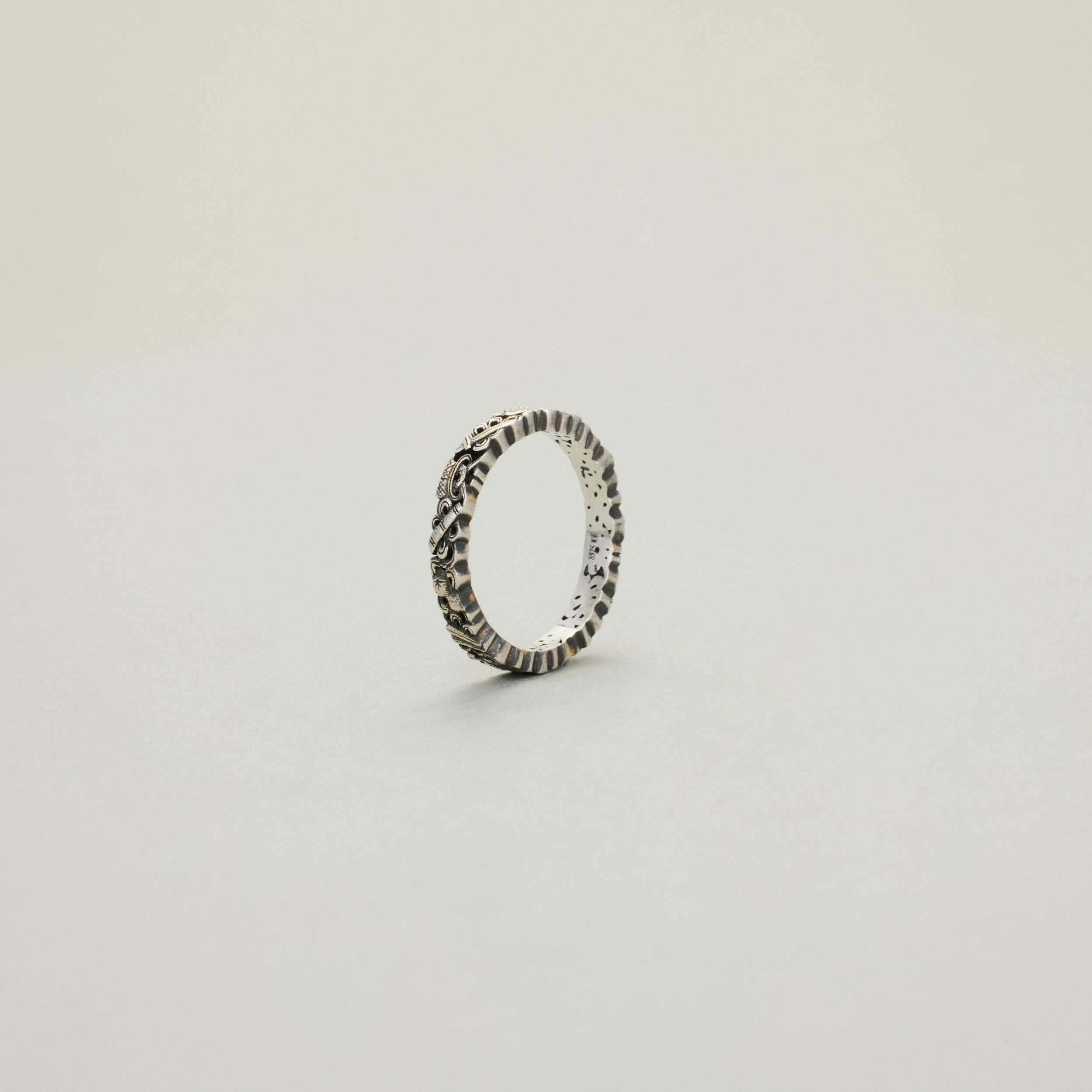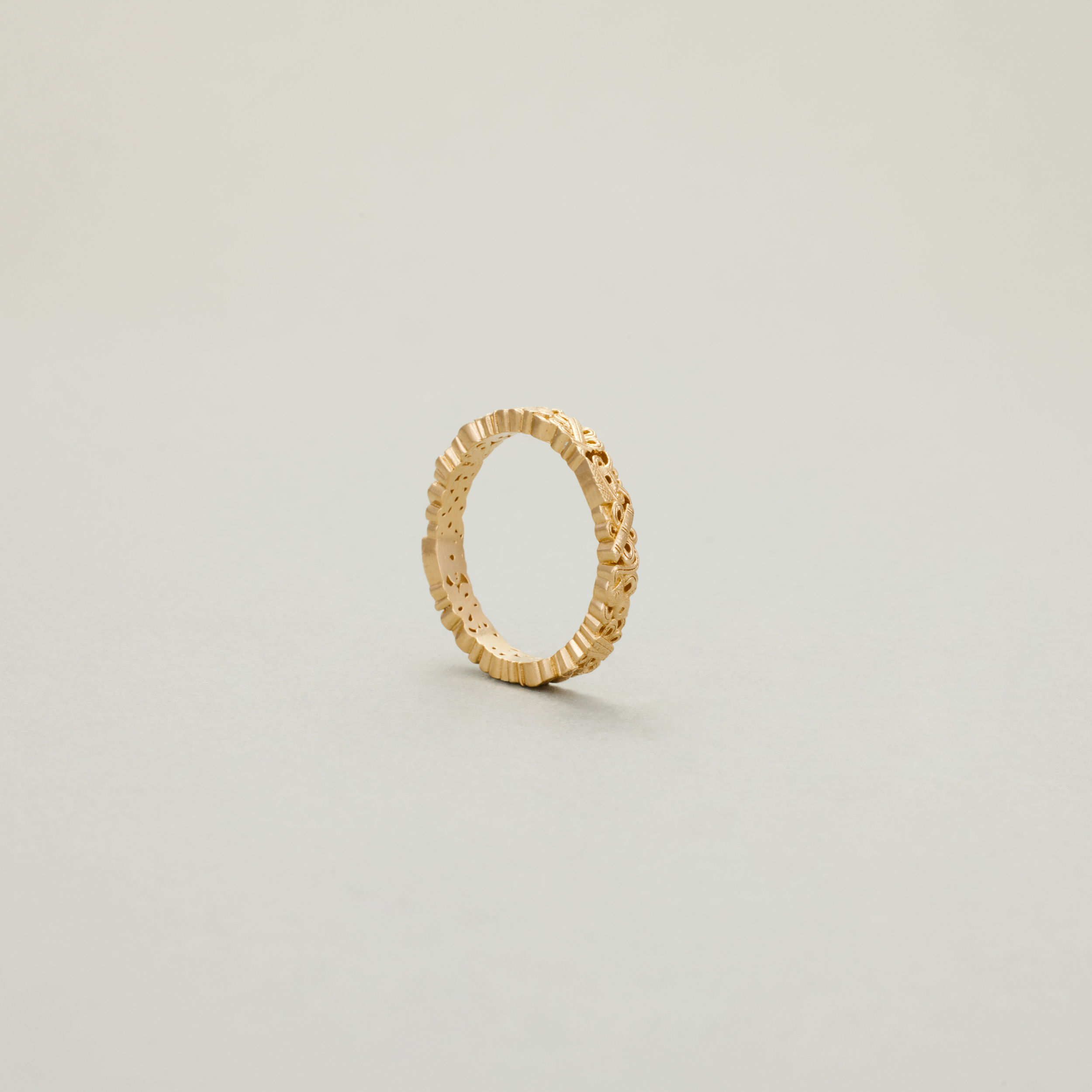 此款戒指,将复杂丰富的八宝纹样排布在宽度仅为3.4mm的戒圈之上,且兼用浮雕与透雕,远看优雅低调、细观耐人寻味,传统元素与当代审美相得益彰