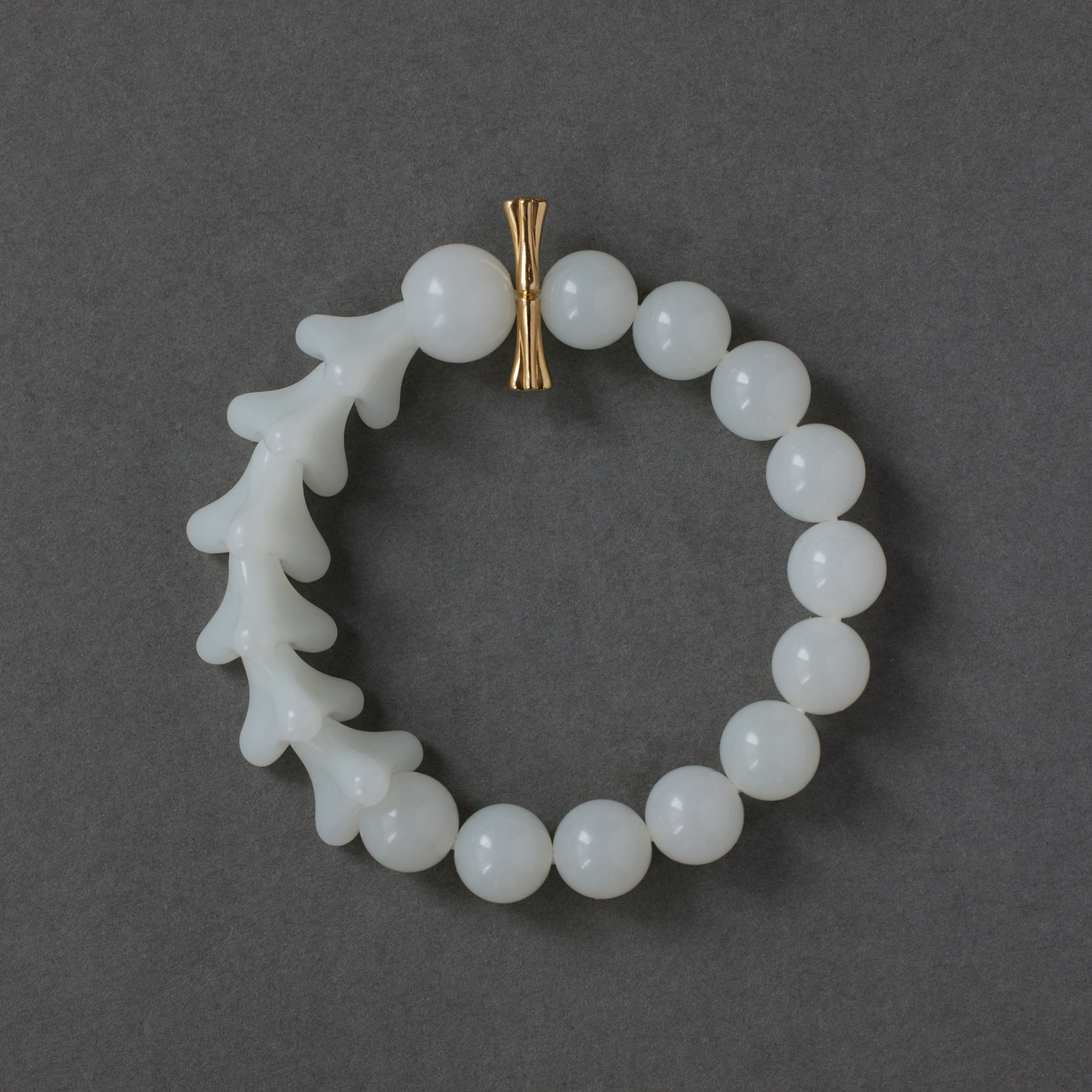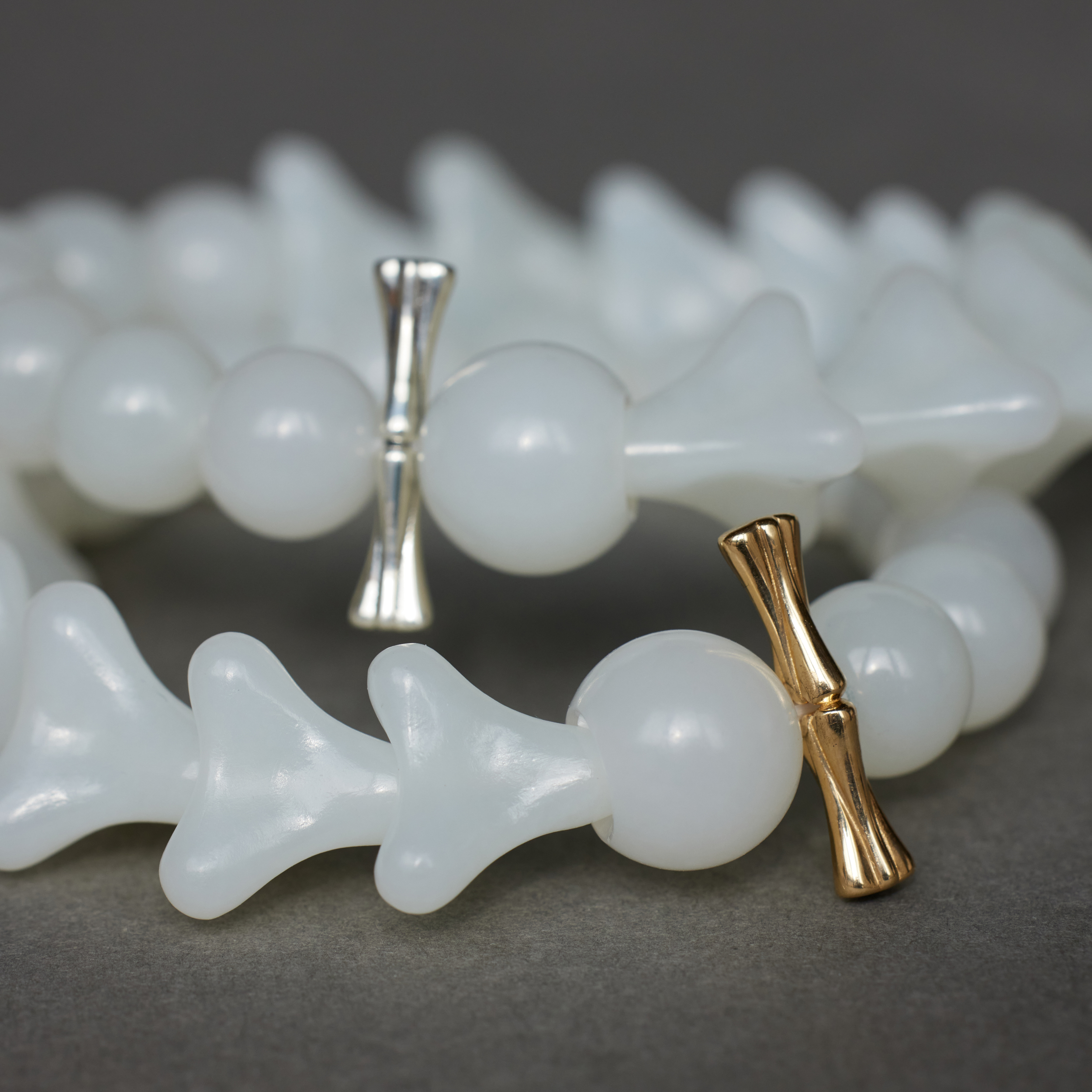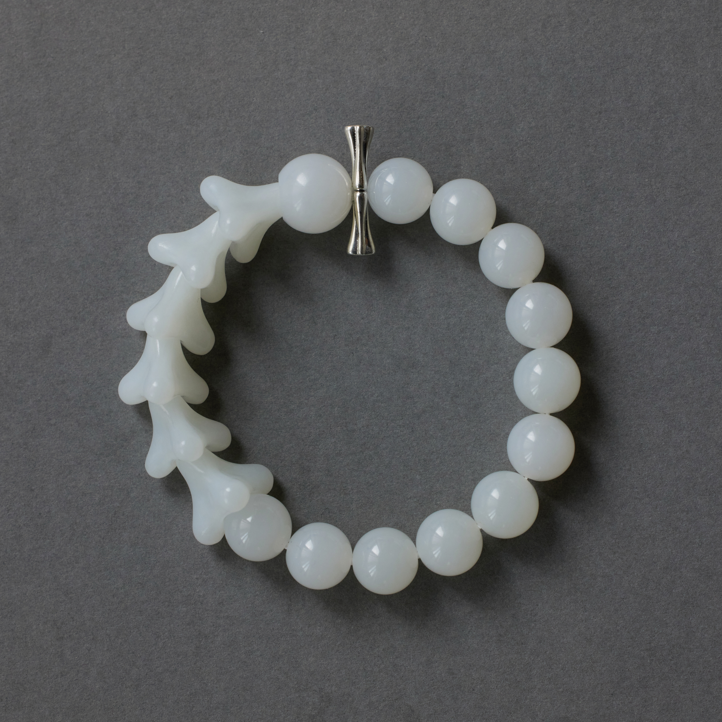 ⻣朵⼉的形,是设计师捏出来的,每颗⼿⼯打磨,温润中带着⻣感。它们⼀颗颗连在⼀起, 让⼈想起远古⽣物的脊椎化⽯,起伏有致,⾃有担当