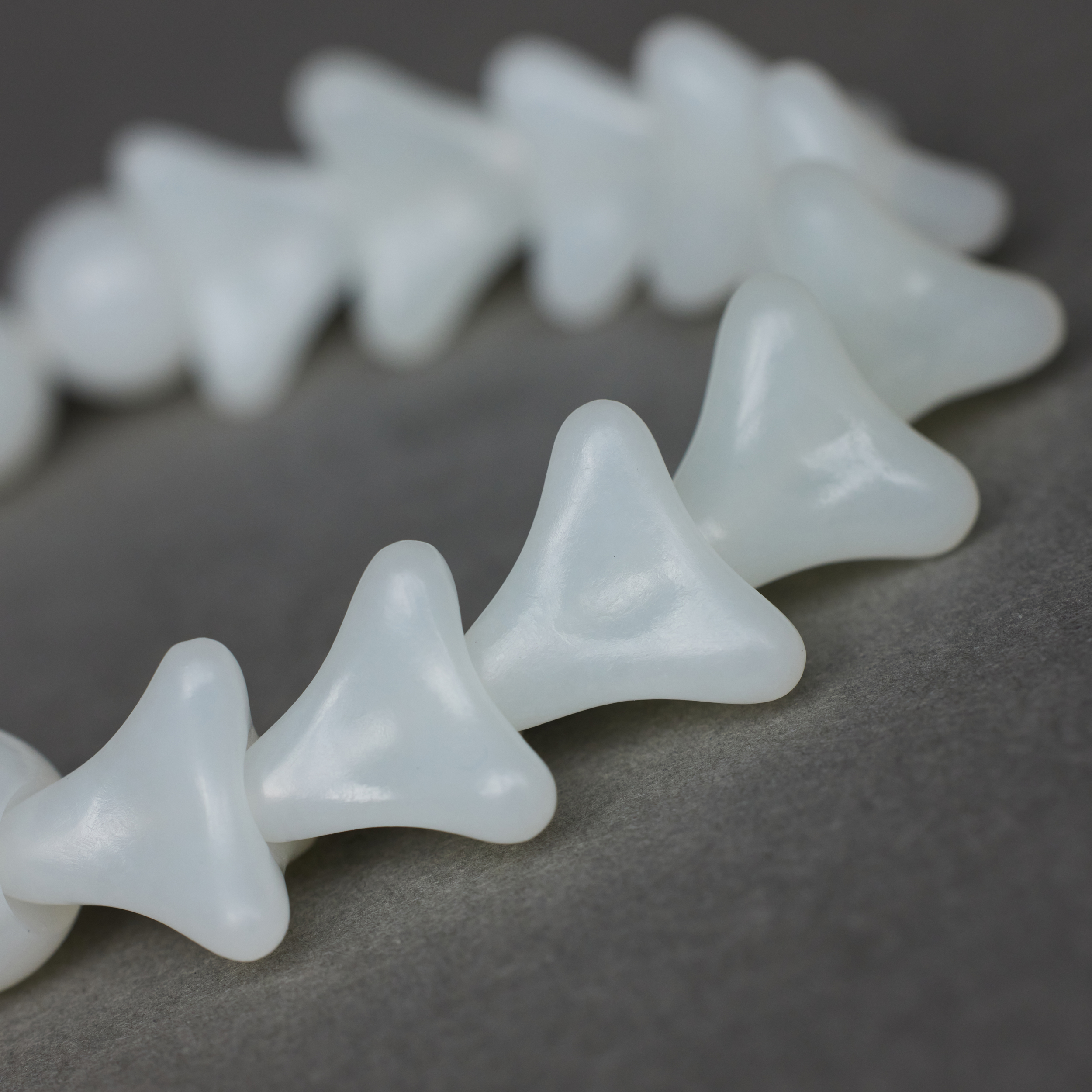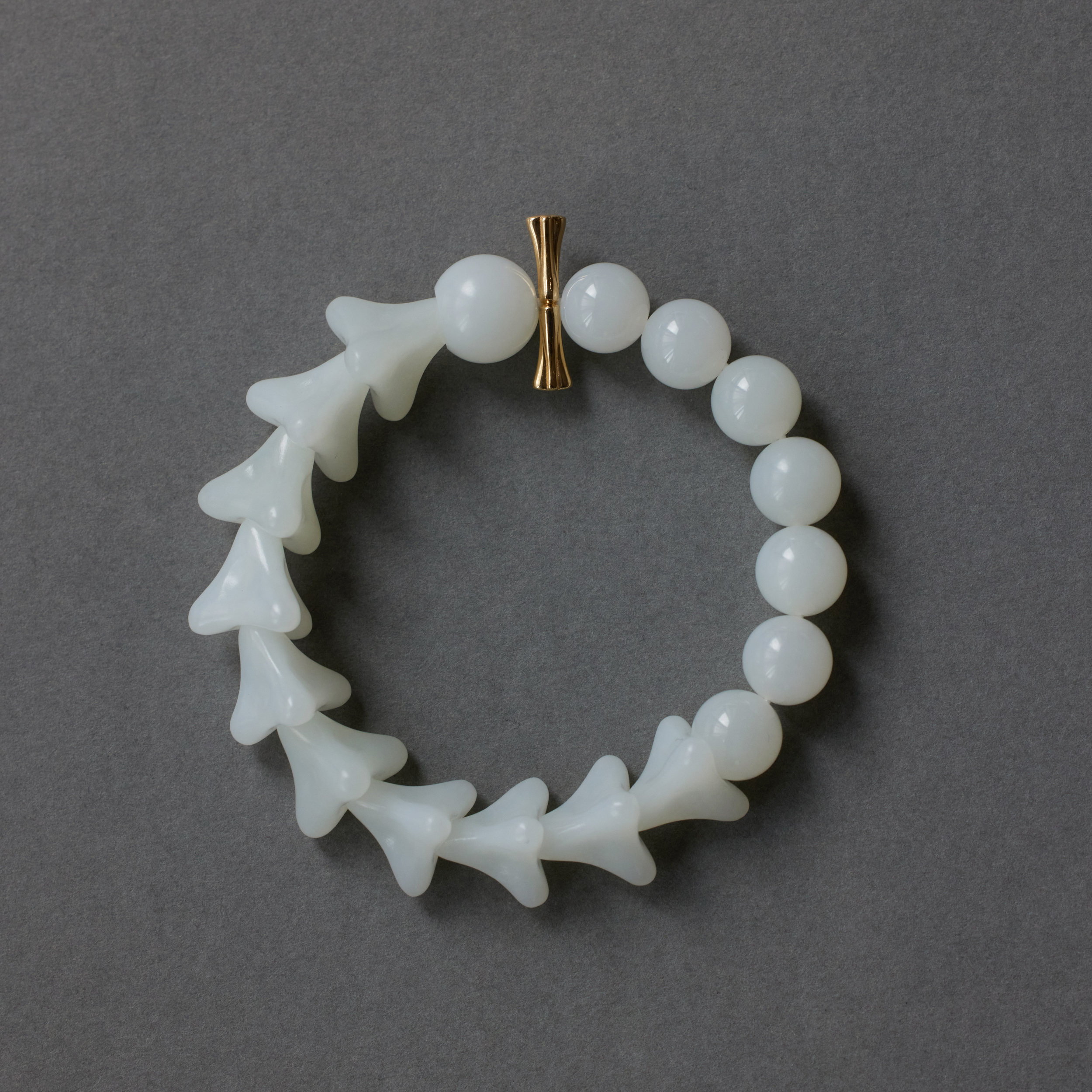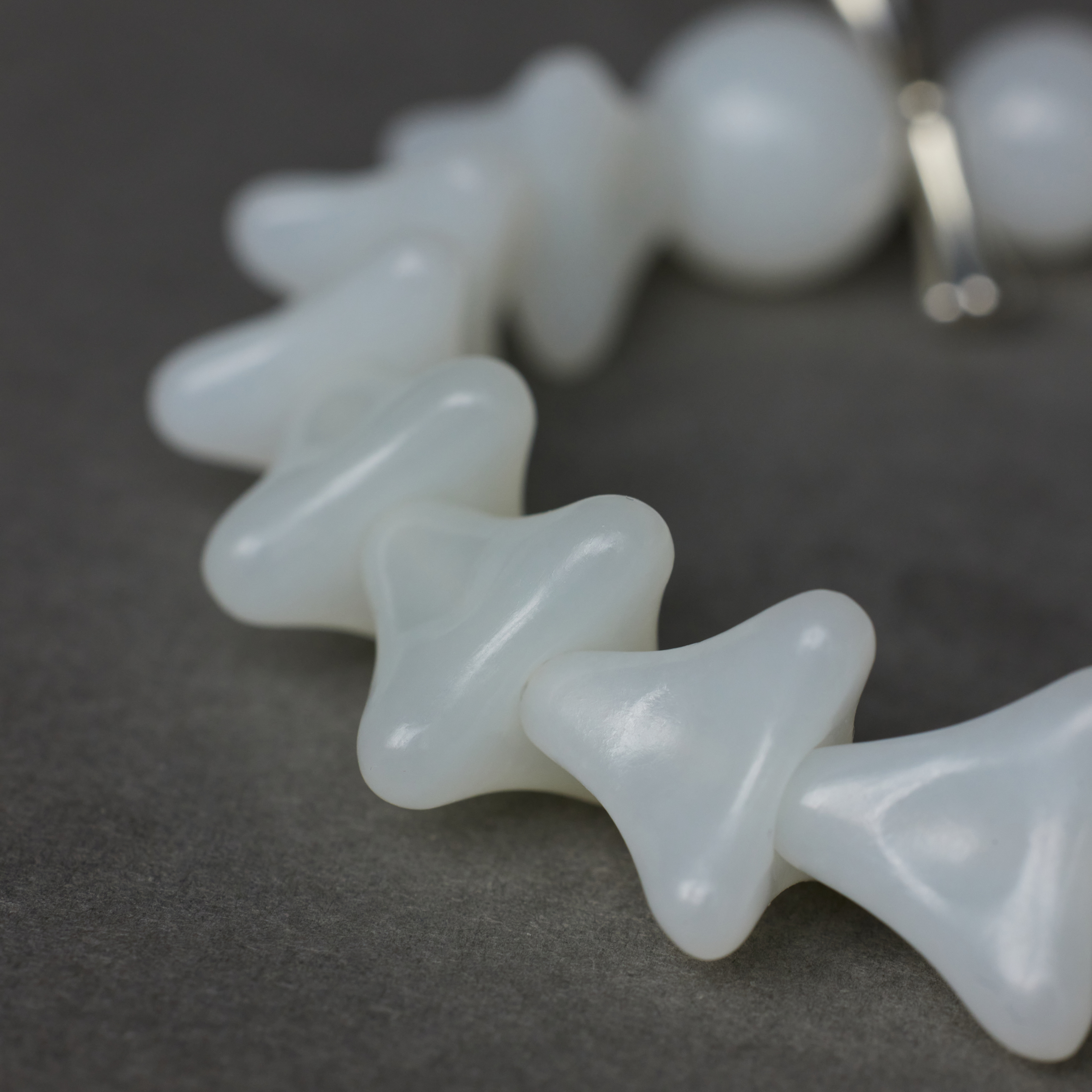 ⻣朵⼉的形,是设计师捏出来的,每颗⼿⼯打磨,温润中带着⻣感。它们⼀颗颗连在⼀起, 让⼈想起远古⽣物的脊椎化⽯,起伏有致,⾃有担当