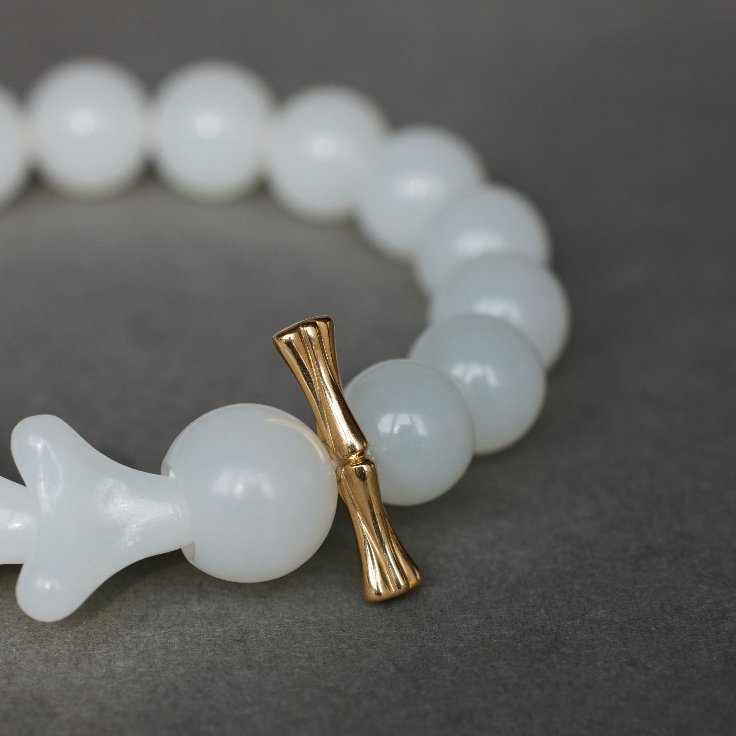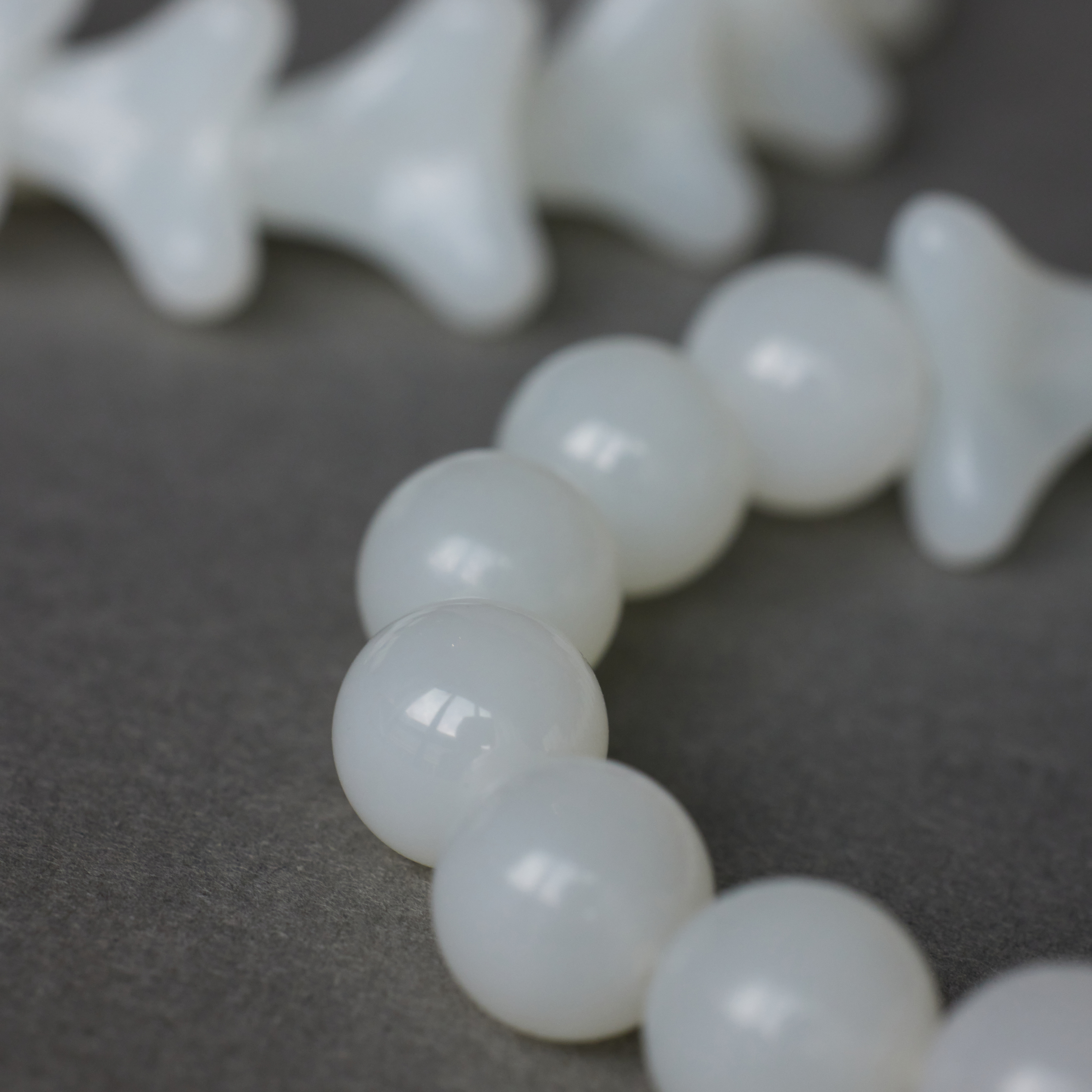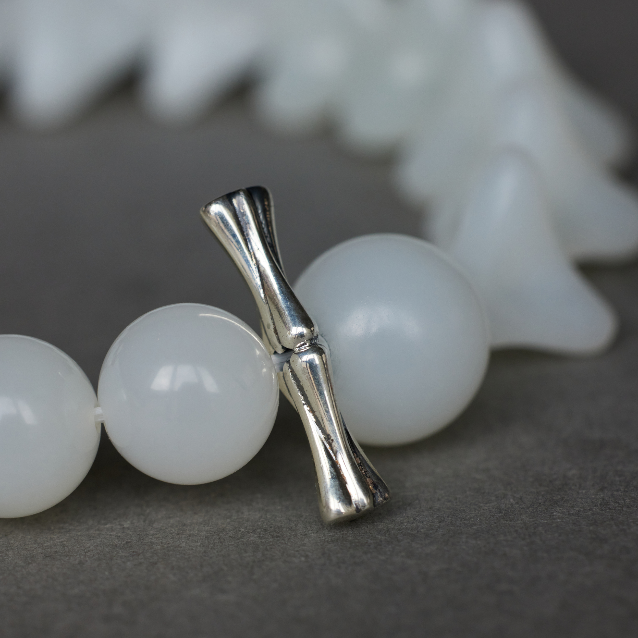 第⼀颗⻣朵⼉接着的那颗圆珠,⽐其它都⼤些,为的是把⻣朵⼉嵌进去。这⼀嵌,不张扬, 却是整串串起来的关键
