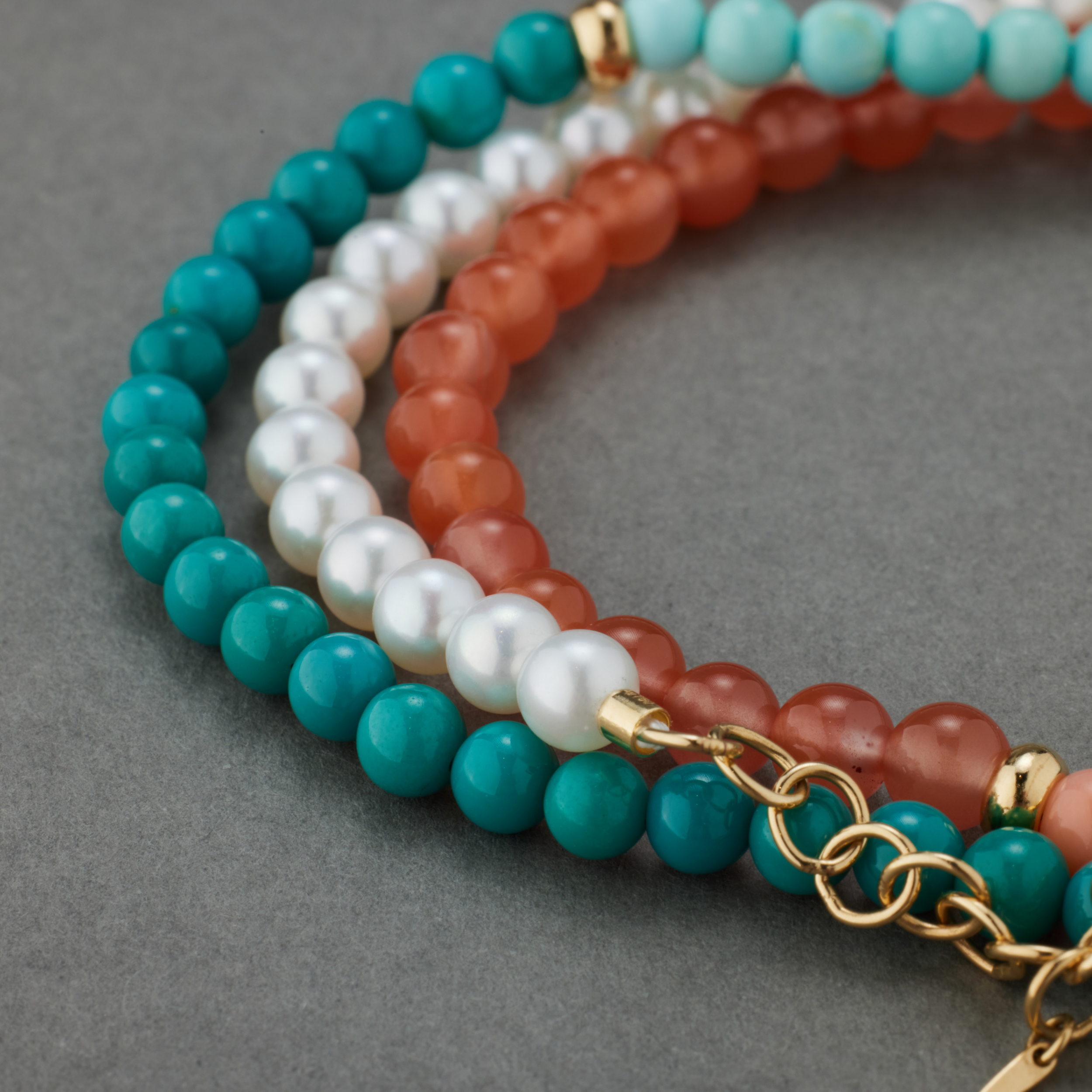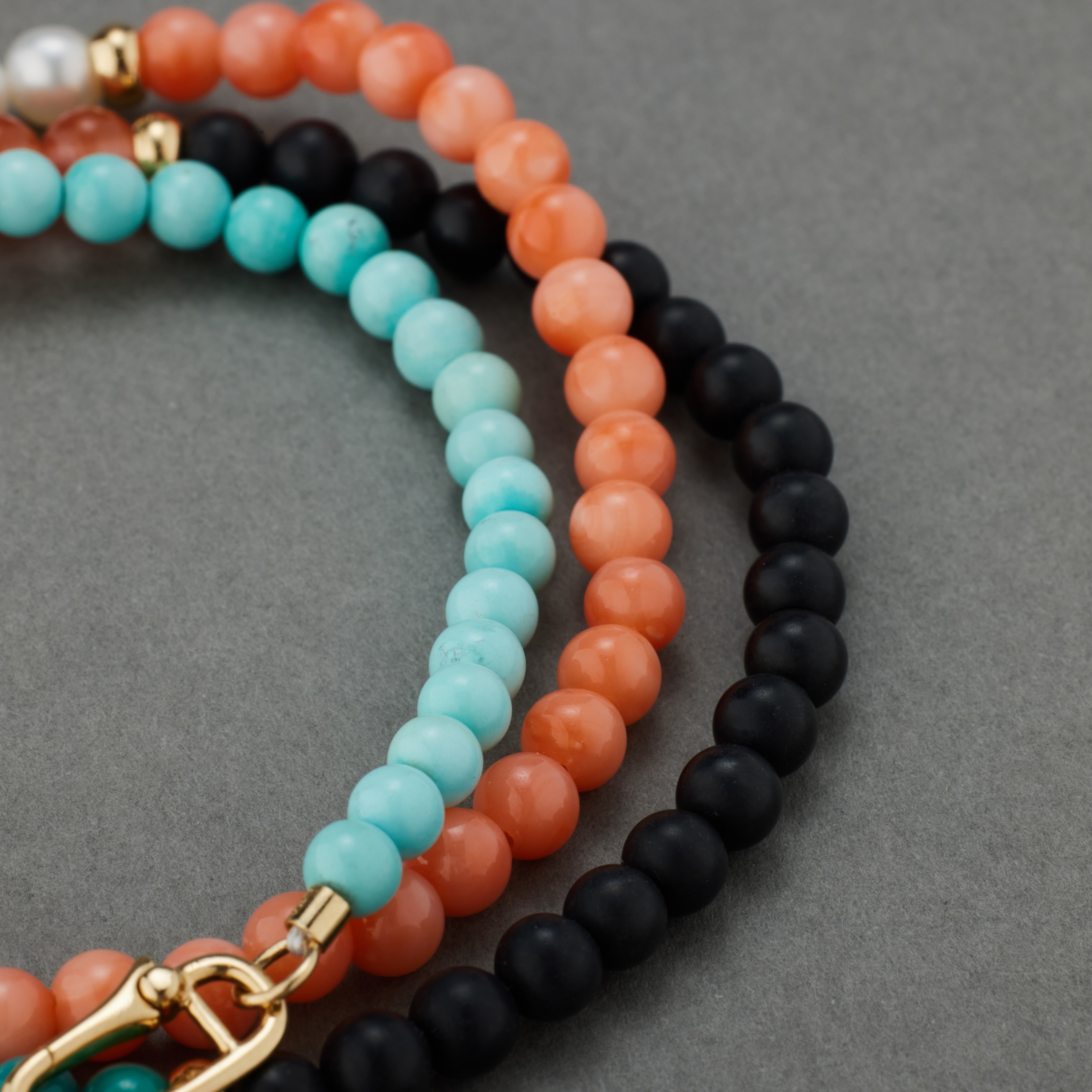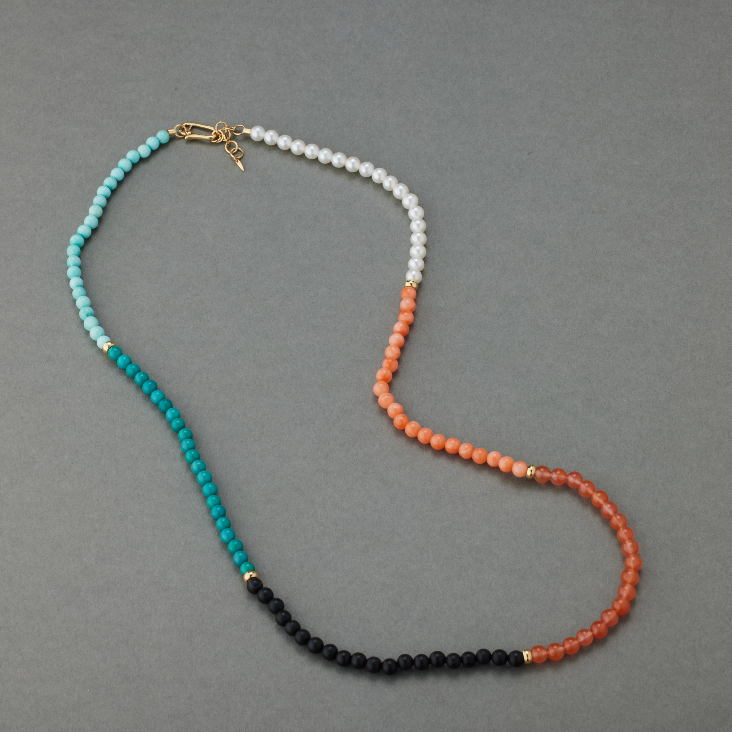 六种珠⼦,分成六段,戴在脖⼦上,哪两段在前,只看当天的⼼情和穿的⾐裳。不想戴在脖⼦上,就绕三圈在腕上,这份别致,轻松,却不常⻅