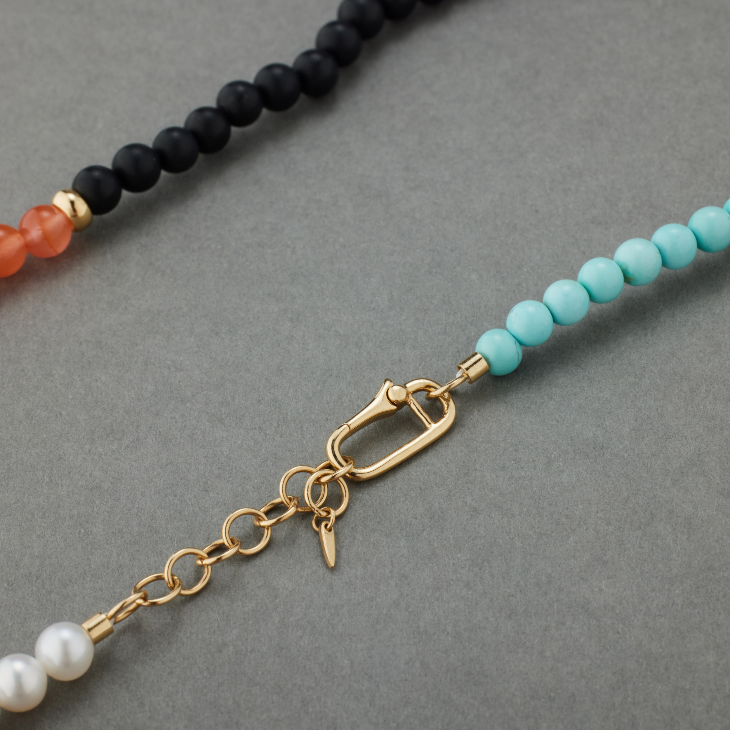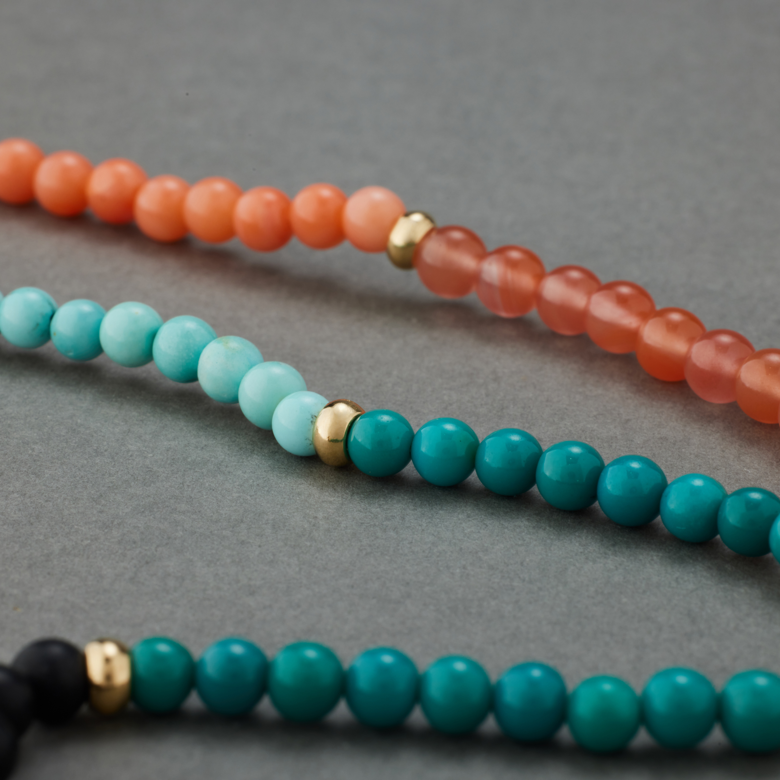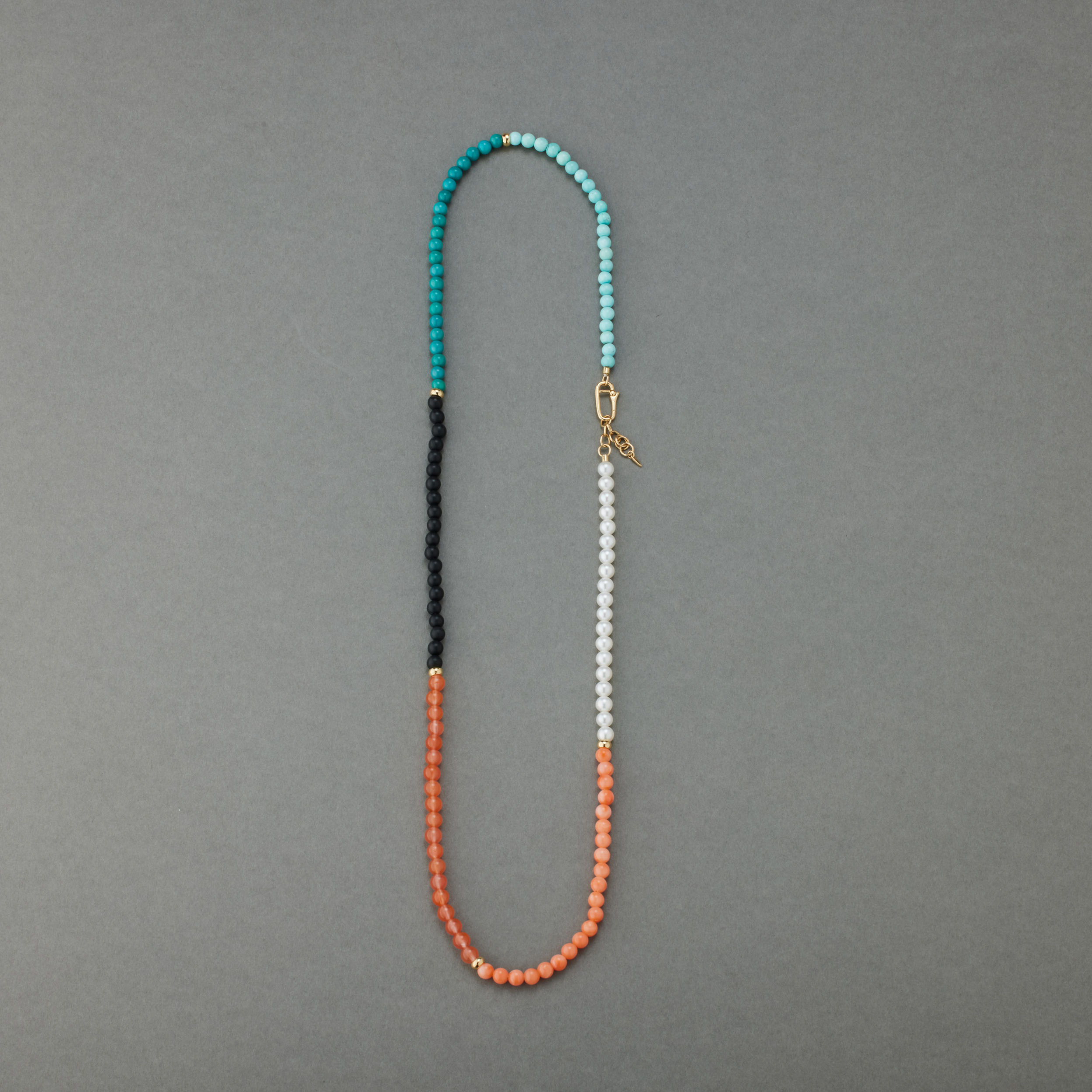 六种珠⼦,分成六段,戴在脖⼦上,哪两段在前,只看当天的⼼情和穿的⾐裳。不想戴在脖⼦上,就绕三圈在腕上,这份别致,轻松,却不常⻅