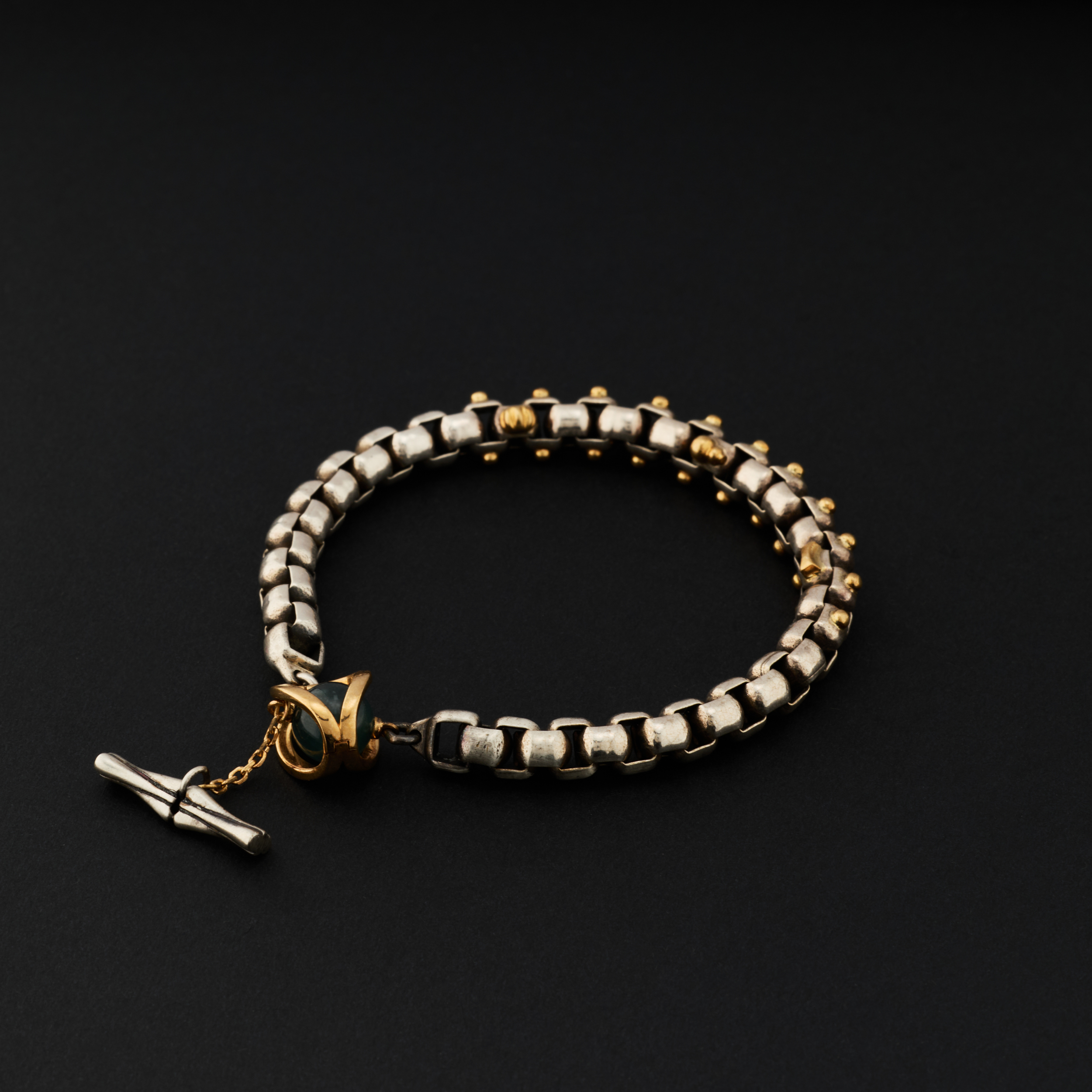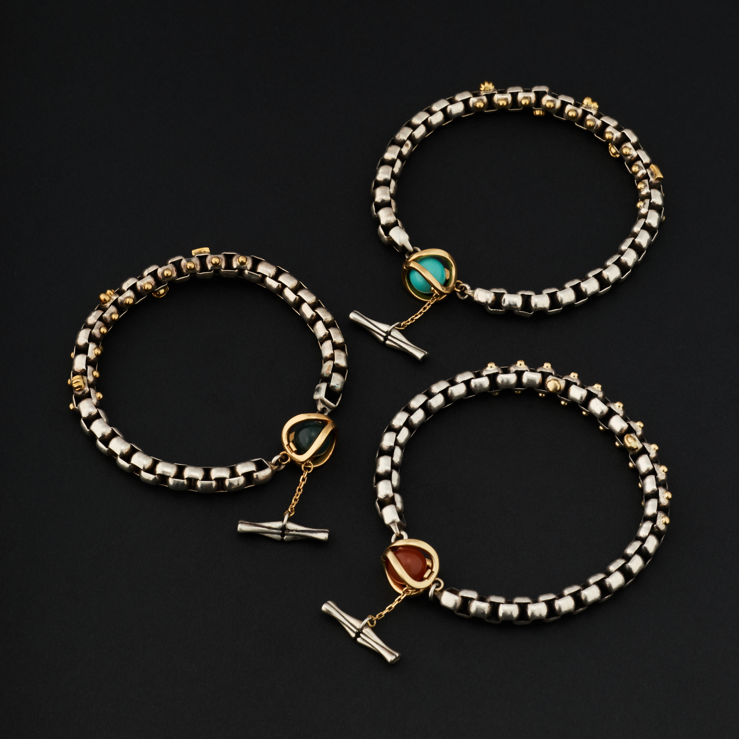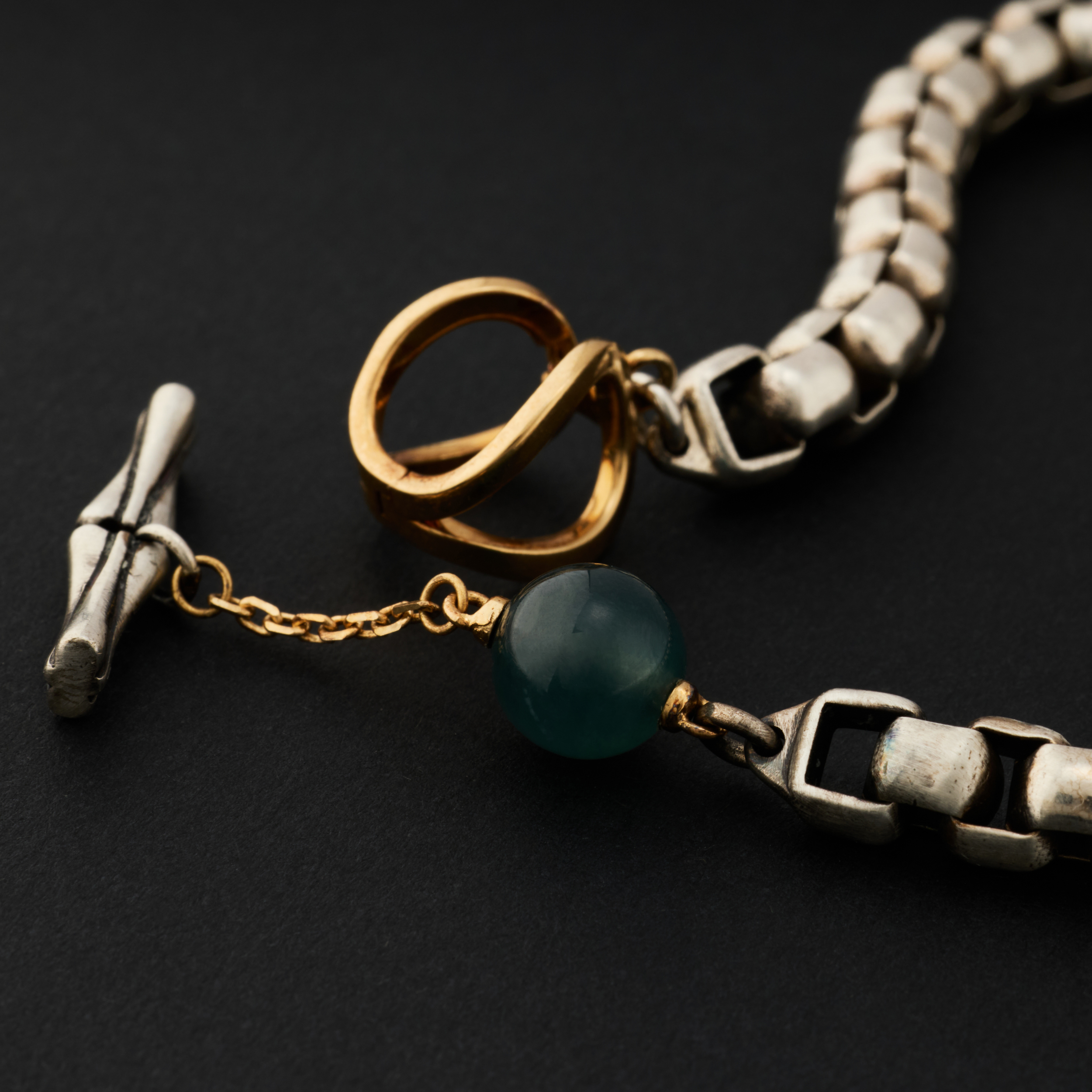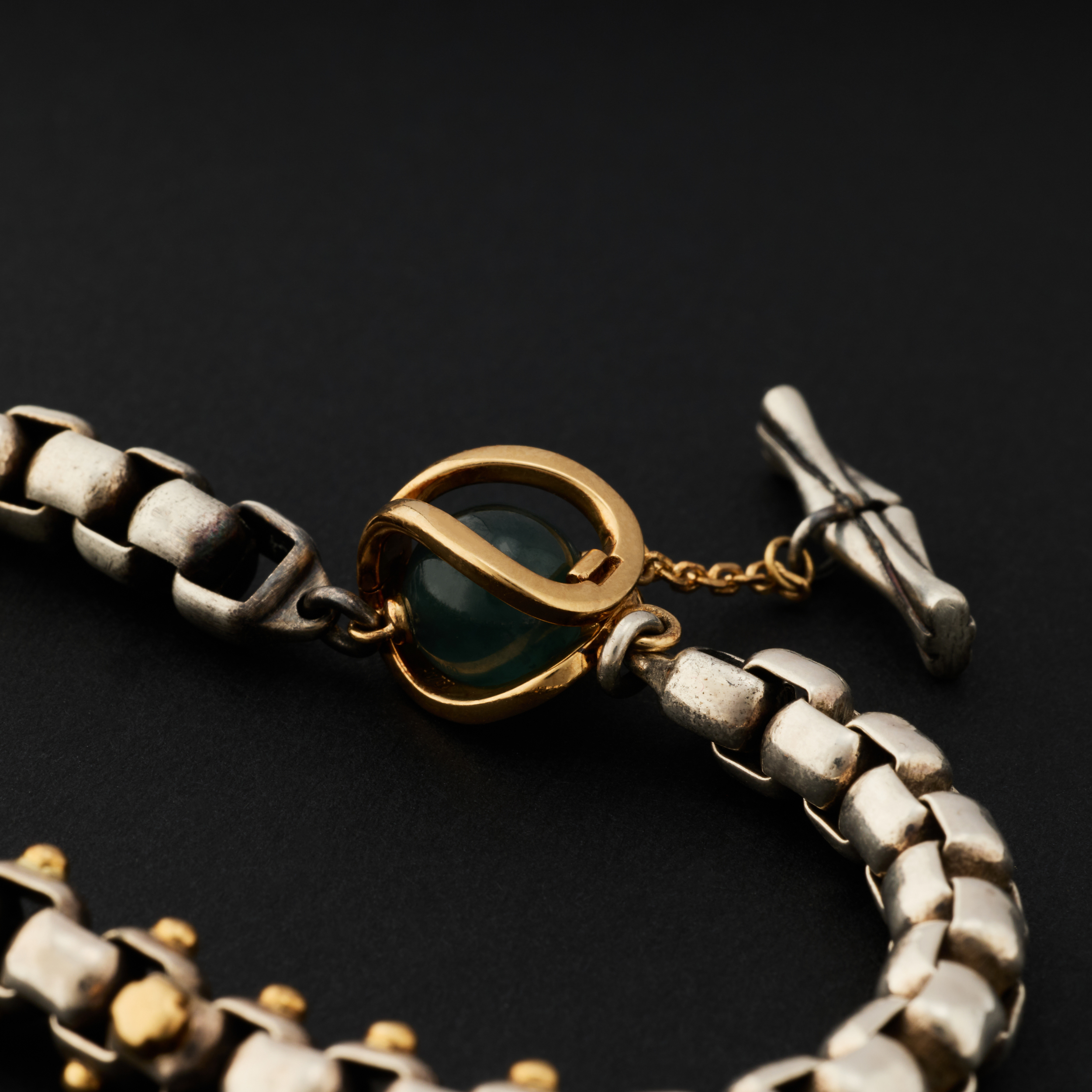 银,是骨;金,是意。链子尾,笼一颗珠子。绿松,翡翠或南红,像一颗颗握在手心的小光