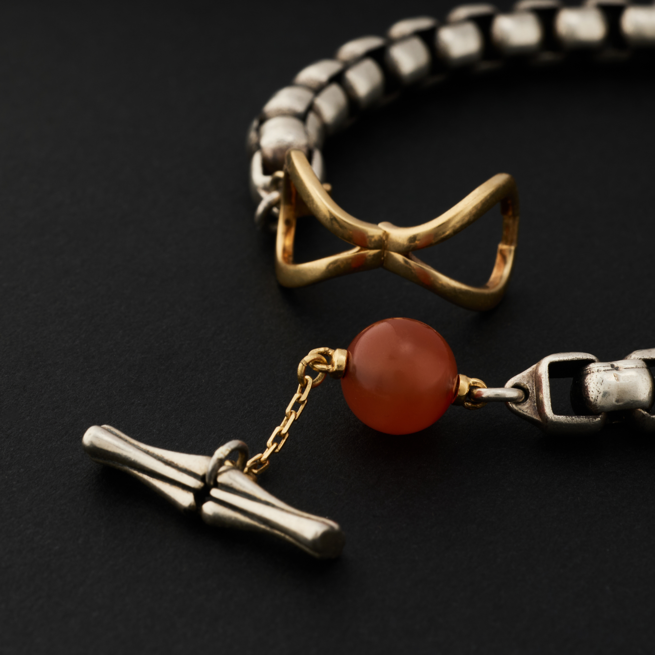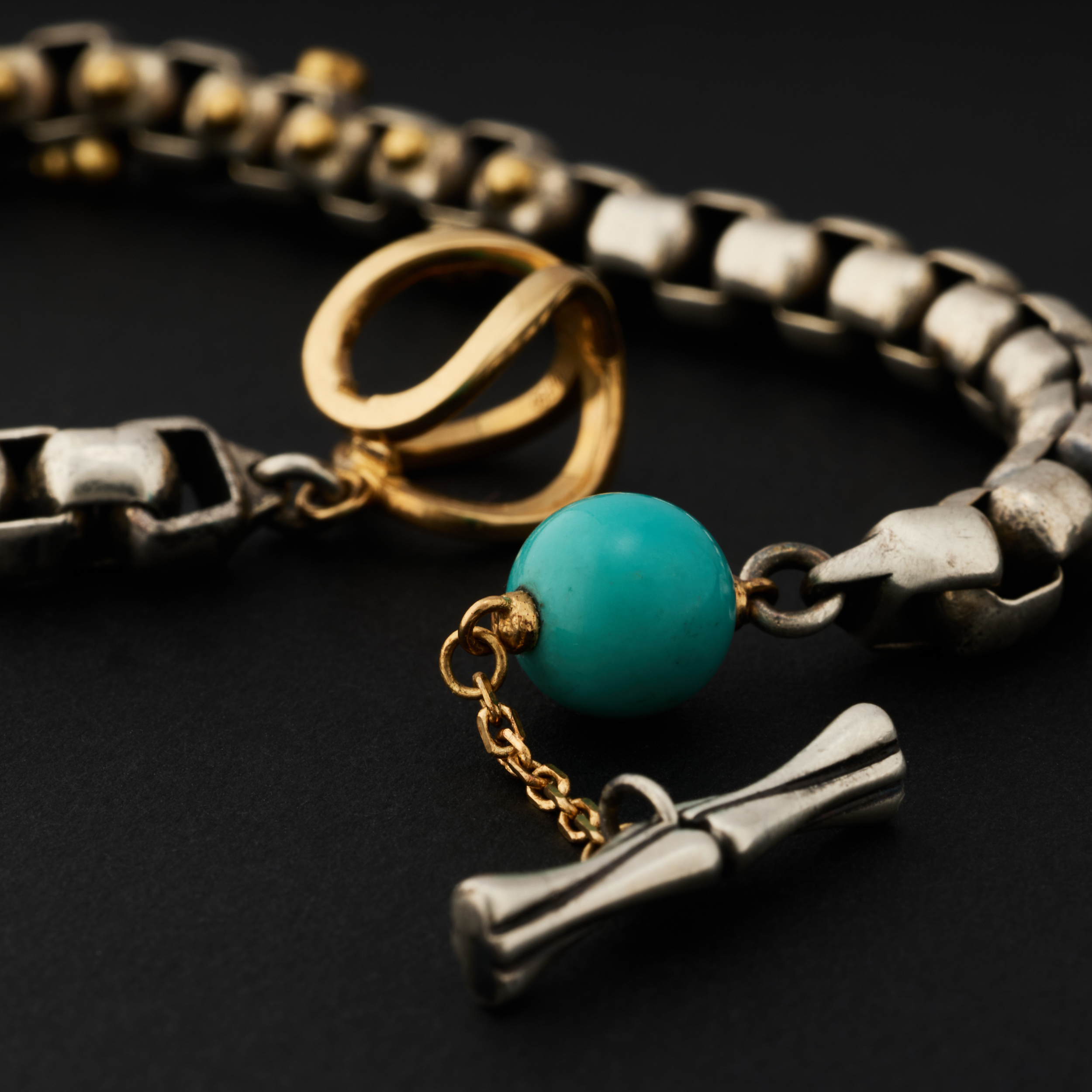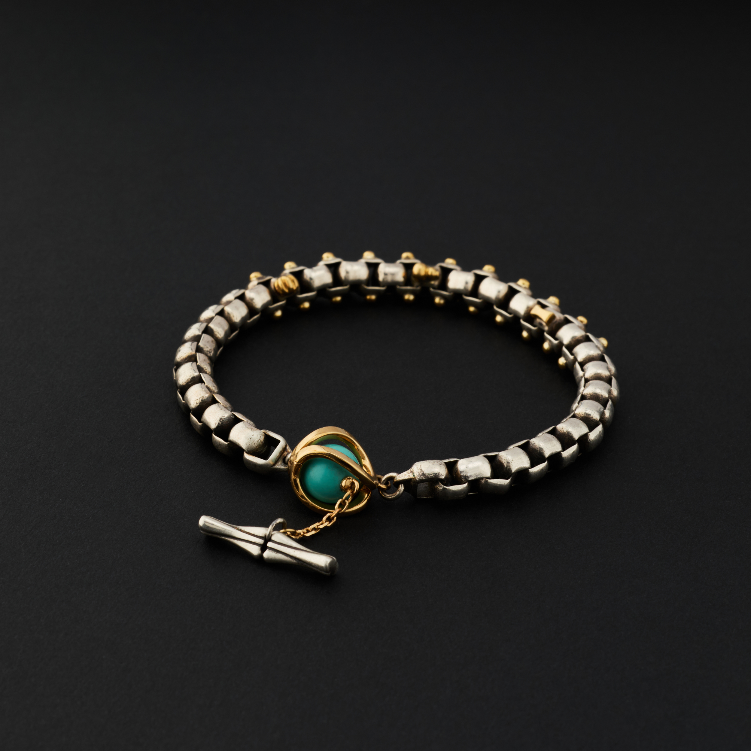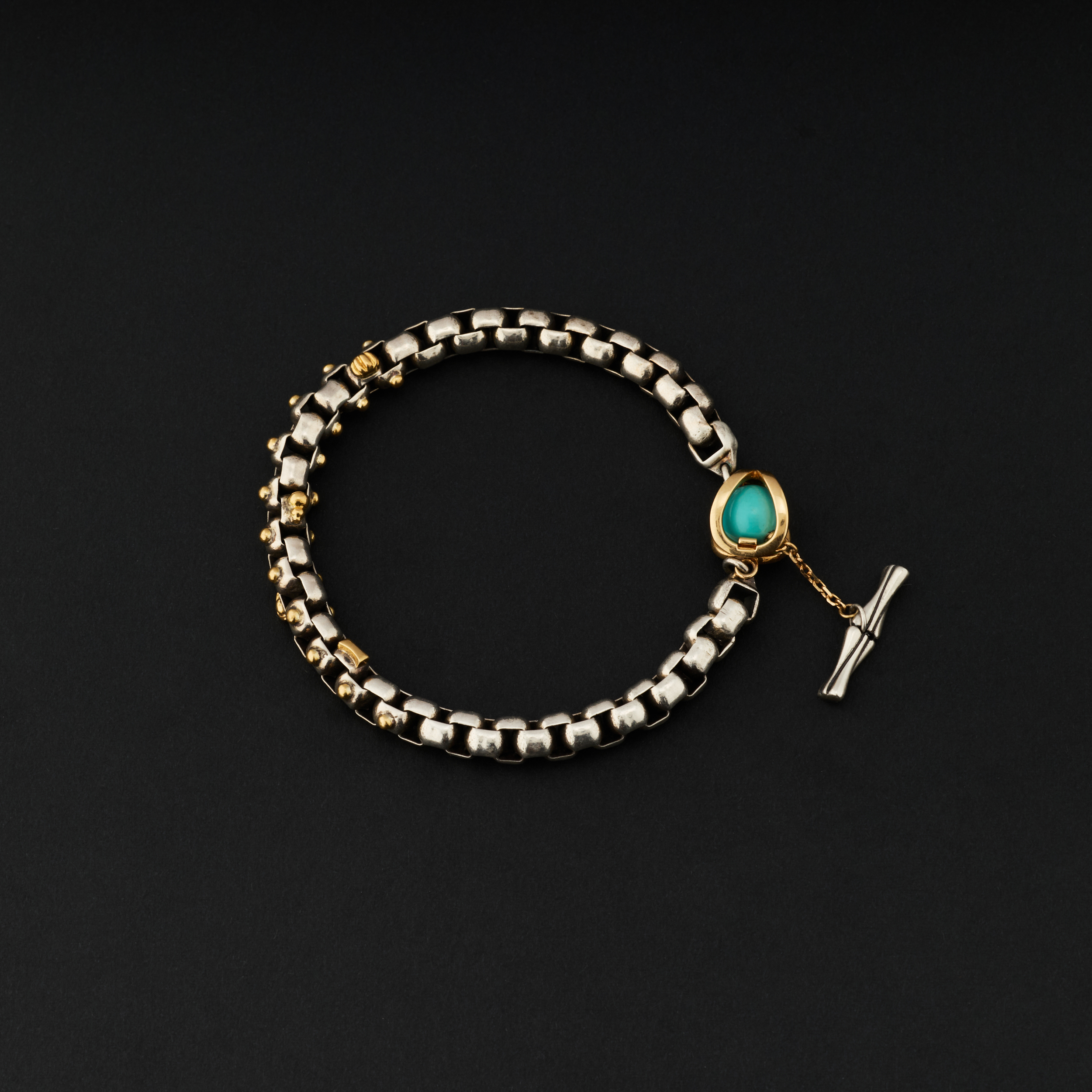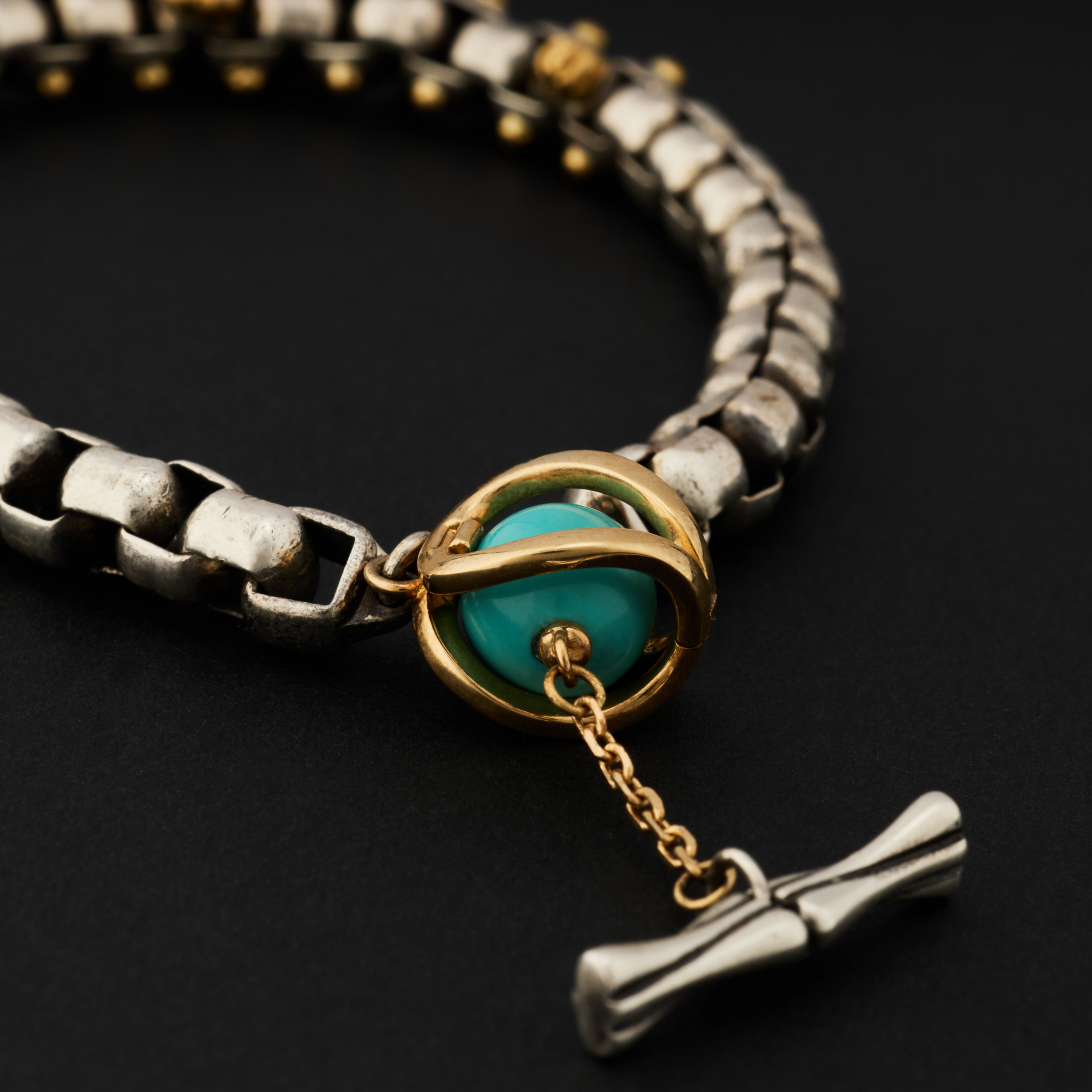 银,是骨;金,是意。链子尾,笼一颗珠子。绿松,翡翠或南红,像一颗颗握在手心的小光