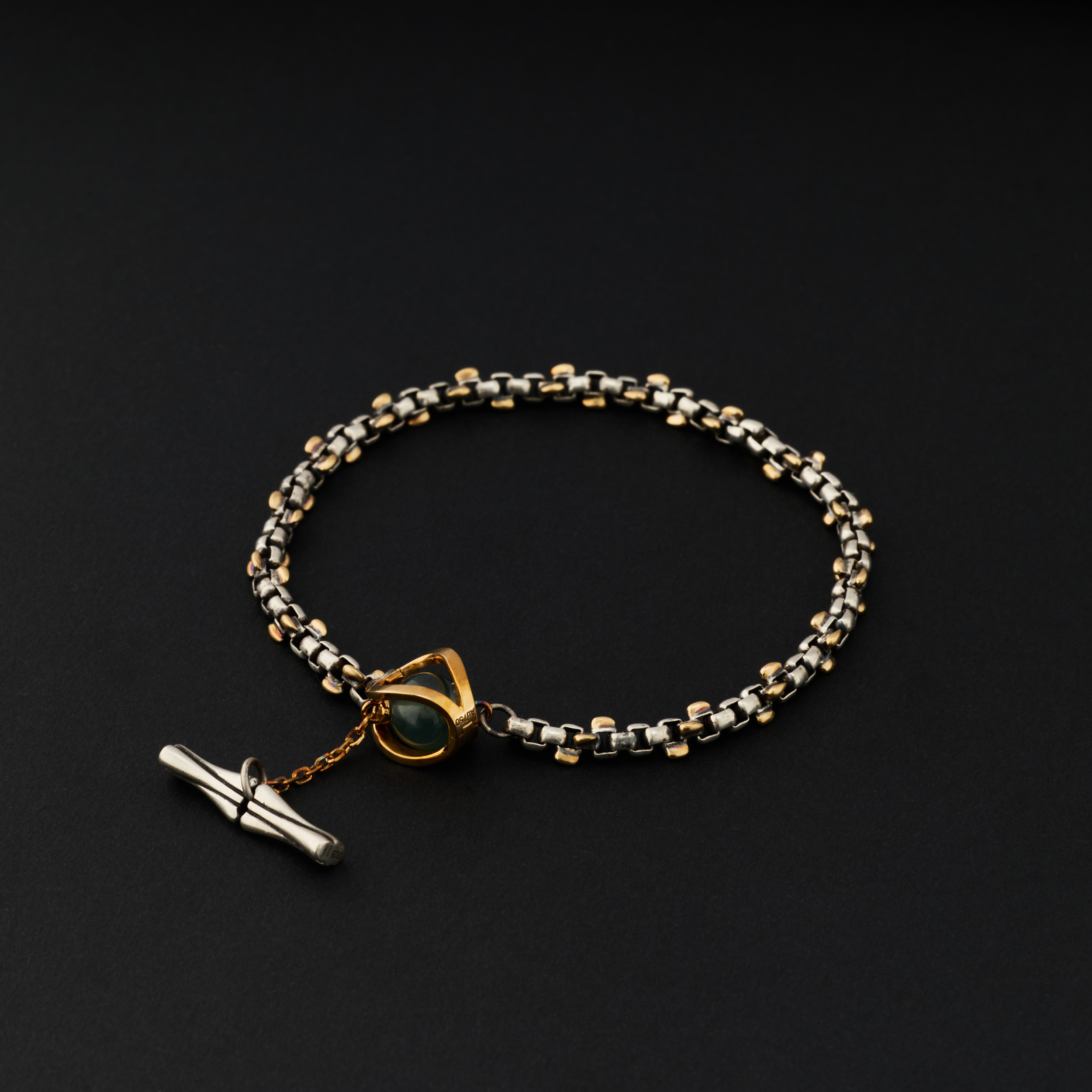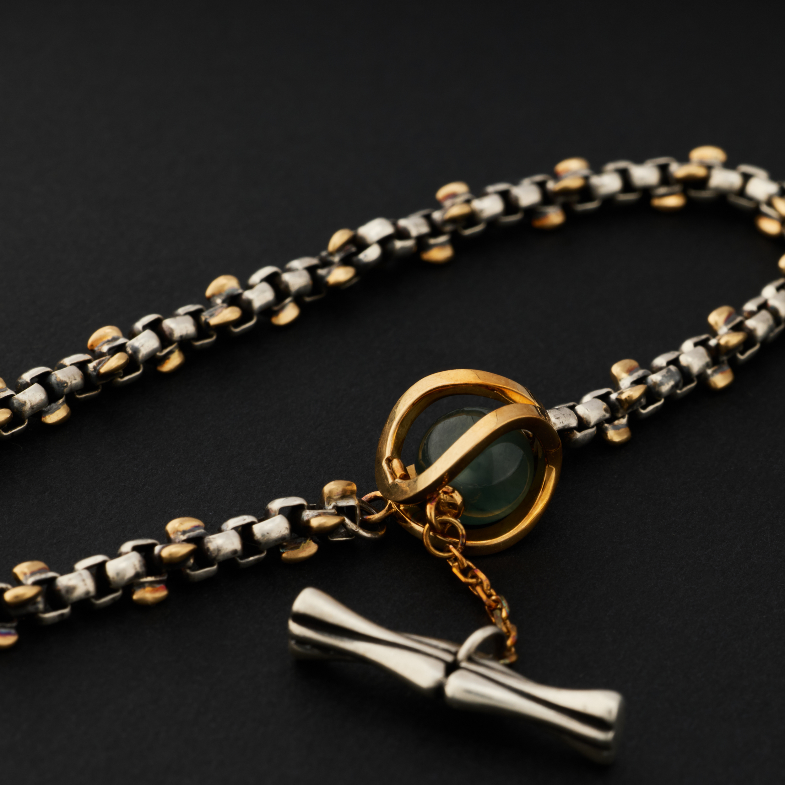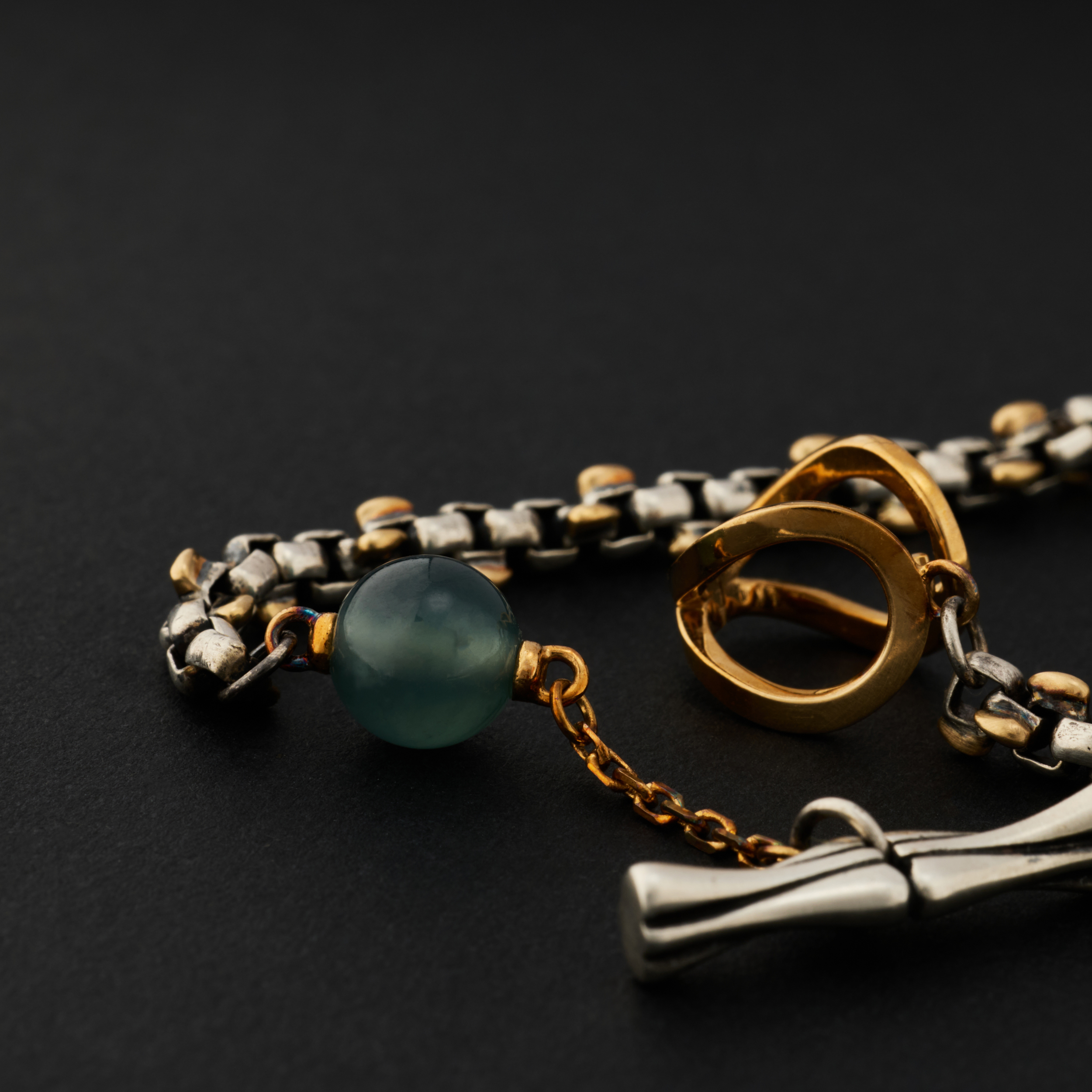 银,是骨;金,是意。链子尾,笼一颗珠子。绿松,翡翠或南红,像一颗颗握在手心的小光