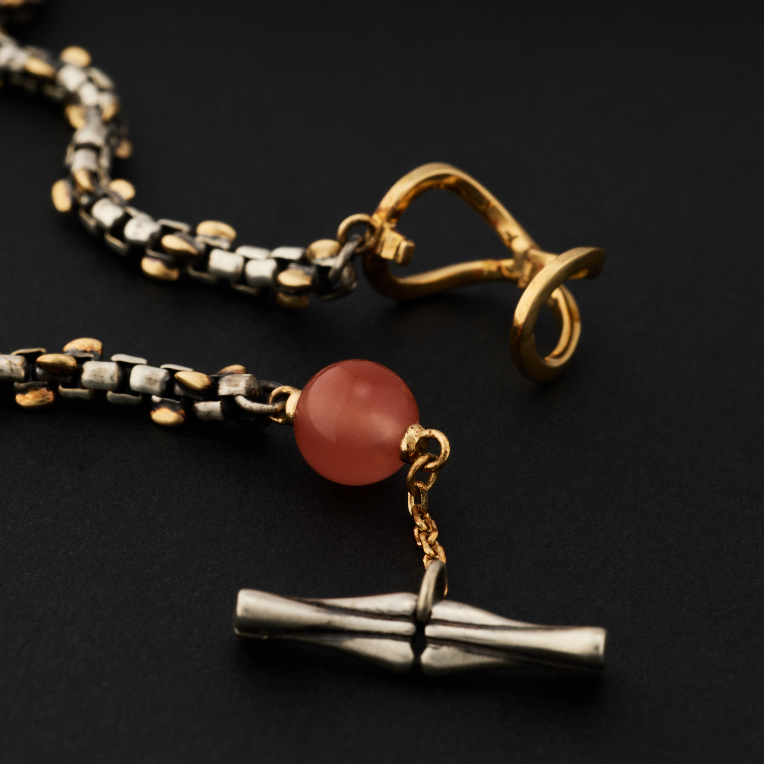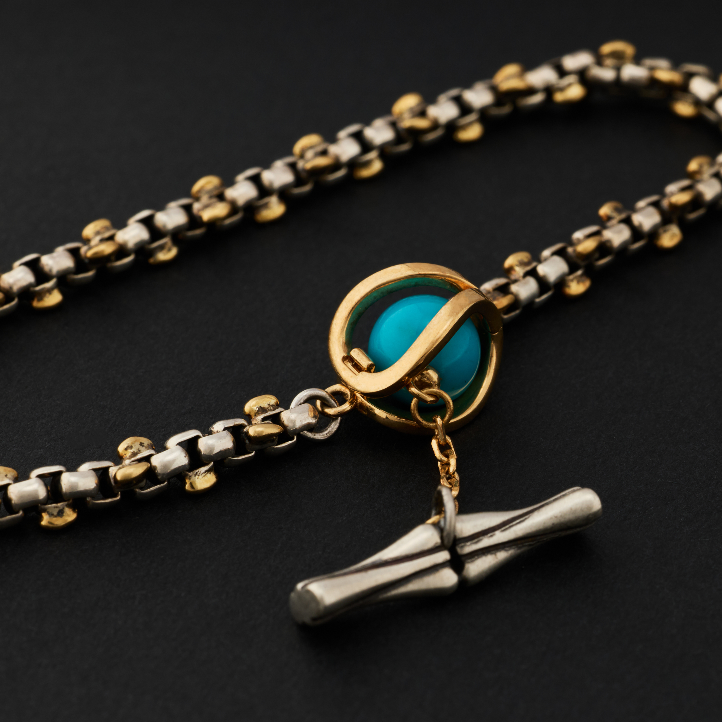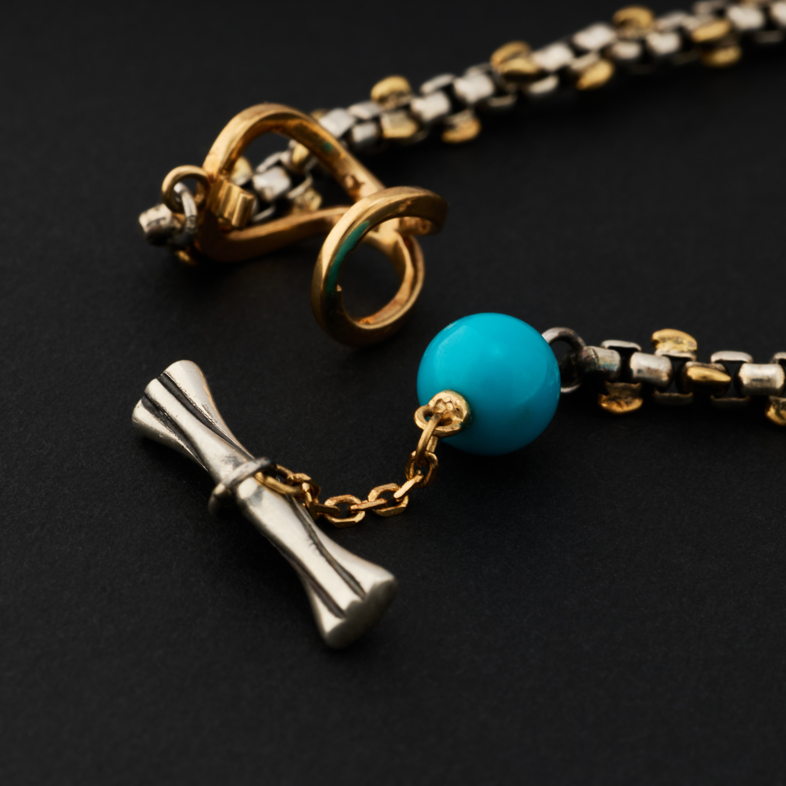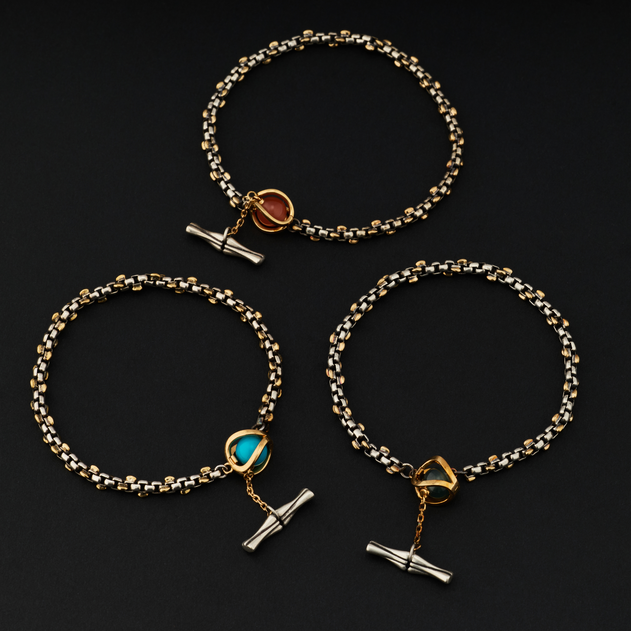 银,是骨;金,是意。链子尾,笼一颗珠子。绿松,翡翠或南红,像一颗颗握在手心的小光