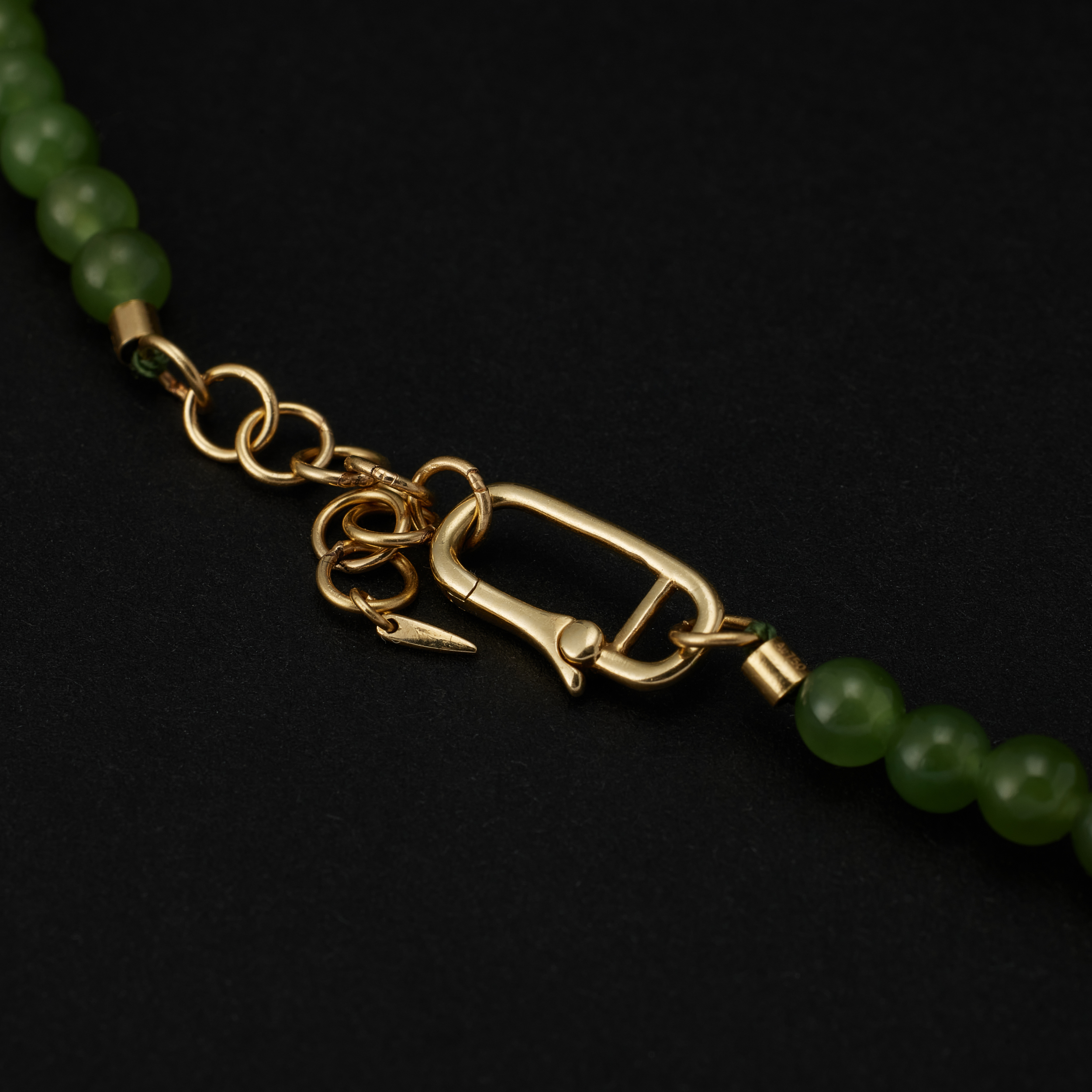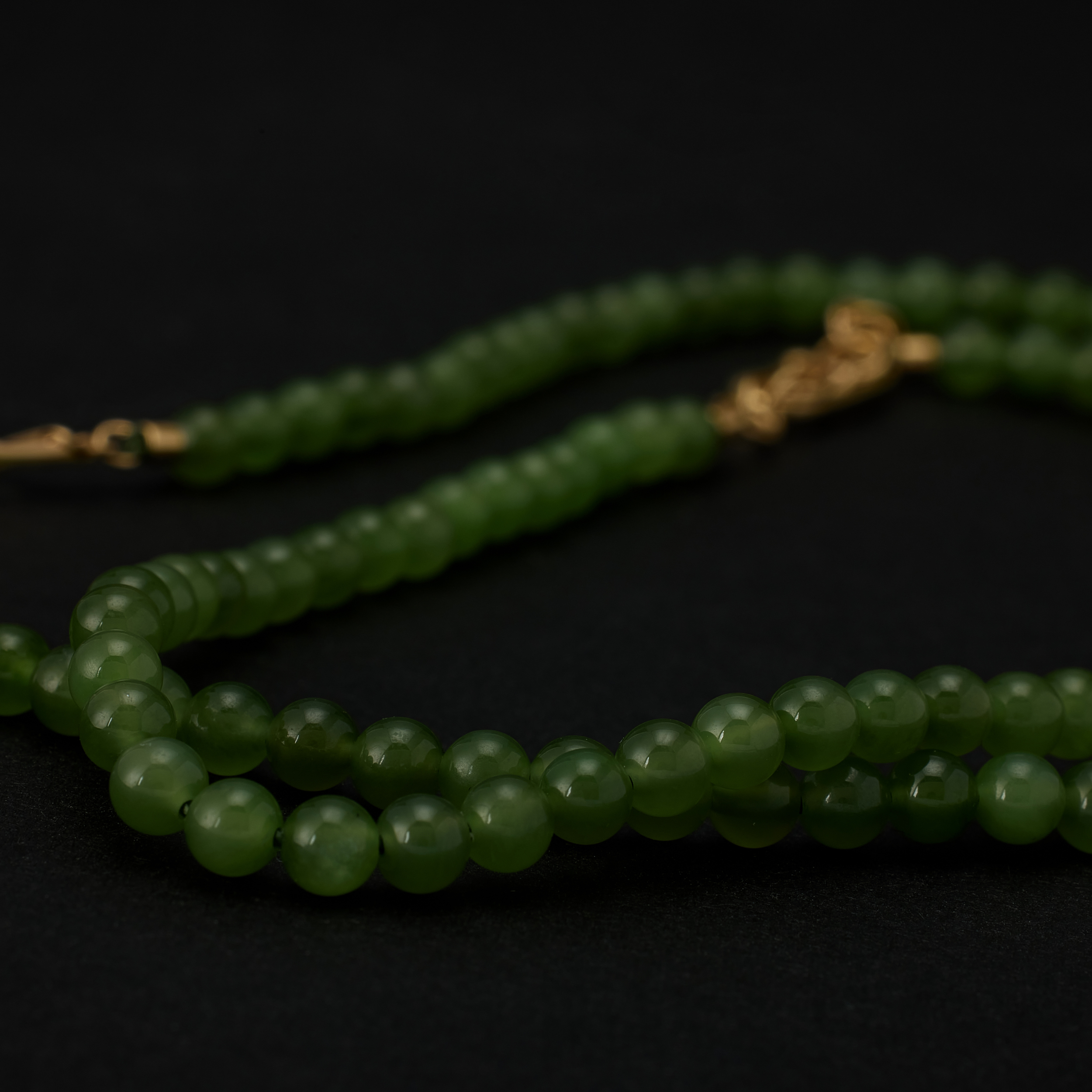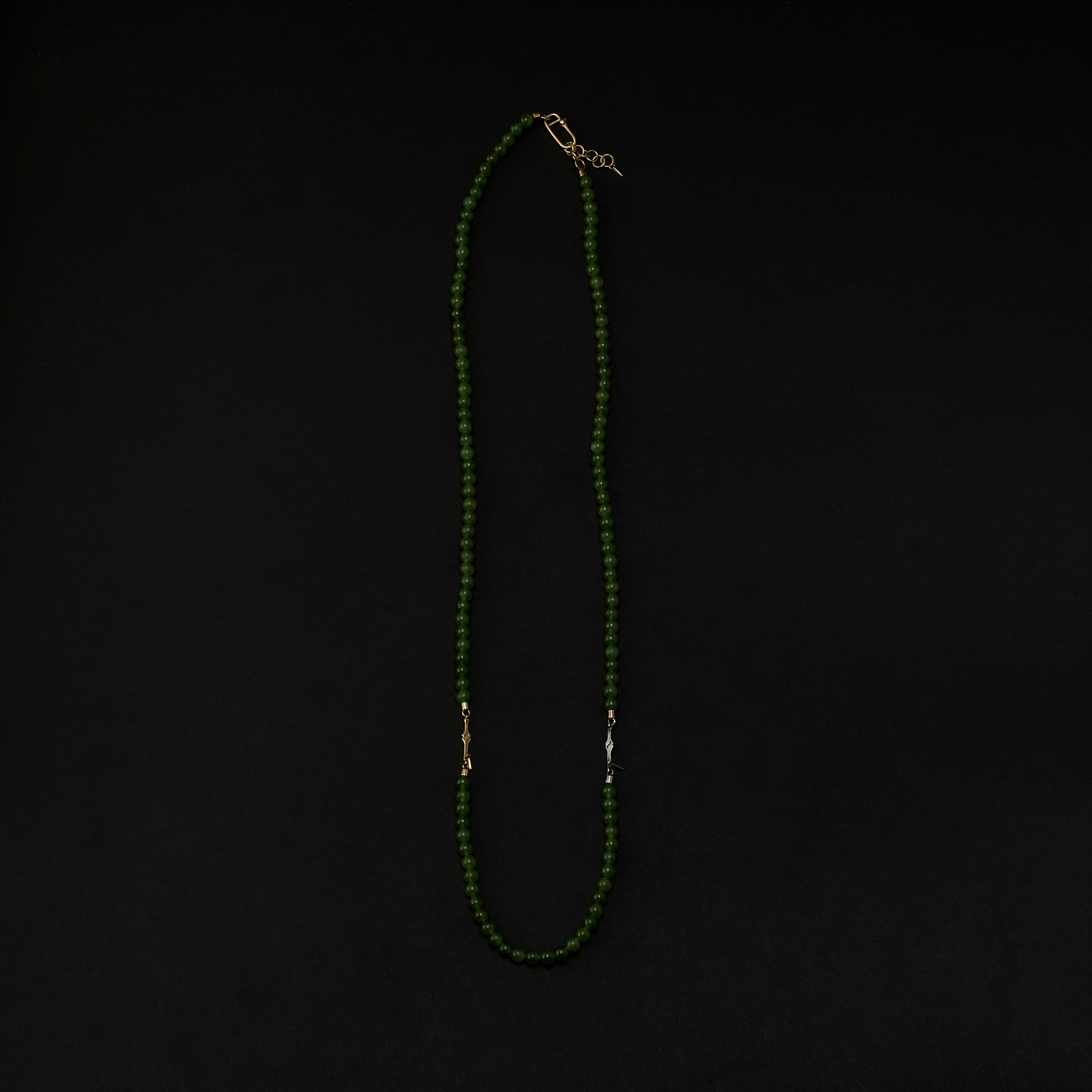 南红和碧⽟的珠链,当中都镶了两个⻣节,⼀⾦⼀银,搭着南红的热,或是碧⽟的清,冷暖有个照应