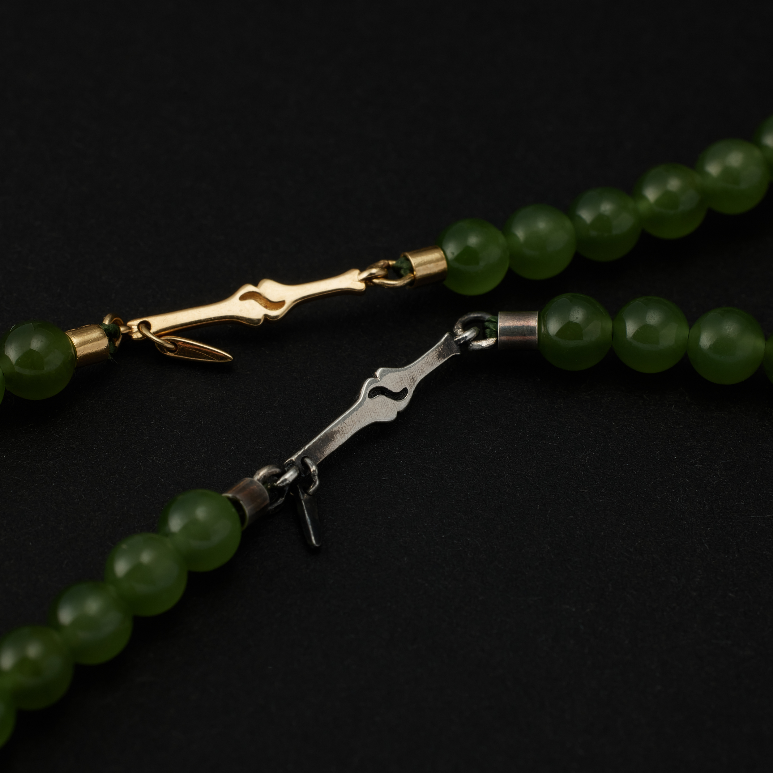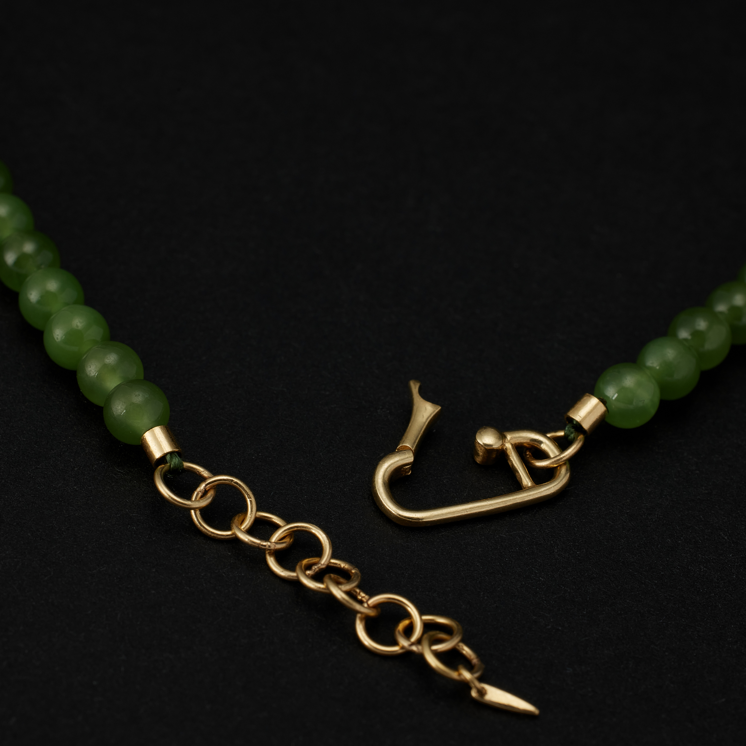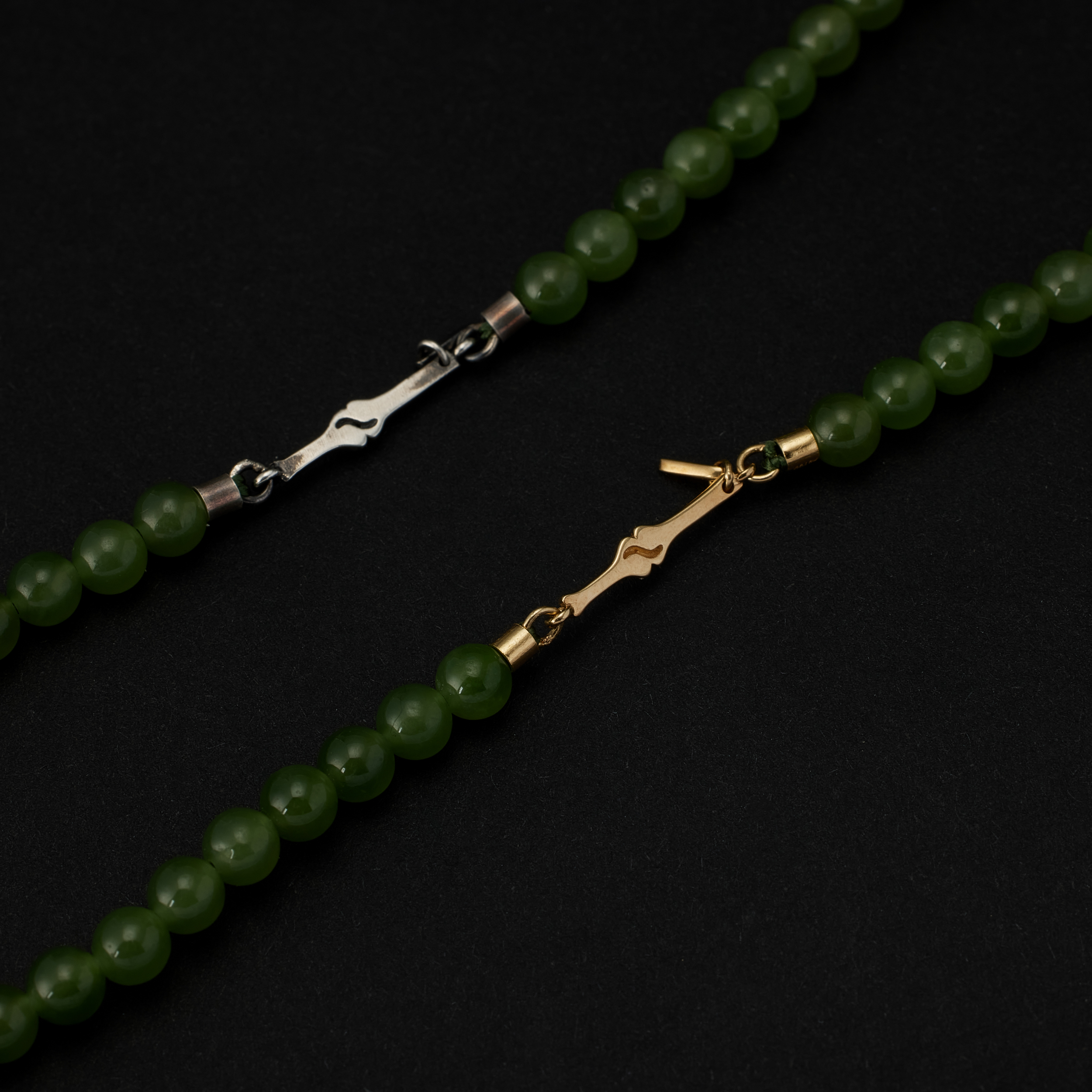 南红和碧⽟的珠链,当中都镶了两个⻣节,⼀⾦⼀银,搭着南红的热,或是碧⽟的清,冷暖有个照应