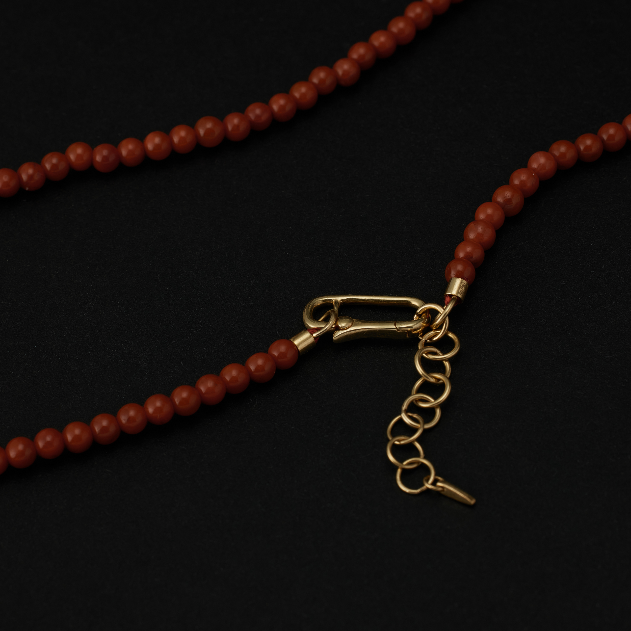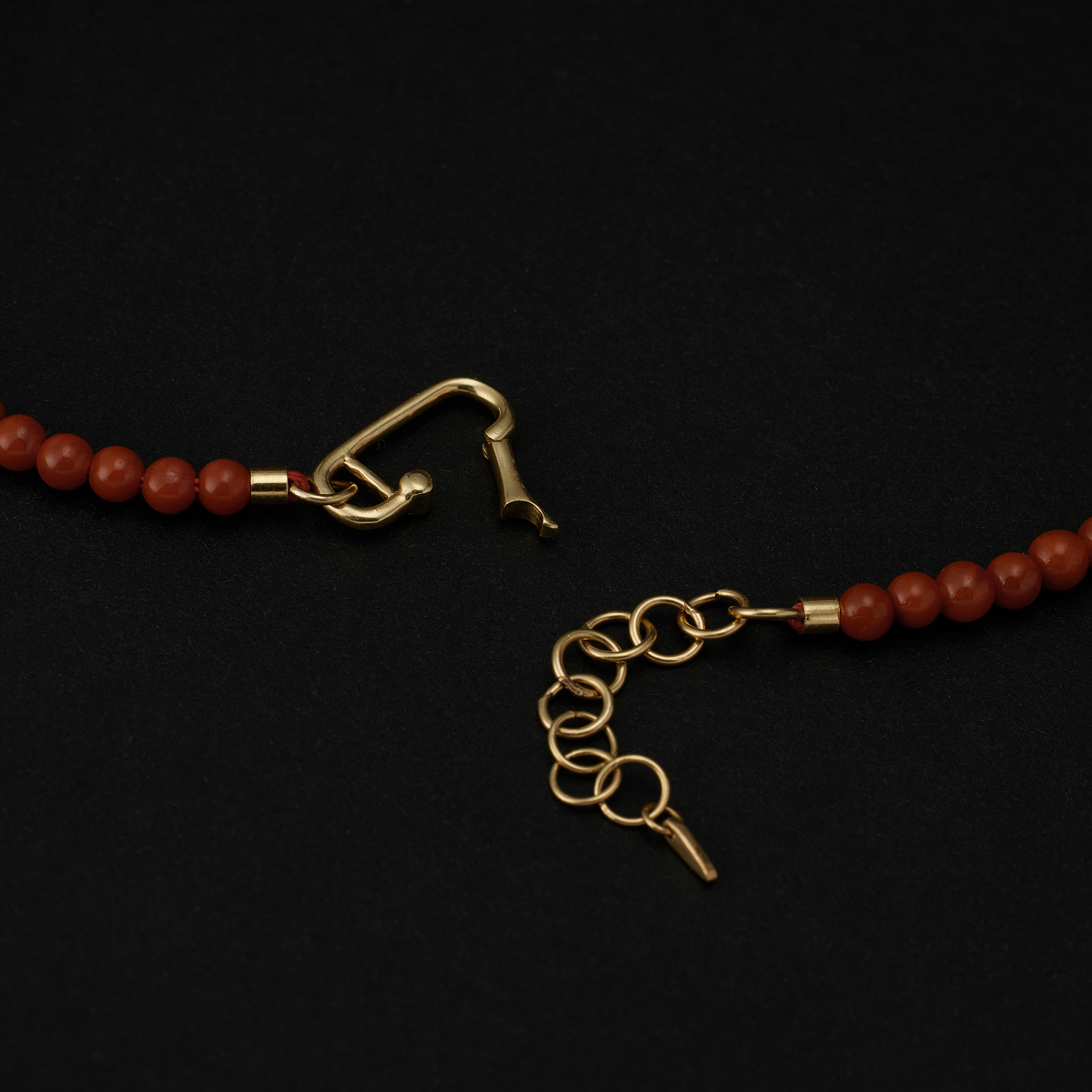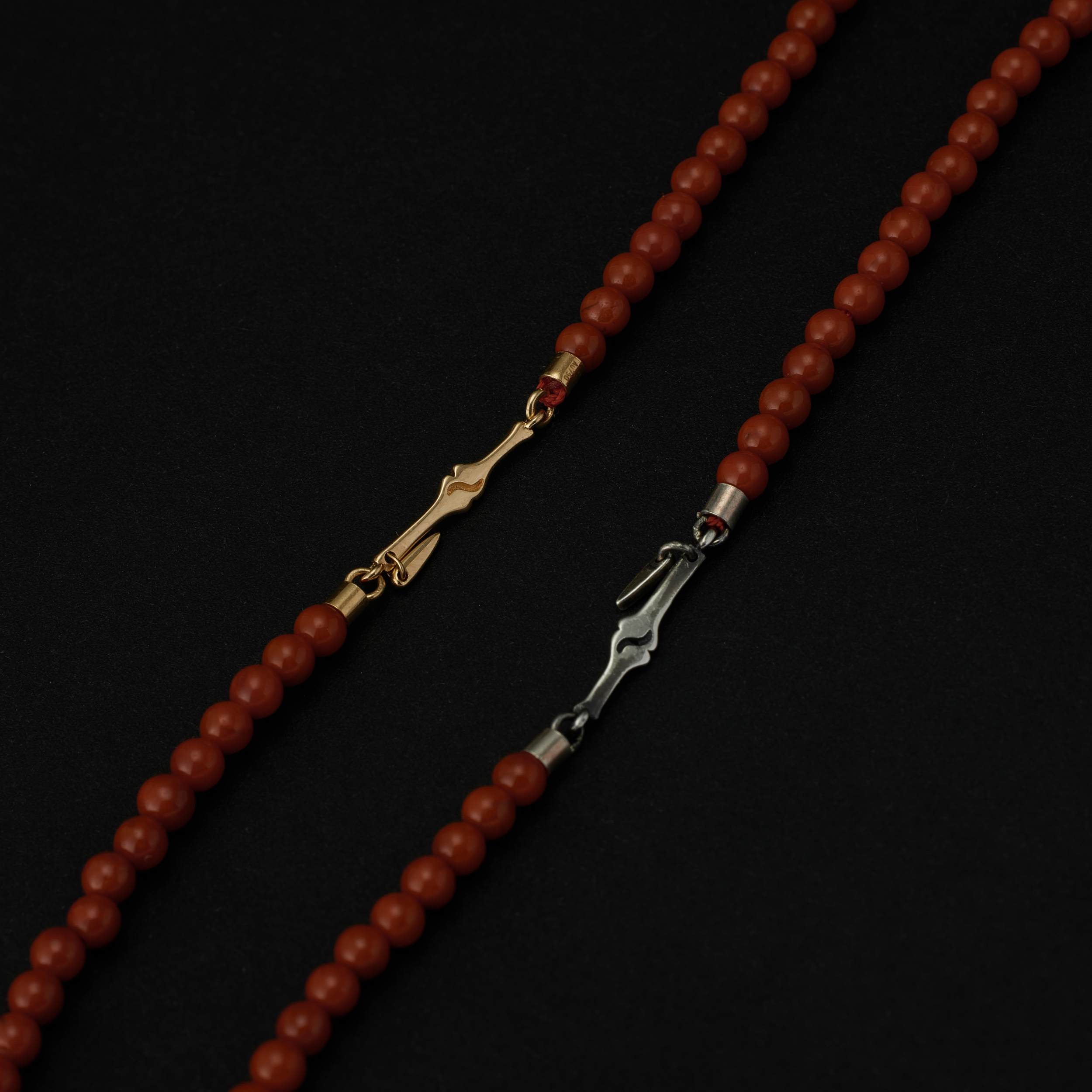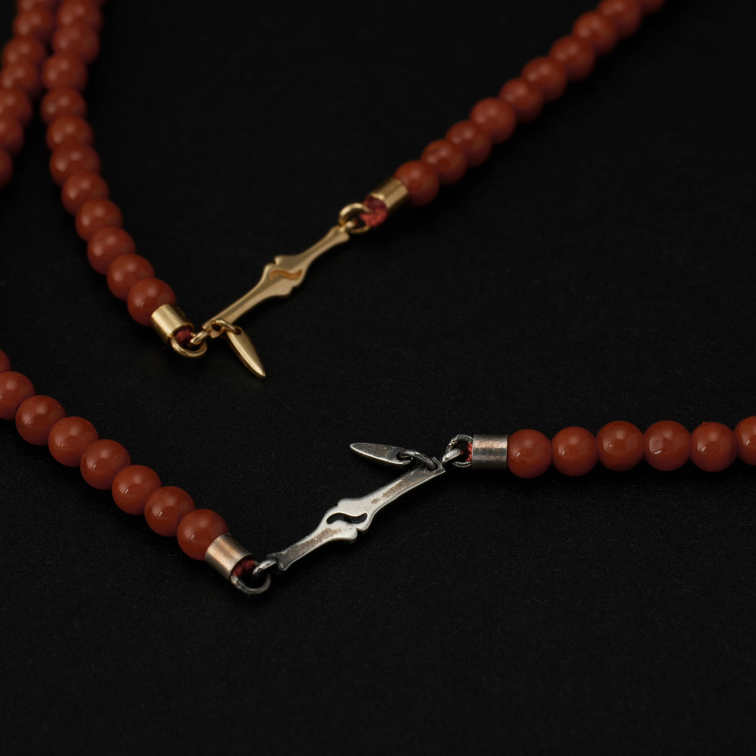 南红和碧⽟的珠链,当中都镶了两个⻣节,⼀⾦⼀银,搭着南红的热,或是碧⽟的清,冷暖有个照应
